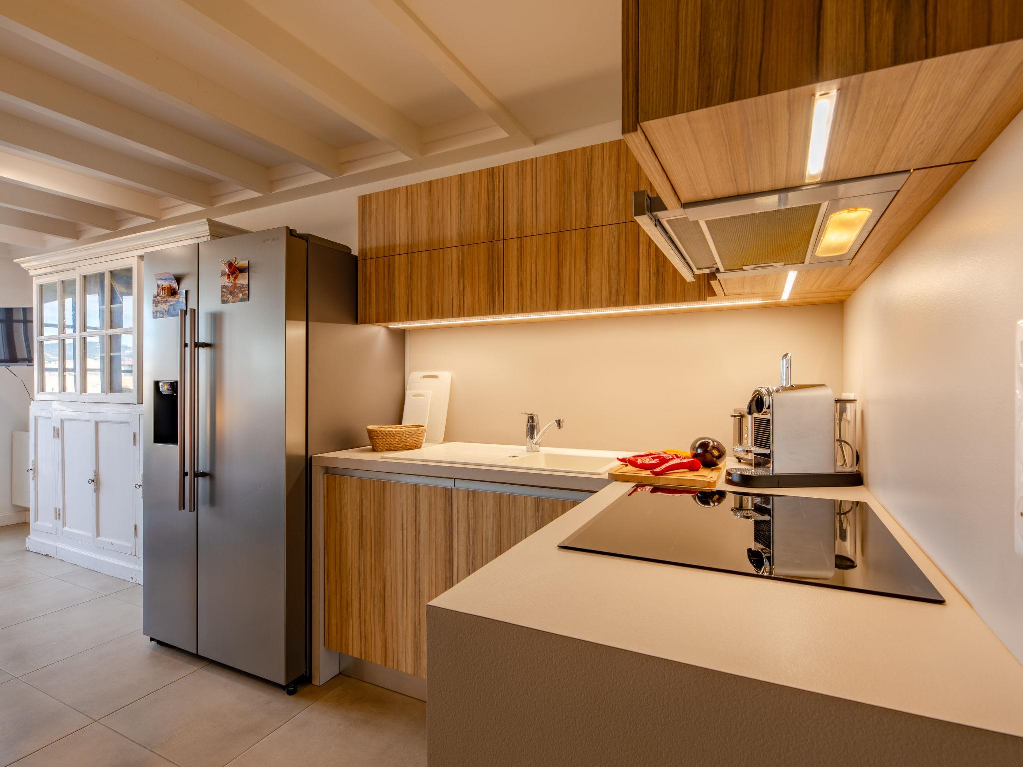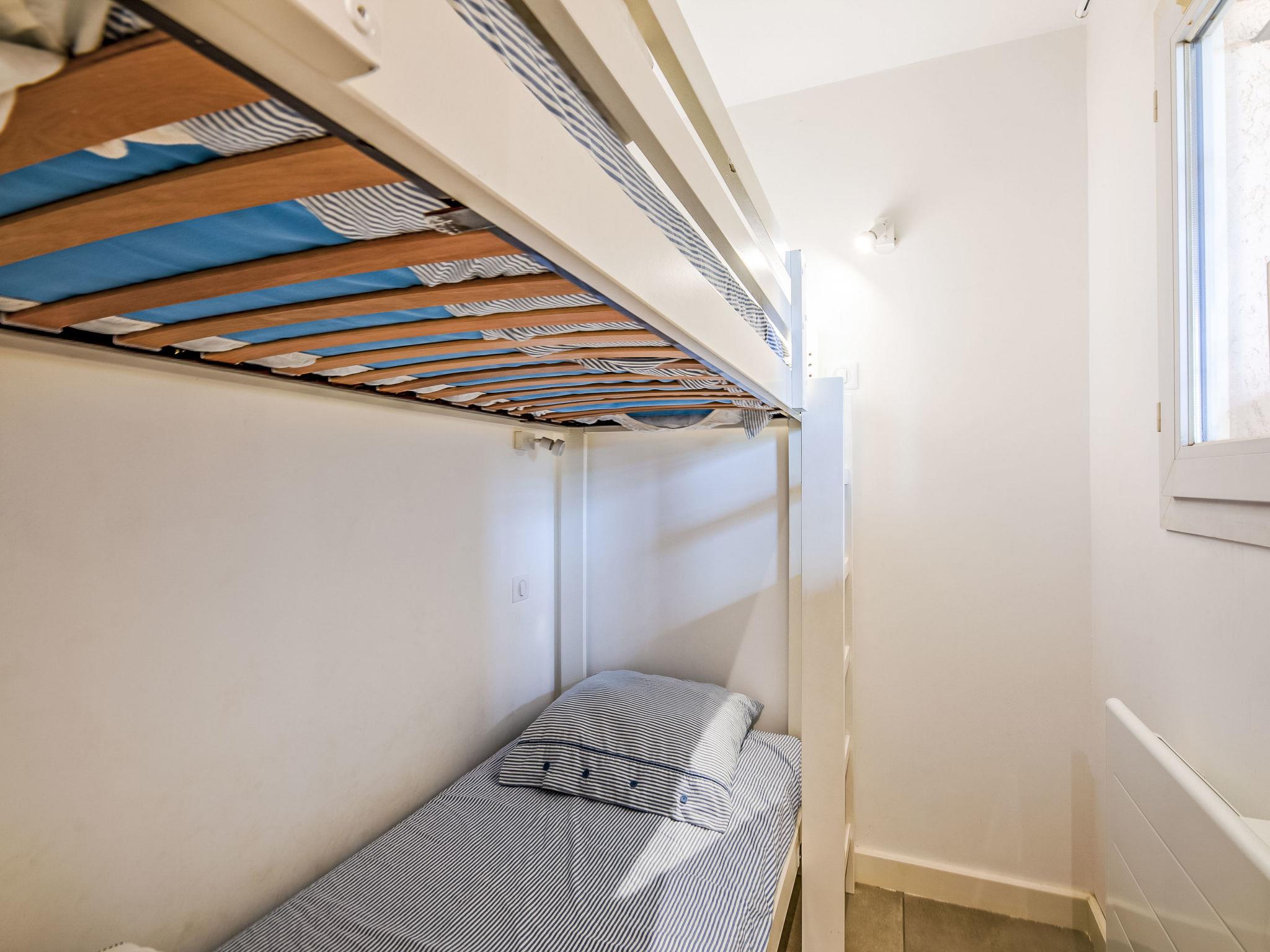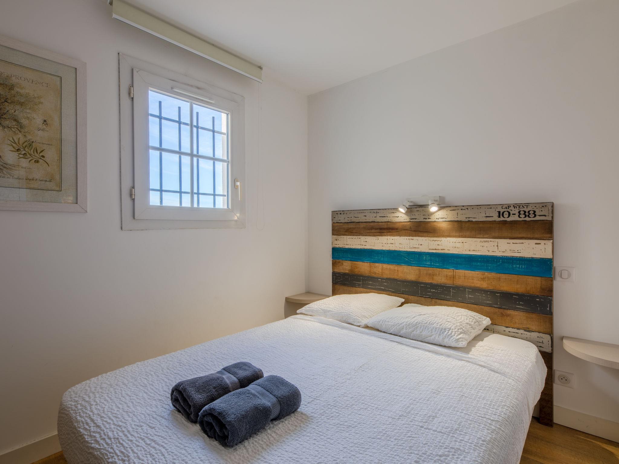 4-room apartment 52 m2 on 4th floor. Living/dining room with TV (flat screen), air conditioning. Exit to the terrace. 1 small room with 1 x 2 bunk beds (80 cm, length 190 cm). Kitchenette (oven, dishwasher, 4 induction hot plates, toaster, kettle, microwave, freezer, electric coffee machine). Shower, sep. WC. Upper floor: 1 room with 1 french bed (140 cm, length 190 cm). 1 room with sloping ceilings with 1 french bed (140 cm, length 190 cm), air conditioning. Shower/WC. Electric heating, air-conditioning. Terrace 6 m2 partly roofed. Terrace furniture. View of the sea. Facilities: Internet (WiFi, free). Parking (1 car). Please note: non-smokers only. Smoke alarm. Offer by a private individual according to Art. 155, IV of CGI. 83065000965OW