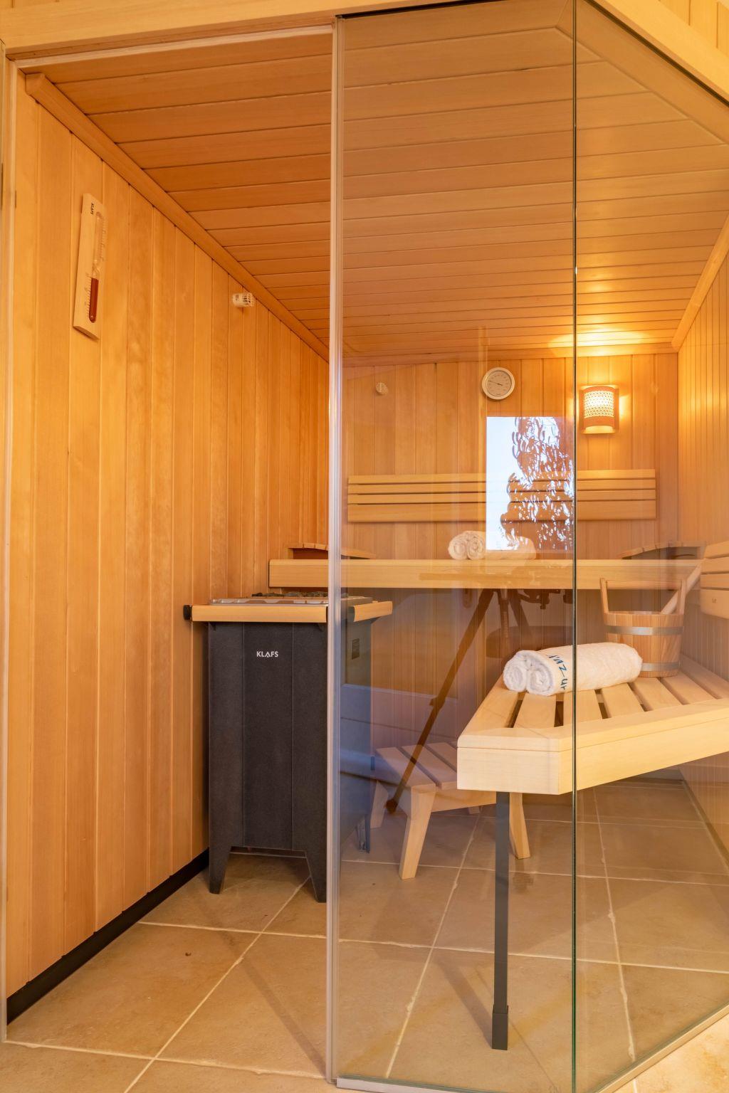 The villa has a heated swimming pool, terraces and garden with garden furniture, outdoor dining table for 8 people, sun loungers and a dry sauna located next to the swimming pool.Other amenities: Private parking for two cars, outside lights