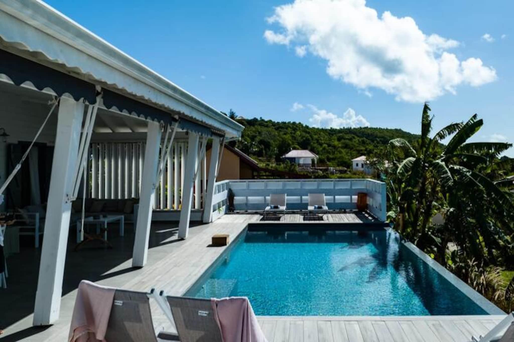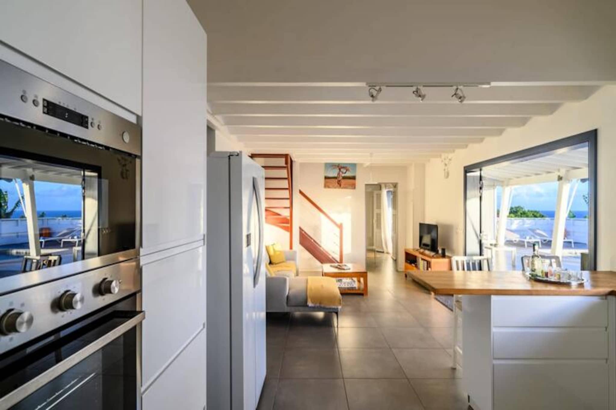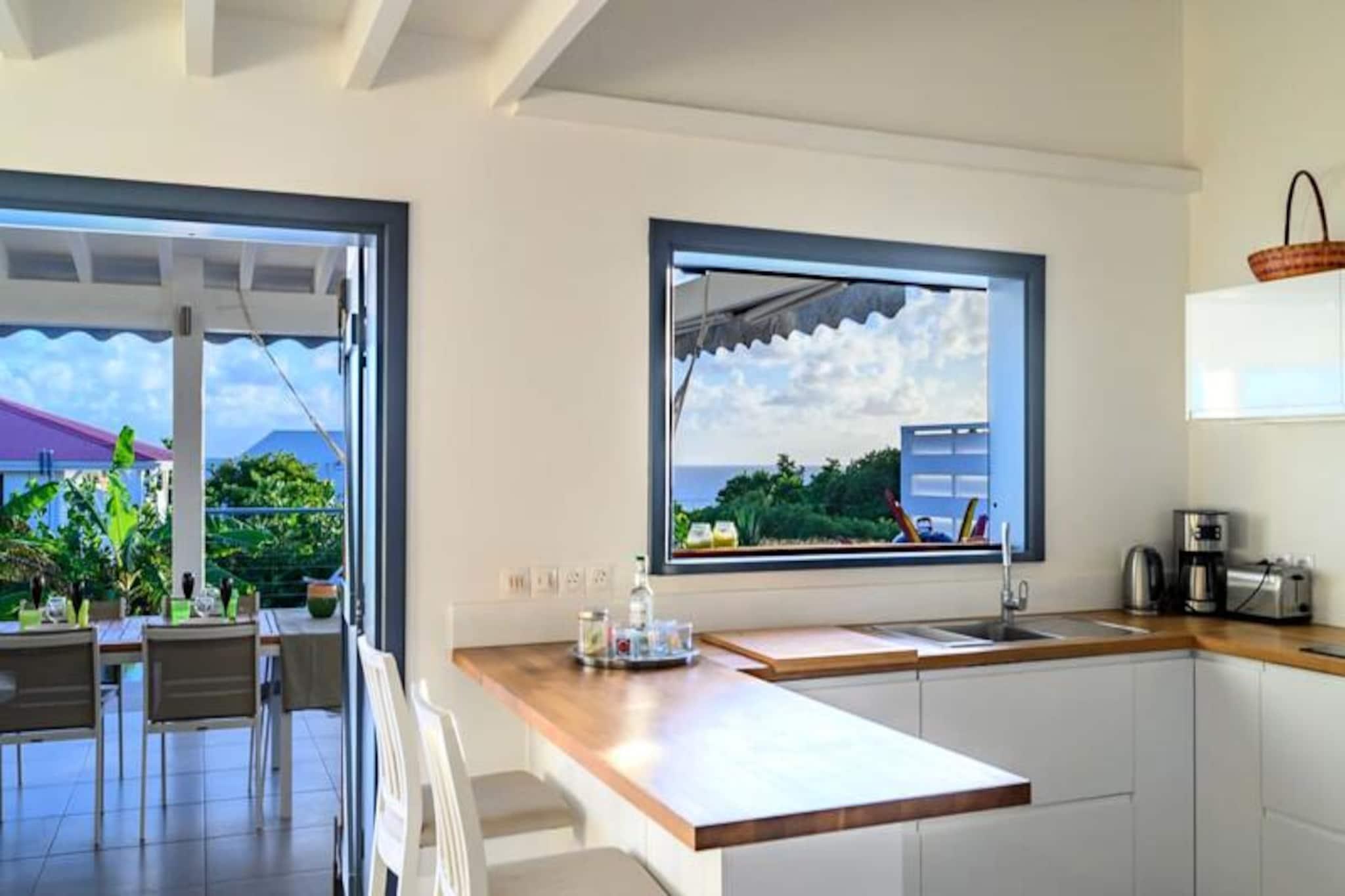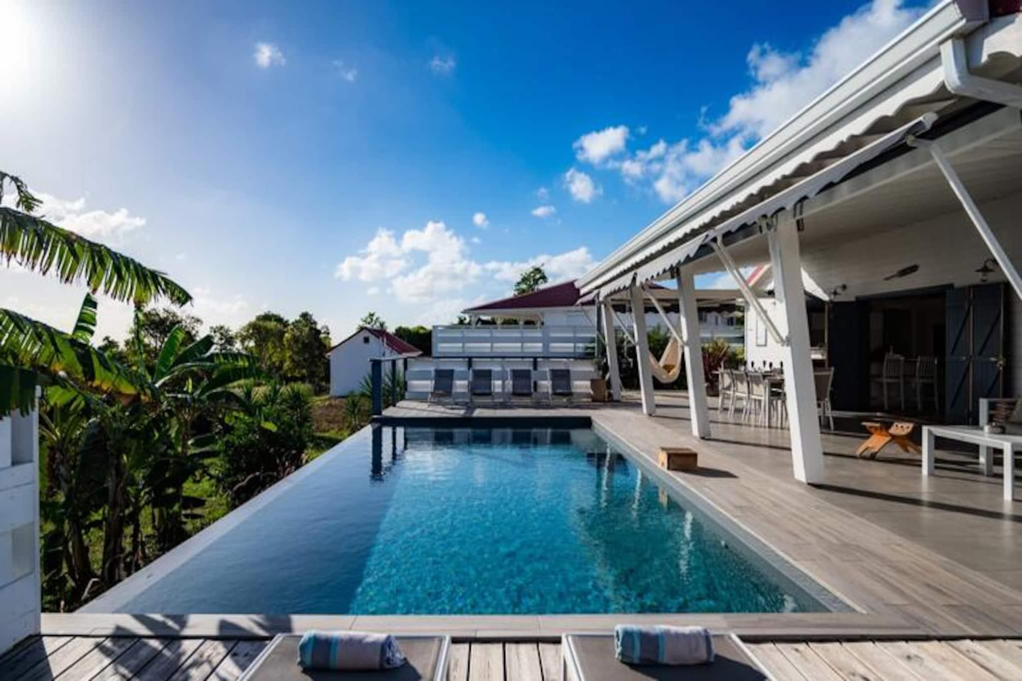 I hjertet av den rolige og uberørte øya Marie-Galante tilbyr denne elegante villaen en rolig tilflukt med fantastisk havutsikt og en frodig tropisk hage. Tenk deg å våkne opp til den milde raslingen av bananblader og den myke karibiske brisen, bare minutter fra uberørte hvite sandstrender og det turkise vannet i Atlanterhavet. Dette moderne tilfluktsstedet er det perfekte tilfluktsstedet for familier eller grupper på opptil ni gjester som søker avslapning og eventyr under Guadeloupesolen. Villaen er på 160 m² og har fire soverom med klimaanlegg, hvert med eget bad, noe som sikrer privatliv og komfort for alle. Soverommet i andre etasje gir et ekstra preg av tilbaketrukkethet, mens første etasje kan skryte av en lys, åpen stue med et moderne, fullt utstyrt kjøkken og en romslig stue. Gå ut på den innbydende terrassen, hvor et stort spisebord og en koselig sittegruppe venter på utendørs måltider og cocktailer i solnedgangen. Det private bassenget, omgitt av livlig tropisk vegetasjon, er midtpunktet i hagen og tilbyr en forfriskende oase med fantastisk havutsikt. Villaen ligger i Grand-Bourg, bare en kort kjøretur fra lokale markeder, kreolske restauranter og øyas mest berømte strender, inkludert Anse Canot og La Feuillère, et kitesurfingparadis. Utforsk nærliggende destillerier, gå tur gjennom sukkerrøråkrer, eller nyt levende musikk på stranden. Med en dedikert concierge som kan hjelpe med utflukter, leie av kjøretøy og personlige anbefalinger, er hver detalj skreddersydd for å skape et uforglemmelig opphold. Enten du slapper av ved bassenget, nyter lokale delikatesser eller oppdager øyas naturlige skjønnhet, lover denne villaen en karibisk ferie fylt med ro, komfort og oppdagelse.