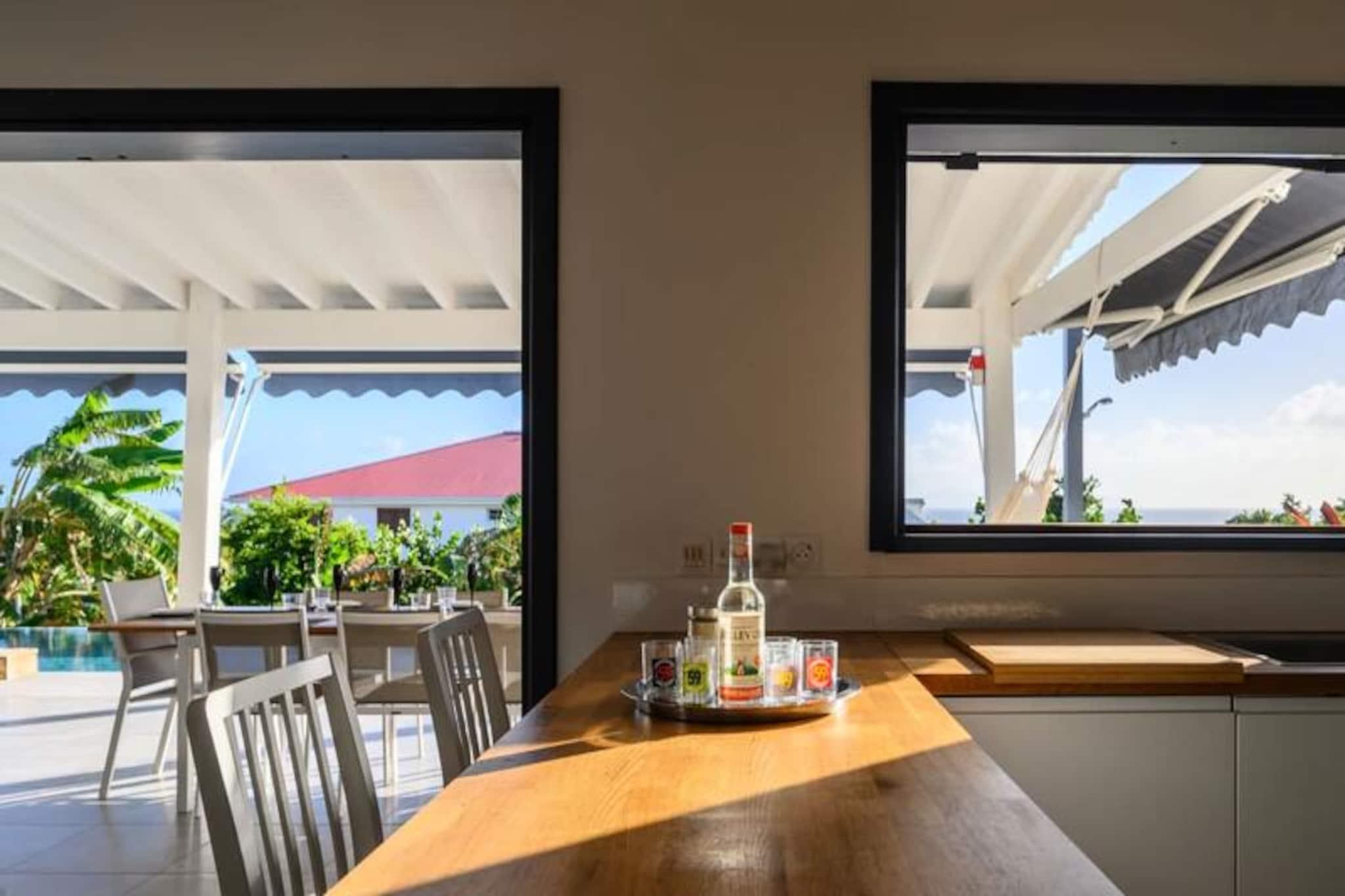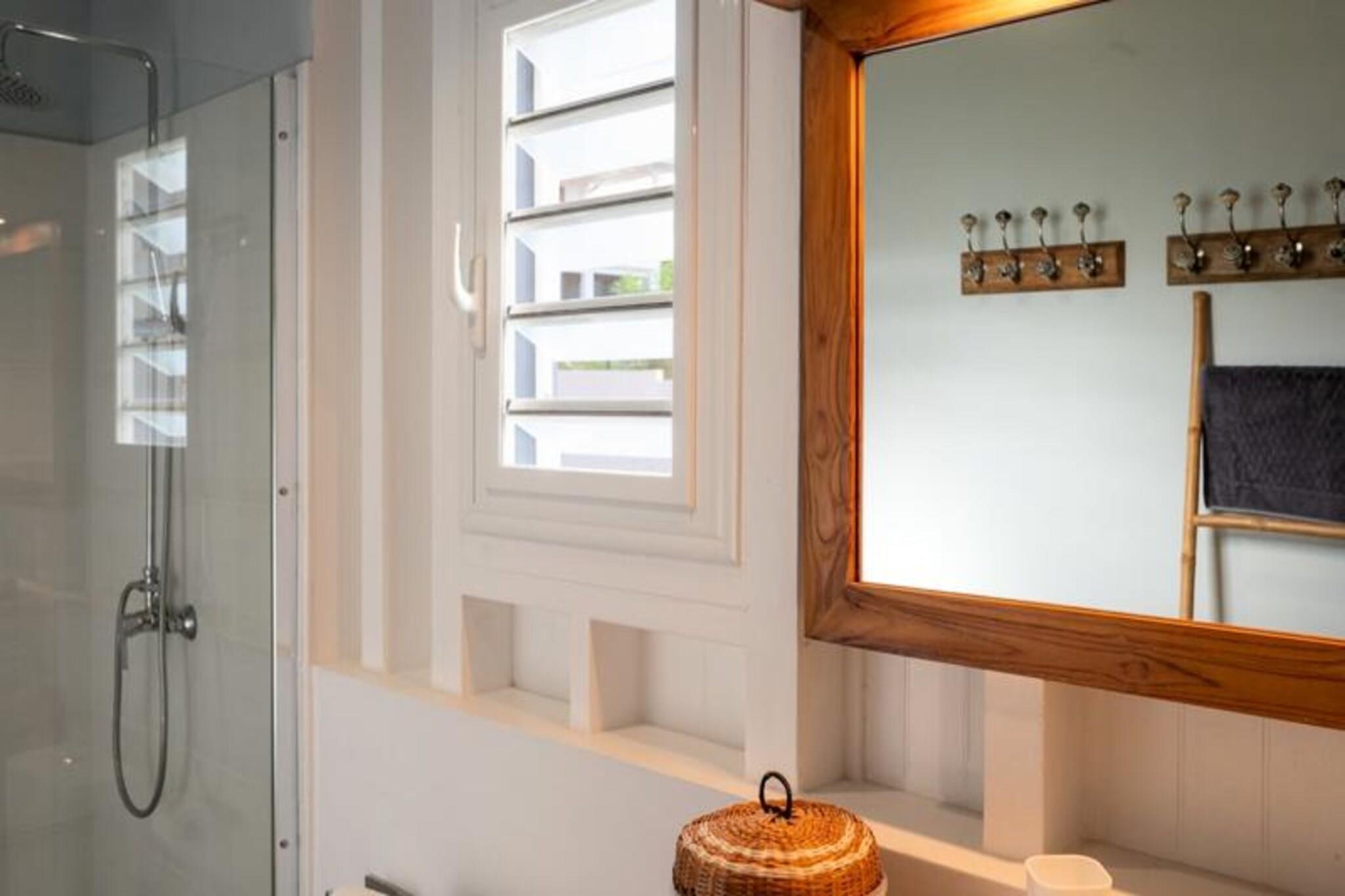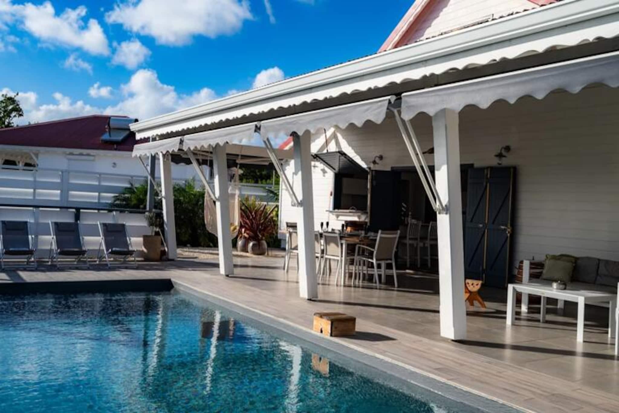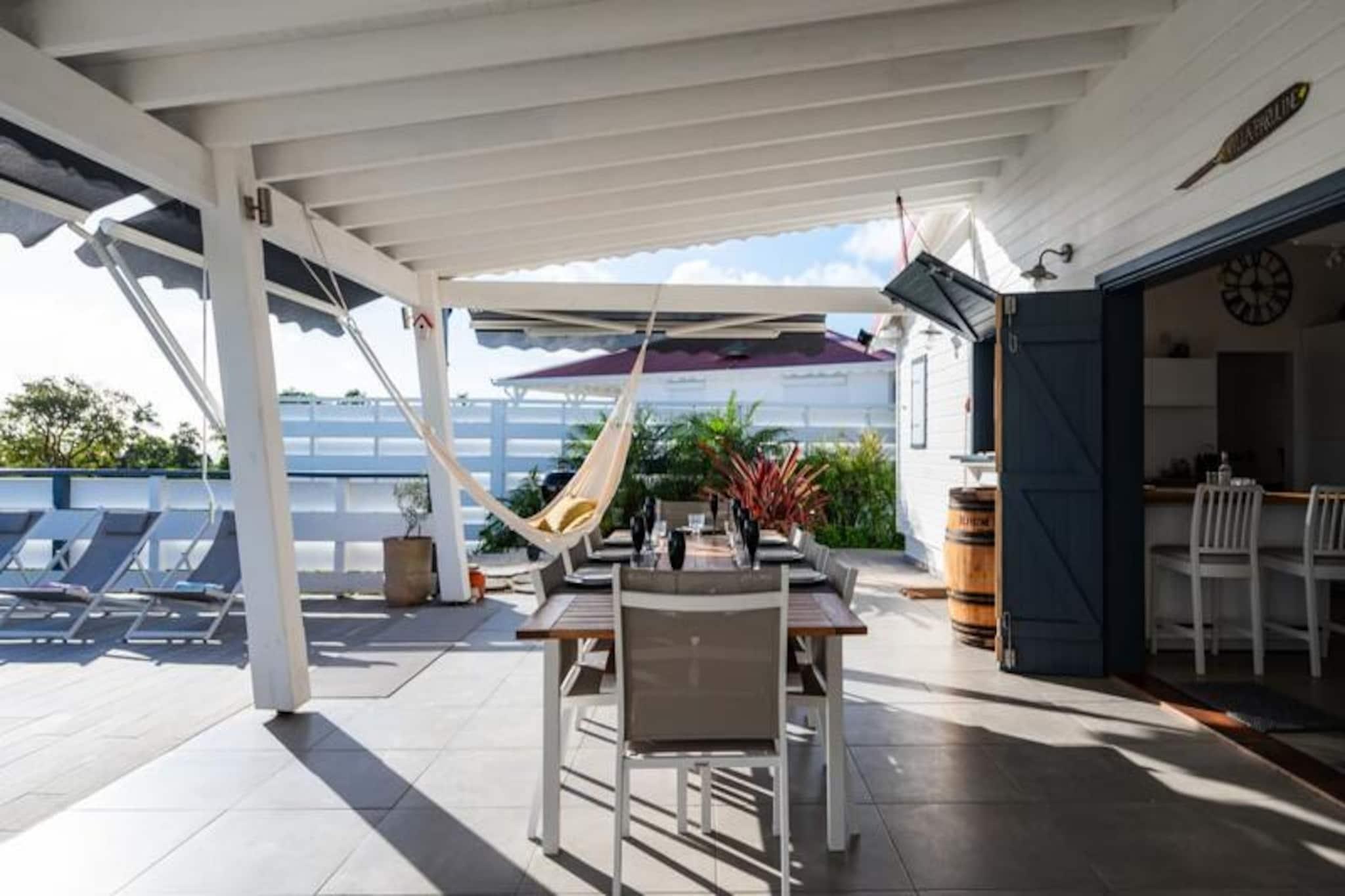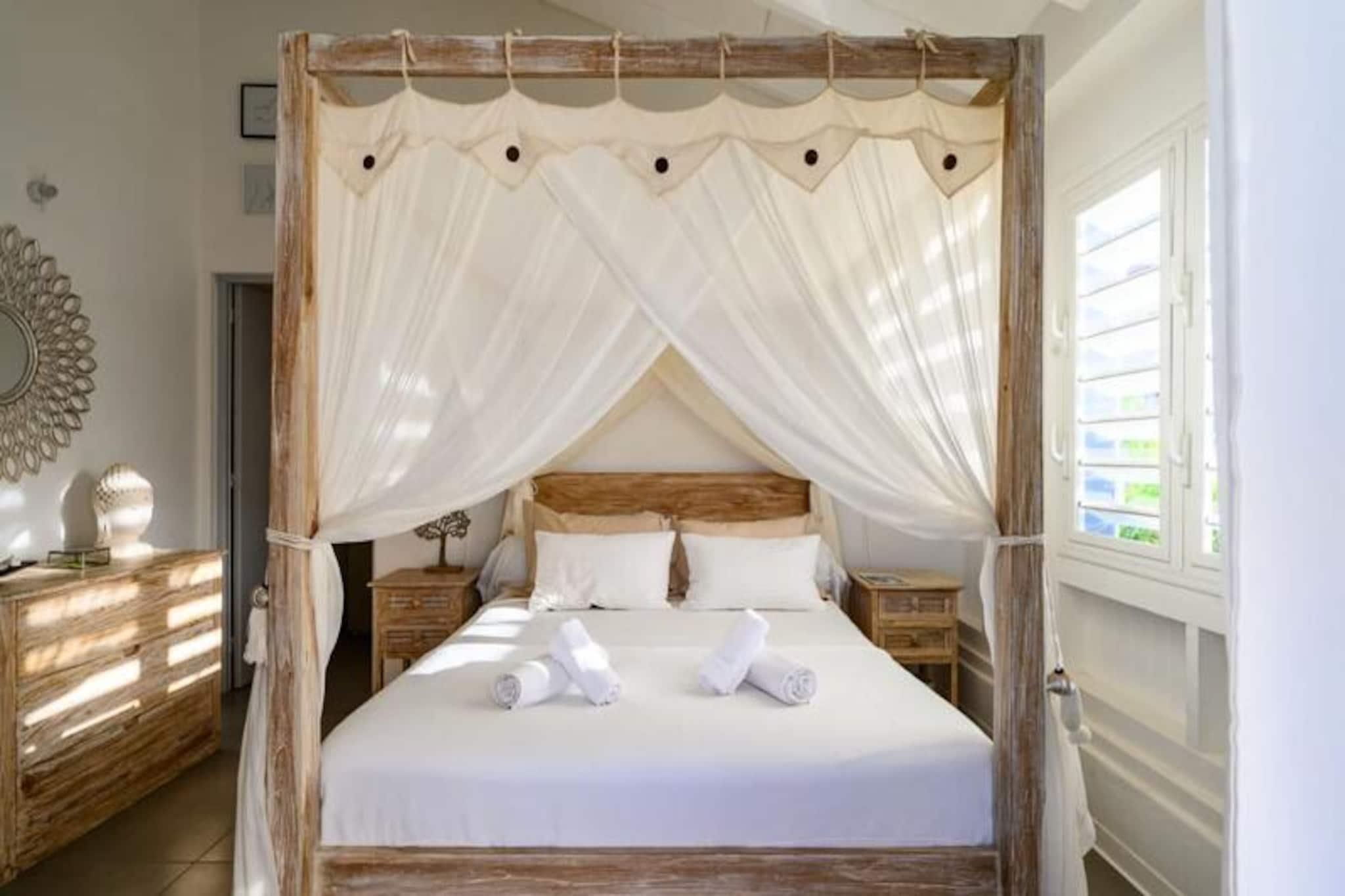 I hjertet av den rolige og uberørte øya Marie-Galante tilbyr denne elegante villaen en rolig tilflukt med fantastisk havutsikt og en frodig tropisk hage. Tenk deg å våkne opp til den milde raslingen av bananblader og den myke karibiske brisen, bare minutter fra uberørte hvite sandstrender og det turkise vannet i Atlanterhavet. Dette moderne tilfluktsstedet er det perfekte tilfluktsstedet for familier eller grupper på opptil ni gjester som søker avslapning og eventyr under Guadeloupesolen. Villaen er på 160 m² og har fire soverom med klimaanlegg, hvert med eget bad, noe som sikrer privatliv og komfort for alle. Soverommet i andre etasje gir et ekstra preg av tilbaketrukkethet, mens første etasje kan skryte av en lys, åpen stue med et moderne, fullt utstyrt kjøkken og en romslig stue. Gå ut på den innbydende terrassen, hvor et stort spisebord og en koselig sittegruppe venter på utendørs måltider og cocktailer i solnedgangen. Det private bassenget, omgitt av livlig tropisk vegetasjon, er midtpunktet i hagen og tilbyr en forfriskende oase med fantastisk havutsikt. Villaen ligger i Grand-Bourg, bare en kort kjøretur fra lokale markeder, kreolske restauranter og øyas mest berømte strender, inkludert Anse Canot og La Feuillère, et kitesurfingparadis. Utforsk nærliggende destillerier, gå tur gjennom sukkerrøråkrer, eller nyt levende musikk på stranden. Med en dedikert concierge som kan hjelpe med utflukter, leie av kjøretøy og personlige anbefalinger, er hver detalj skreddersydd for å skape et uforglemmelig opphold. Enten du slapper av ved bassenget, nyter lokale delikatesser eller oppdager øyas naturlige skjønnhet, lover denne villaen en karibisk ferie fylt med ro, komfort og oppdagelse.