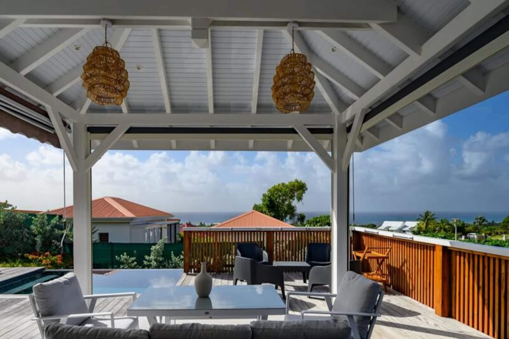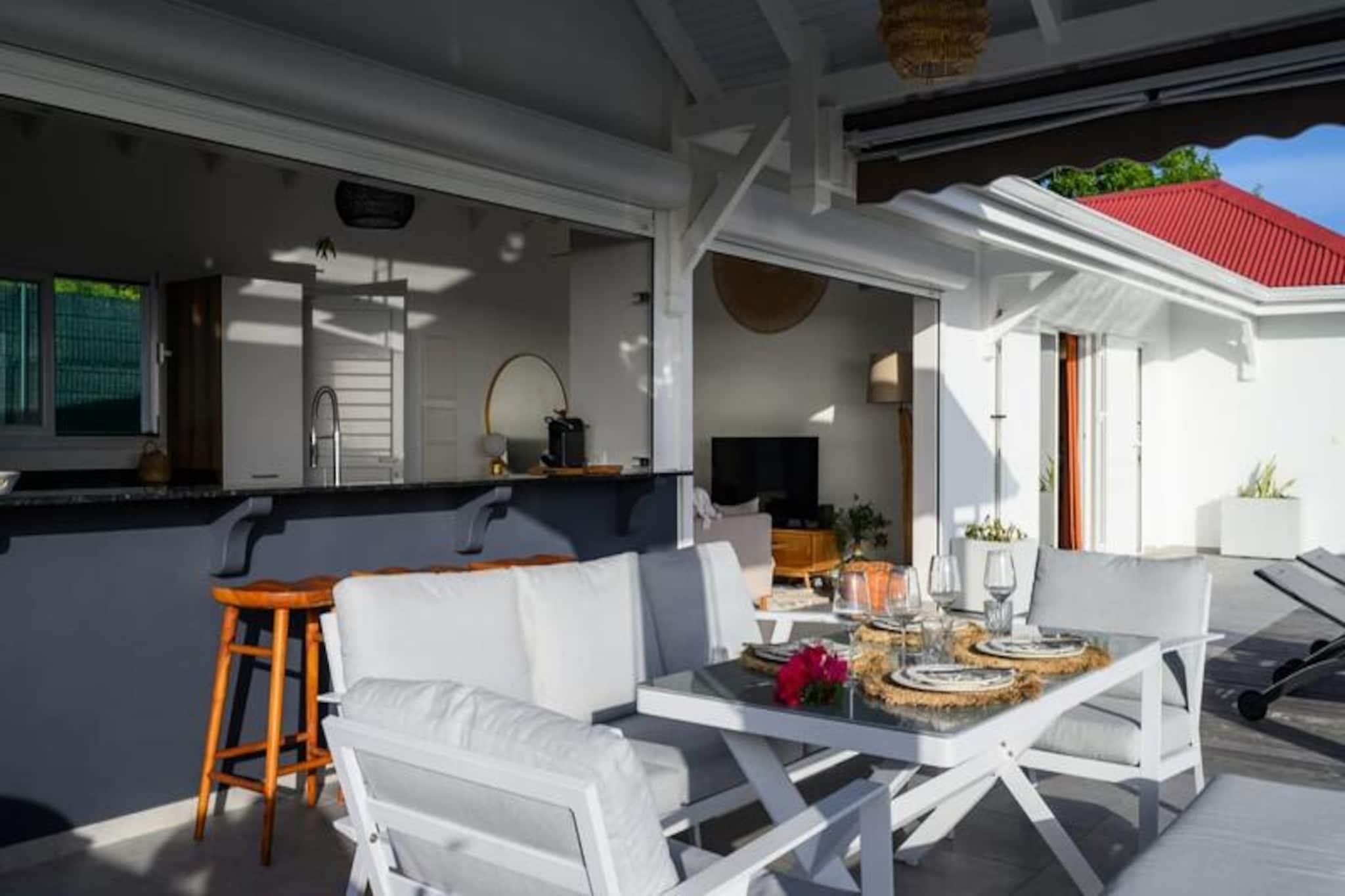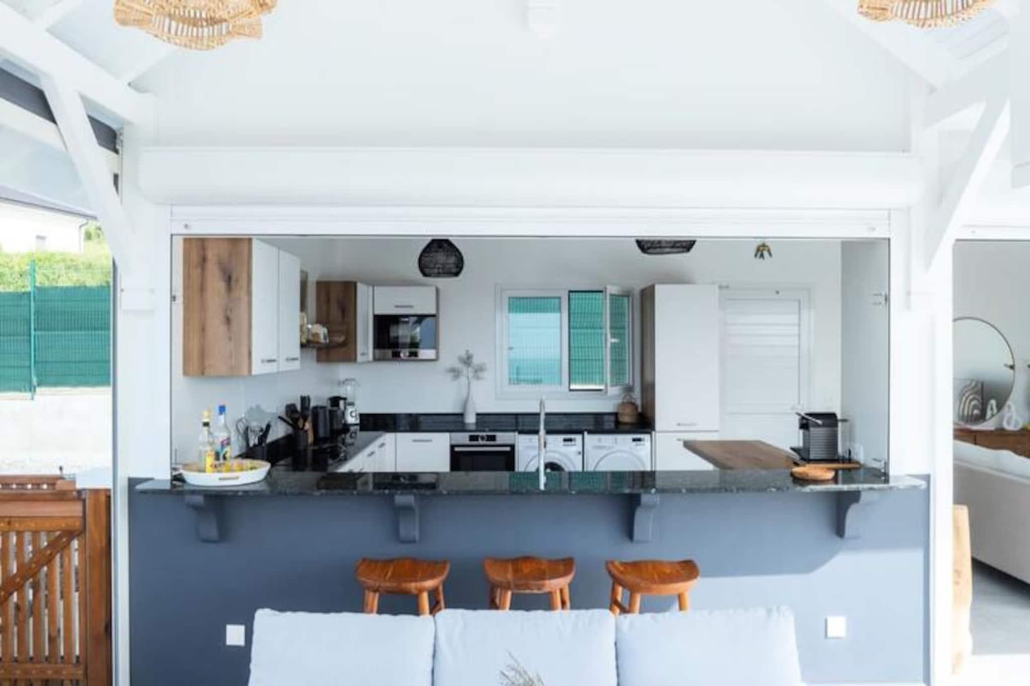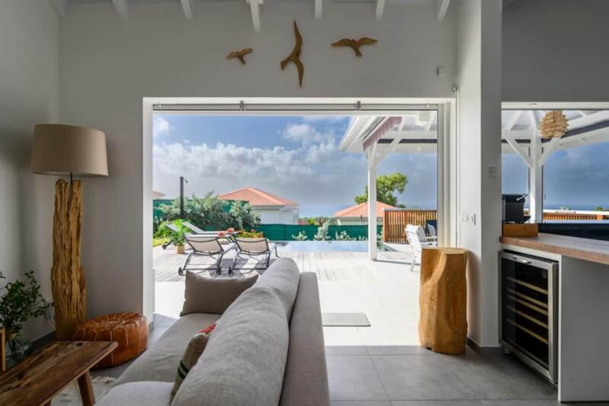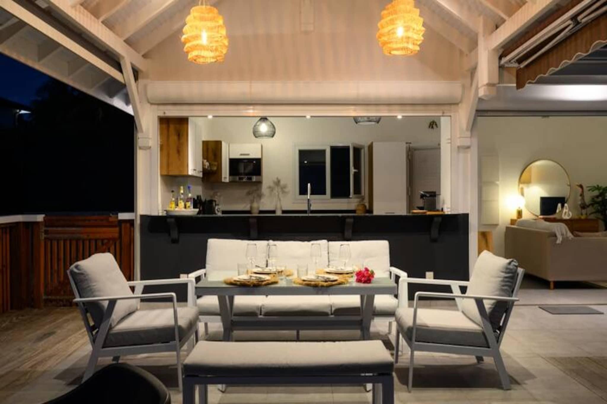 Nyt roen i Villa Paloma, et fredelig tilfluktssted som ligger på høyden av Grand-Bourg, og tilbyr fantastisk utsikt og moderne komfort. Denne elegante villaen er et fristed for par eller venner som søker en fredelig flukt under den karibiske solen. Med sitt private evighetsbasseng som sømløst glir inn i horisonten, vil du finne deg selv fordypet i skjønnheten i Marie-Galantes uberørte landskap. Villaens design kombinerer harmonisk moderne luksus med øyas naturlige sjarm, og skaper en atmosfære av ren avslapning. Innvendig tilbyr to suiter med klimaanlegg, queen-size-senger og eget bad ultimat komfort og privatliv. Soverommene, atskilt fra hovedoppholdsrommet, sikrer et rolig og avslappende opphold, perfekt for voksne som reiser sammen. Det åpne kjøkkenet, utstyrt med avanserte hvitevarer, flyter uanstrengt ut på terrassen, hvor du kan nyte utendørs servering mens du nyter havutsikten. Stuen, komplett med smart-TV og fiberoptisk internett, tilbyr et koselig sted å slappe av etter en dag med utforsking. Villaen ligger bare fem minutter fra hjertet av Grand-Bourg, og har en ideell beliggenhet for å oppleve det beste Marie-Galante har å by på. Oppdag øyas berømte hvite sandstrender, som La Feuillère og Anse Canot, som er perfekte for bading og soling. Utforsk lokale markeder, nyt kreolske delikatesser, eller vandre gjennom de frodige sukkerrøråkrene og naturskjønne turstiene som definerer øyas unike sjarm. Med personlige concierge-tjenester, inkludert utflukter, leie av kjøretøy og eksklusive anbefalinger, sikrer Villa Paloma et uforglemmelig opphold. Enten du slapper av ved evighetsbassenget eller utforsker øyas skjulte perler, lover dette tilfluktsstedet en ferie fylt med avslapning, eventyr og den varme omfavnelsen av Karibia.