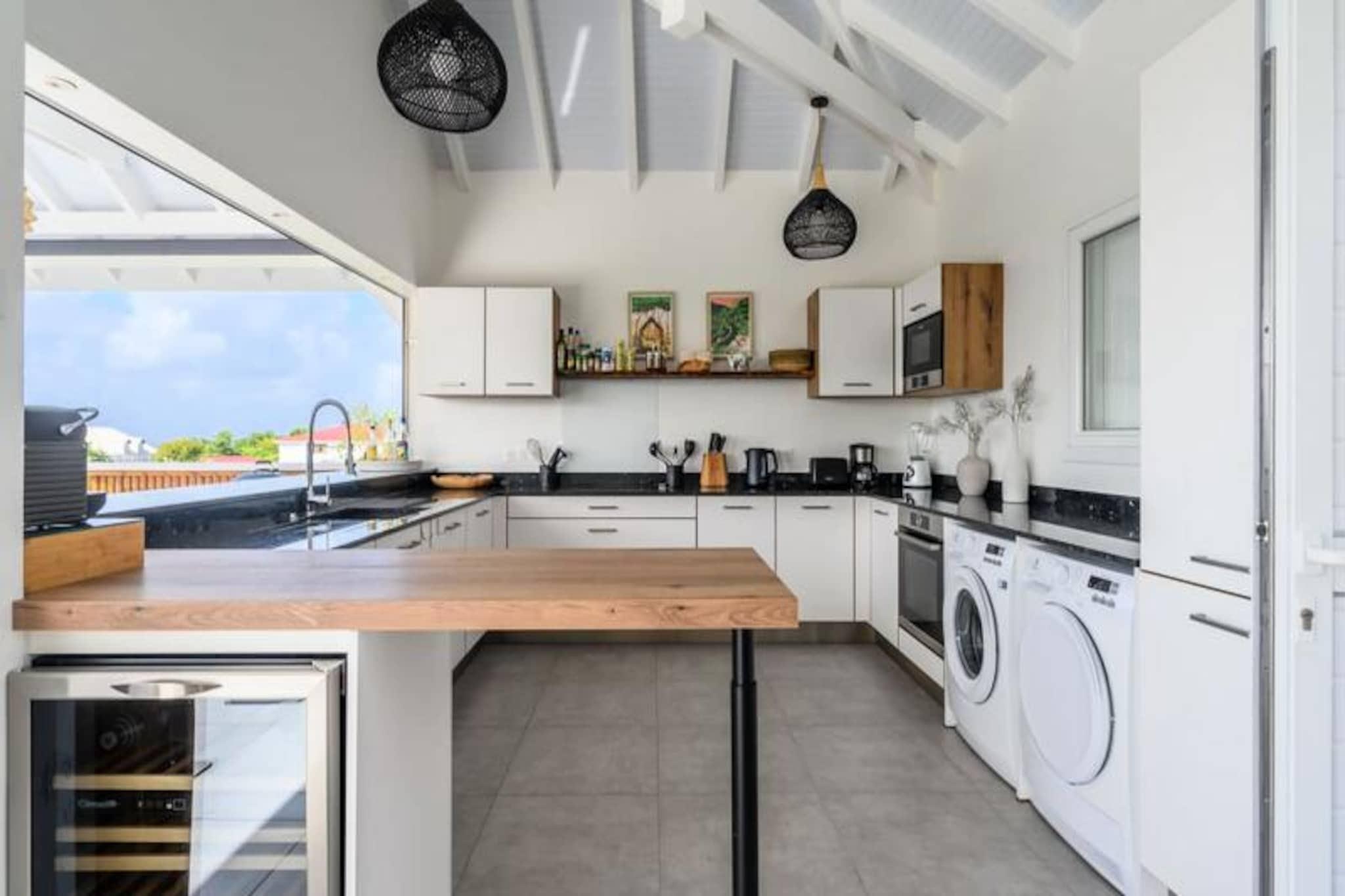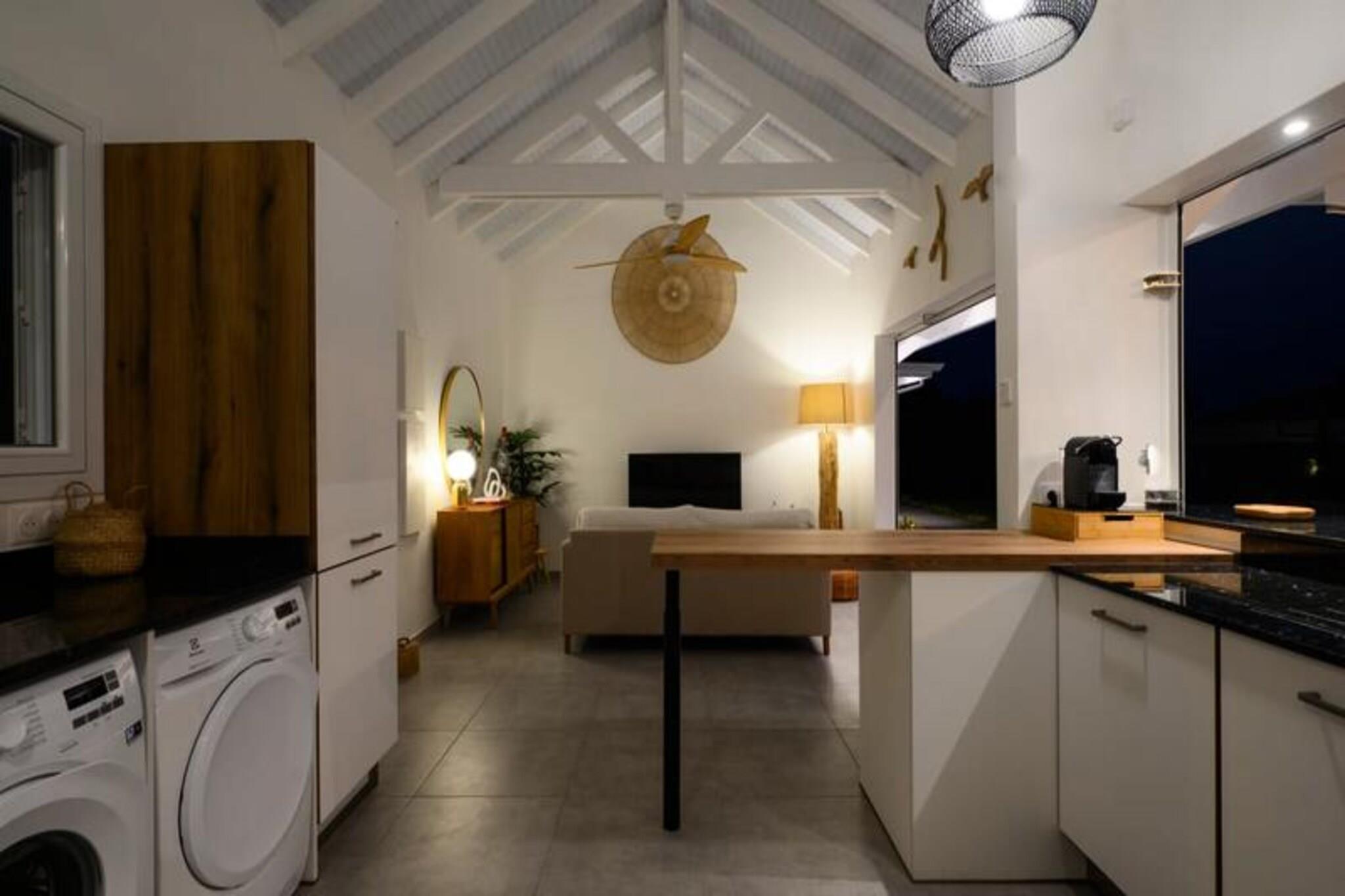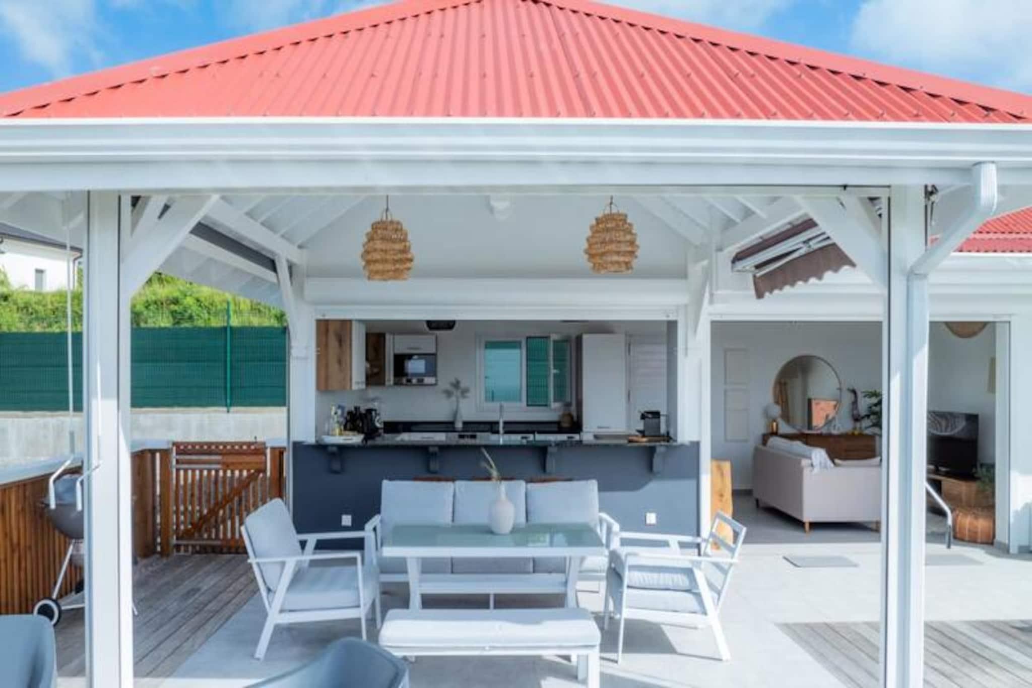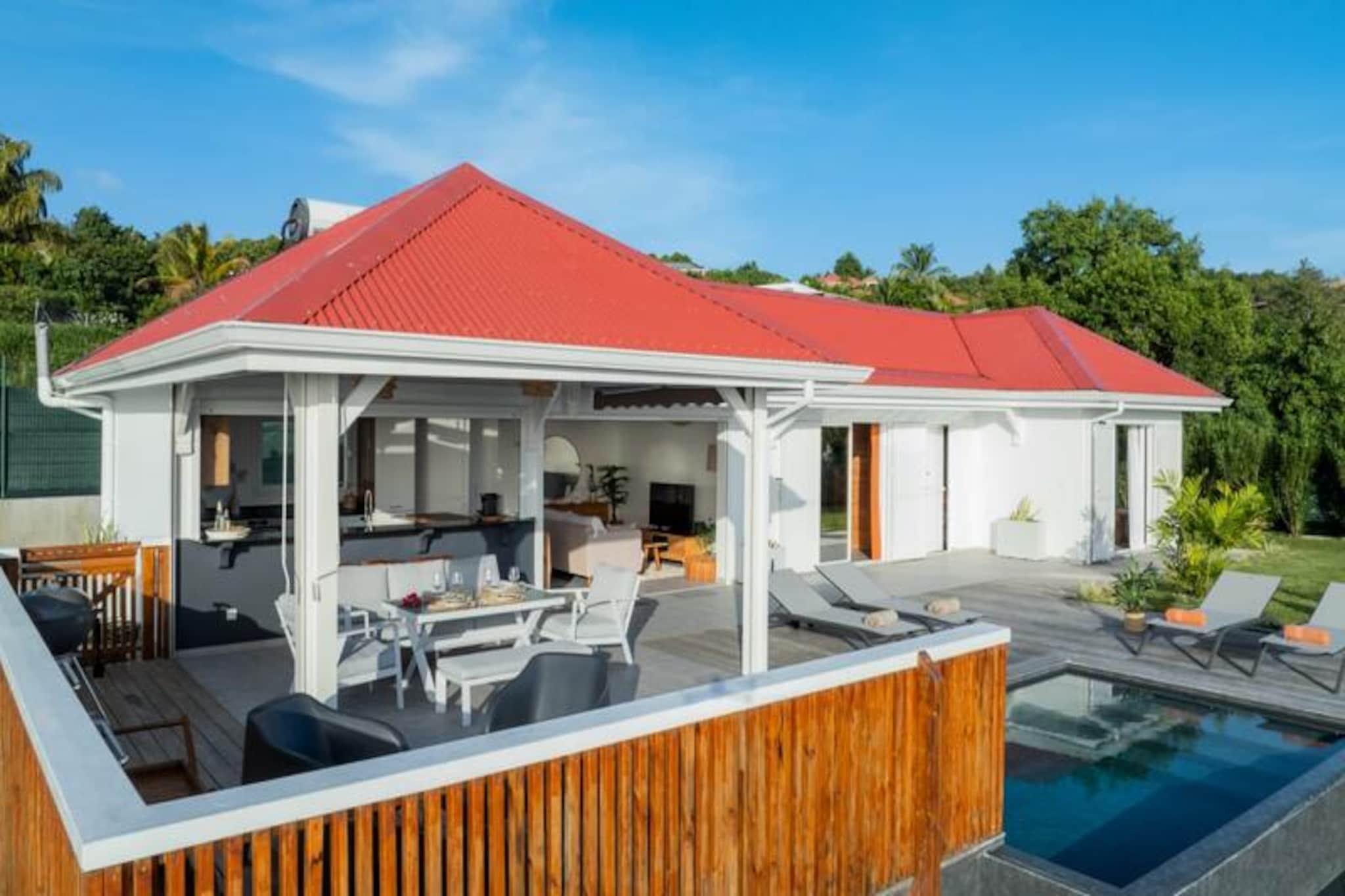 Nyt roen i Villa Paloma, et fredelig tilfluktssted som ligger på høyden av Grand-Bourg, og tilbyr fantastisk utsikt og moderne komfort. Denne elegante villaen er et fristed for par eller venner som søker en fredelig flukt under den karibiske solen. Med sitt private evighetsbasseng som sømløst glir inn i horisonten, vil du finne deg selv fordypet i skjønnheten i Marie-Galantes uberørte landskap. Villaens design kombinerer harmonisk moderne luksus med øyas naturlige sjarm, og skaper en atmosfære av ren avslapning. Innvendig tilbyr to suiter med klimaanlegg, queen-size-senger og eget bad ultimat komfort og privatliv. Soverommene, atskilt fra hovedoppholdsrommet, sikrer et rolig og avslappende opphold, perfekt for voksne som reiser sammen. Det åpne kjøkkenet, utstyrt med avanserte hvitevarer, flyter uanstrengt ut på terrassen, hvor du kan nyte utendørs servering mens du nyter havutsikten. Stuen, komplett med smart-TV og fiberoptisk internett, tilbyr et koselig sted å slappe av etter en dag med utforsking. Villaen ligger bare fem minutter fra hjertet av Grand-Bourg, og har en ideell beliggenhet for å oppleve det beste Marie-Galante har å by på. Oppdag øyas berømte hvite sandstrender, som La Feuillère og Anse Canot, som er perfekte for bading og soling. Utforsk lokale markeder, nyt kreolske delikatesser, eller vandre gjennom de frodige sukkerrøråkrene og naturskjønne turstiene som definerer øyas unike sjarm. Med personlige concierge-tjenester, inkludert utflukter, leie av kjøretøy og eksklusive anbefalinger, sikrer Villa Paloma et uforglemmelig opphold. Enten du slapper av ved evighetsbassenget eller utforsker øyas skjulte perler, lover dette tilfluktsstedet en ferie fylt med avslapning, eventyr og den varme omfavnelsen av Karibia.