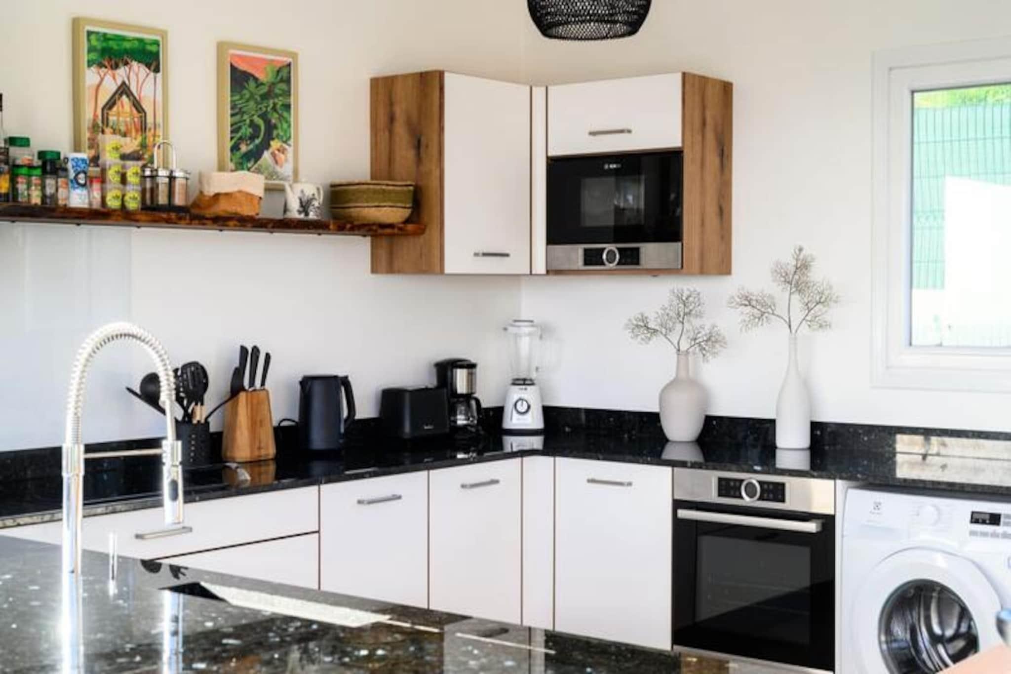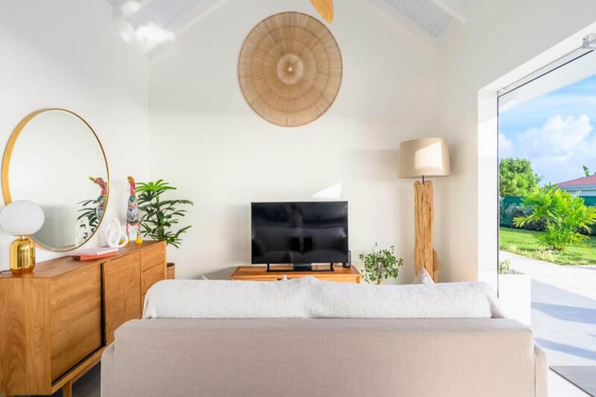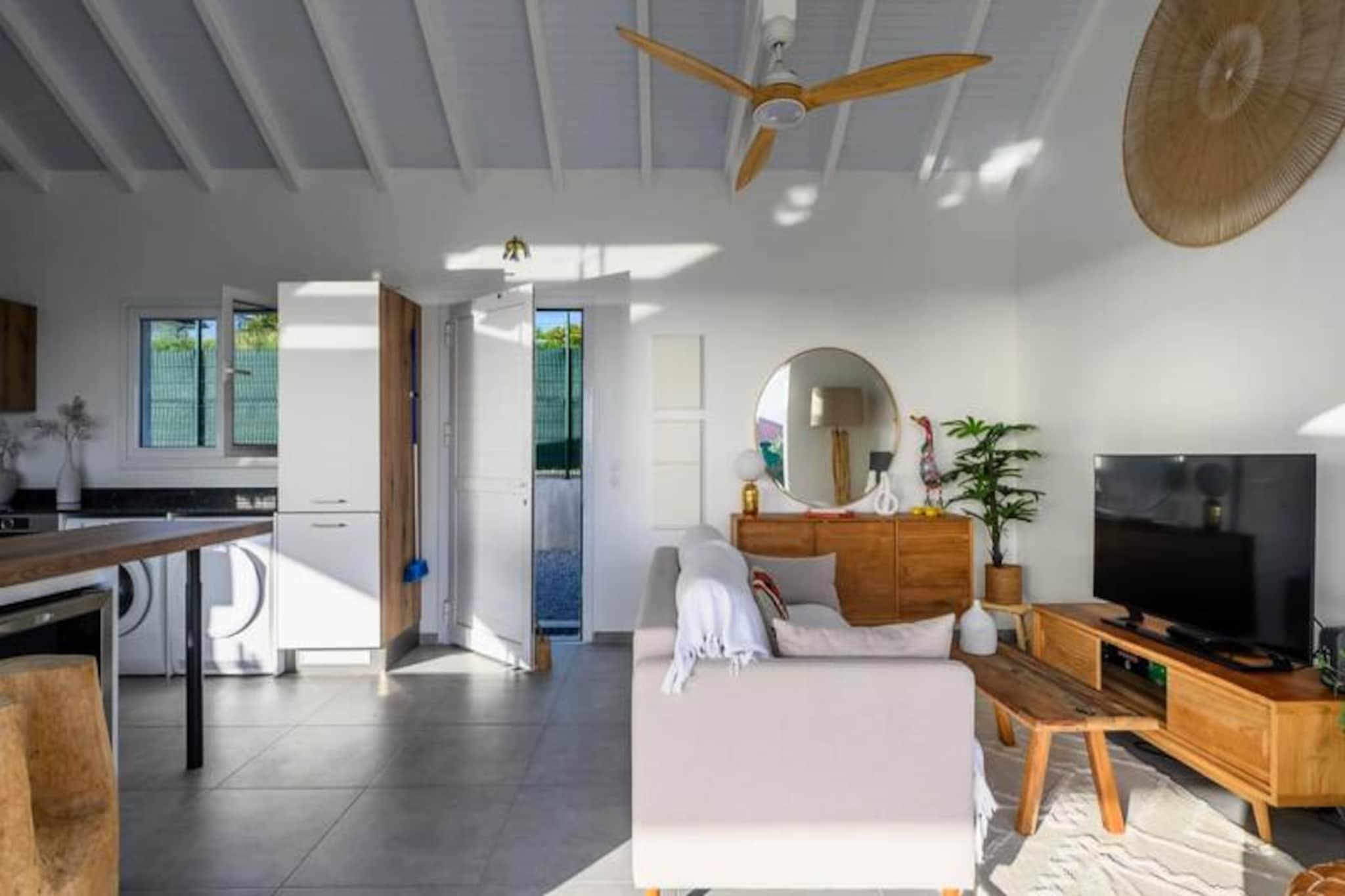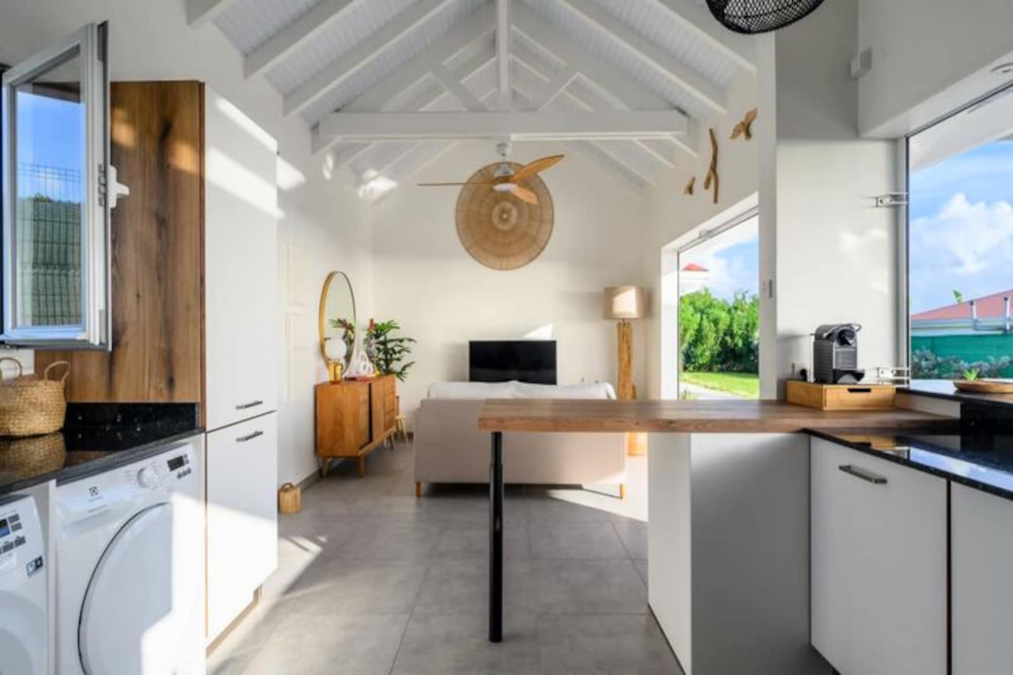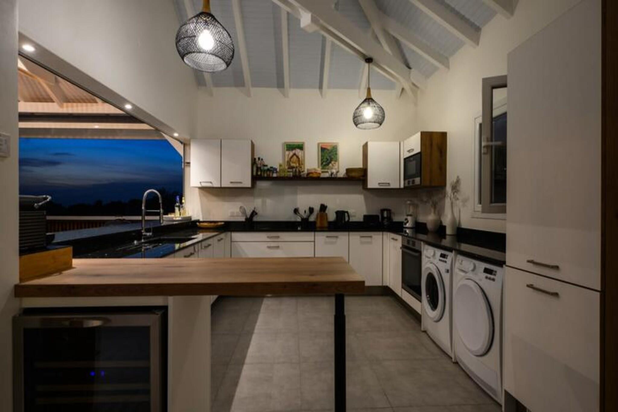 Nyt roen i Villa Paloma, et fredelig tilfluktssted som ligger på høyden av Grand-Bourg, og tilbyr fantastisk utsikt og moderne komfort. Denne elegante villaen er et fristed for par eller venner som søker en fredelig flukt under den karibiske solen. Med sitt private evighetsbasseng som sømløst glir inn i horisonten, vil du finne deg selv fordypet i skjønnheten i Marie-Galantes uberørte landskap. Villaens design kombinerer harmonisk moderne luksus med øyas naturlige sjarm, og skaper en atmosfære av ren avslapning. Innvendig tilbyr to suiter med klimaanlegg, queen-size-senger og eget bad ultimat komfort og privatliv. Soverommene, atskilt fra hovedoppholdsrommet, sikrer et rolig og avslappende opphold, perfekt for voksne som reiser sammen. Det åpne kjøkkenet, utstyrt med avanserte hvitevarer, flyter uanstrengt ut på terrassen, hvor du kan nyte utendørs servering mens du nyter havutsikten. Stuen, komplett med smart-TV og fiberoptisk internett, tilbyr et koselig sted å slappe av etter en dag med utforsking. Villaen ligger bare fem minutter fra hjertet av Grand-Bourg, og har en ideell beliggenhet for å oppleve det beste Marie-Galante har å by på. Oppdag øyas berømte hvite sandstrender, som La Feuillère og Anse Canot, som er perfekte for bading og soling. Utforsk lokale markeder, nyt kreolske delikatesser, eller vandre gjennom de frodige sukkerrøråkrene og naturskjønne turstiene som definerer øyas unike sjarm. Med personlige concierge-tjenester, inkludert utflukter, leie av kjøretøy og eksklusive anbefalinger, sikrer Villa Paloma et uforglemmelig opphold. Enten du slapper av ved evighetsbassenget eller utforsker øyas skjulte perler, lover dette tilfluktsstedet en ferie fylt med avslapning, eventyr og den varme omfavnelsen av Karibia.