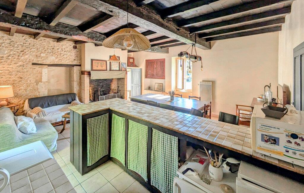I oppholdsrommet venter synlige trebjelker og vegger av naturstein. Innredningen er enkel, men praktisk, og her finner du alt du trenger for et ukomplisert opphold. Tilbered måltider i det åpne kjøkkenet med benk, og nyt måltidene ved det store spisebordet. Etterpå kan du slappe av og sosialisere i sofaene.