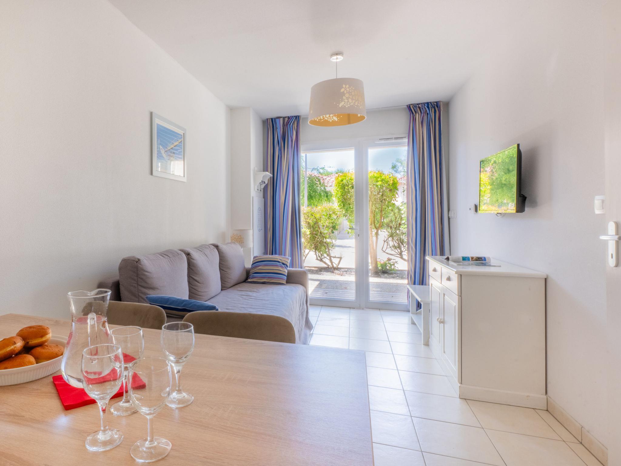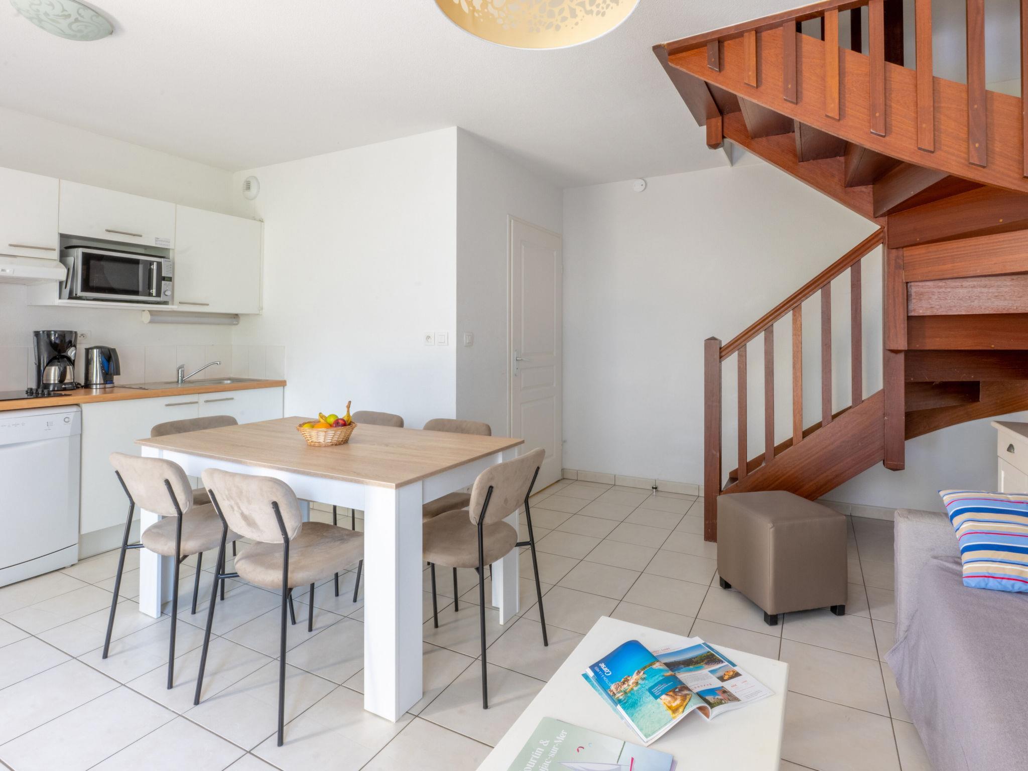 "Résidence Odalys Référence Le Petit Pont", 2-room apartment 31 to 36 m2. Practical furnishings: living/sleeping room with 1 pull-out bed (2 pers.), dining table and TV. Exit to the terrace. 1 room with 1 double bed (160 cm). Small, open kitchen (dishwasher, 2 ceramic glass hob hotplates, kettle, microwave, electric coffee machine). Shower/WC. Electric heating. Carpet. Balcony or terrace. Terrace furniture, balcony furniture. Facilities: children's high chair, baby cot (extra). Internet (WiFi, free). Please note: non-smokers only. Maximum 1 pet/ dog allowed. Smoke alarm.