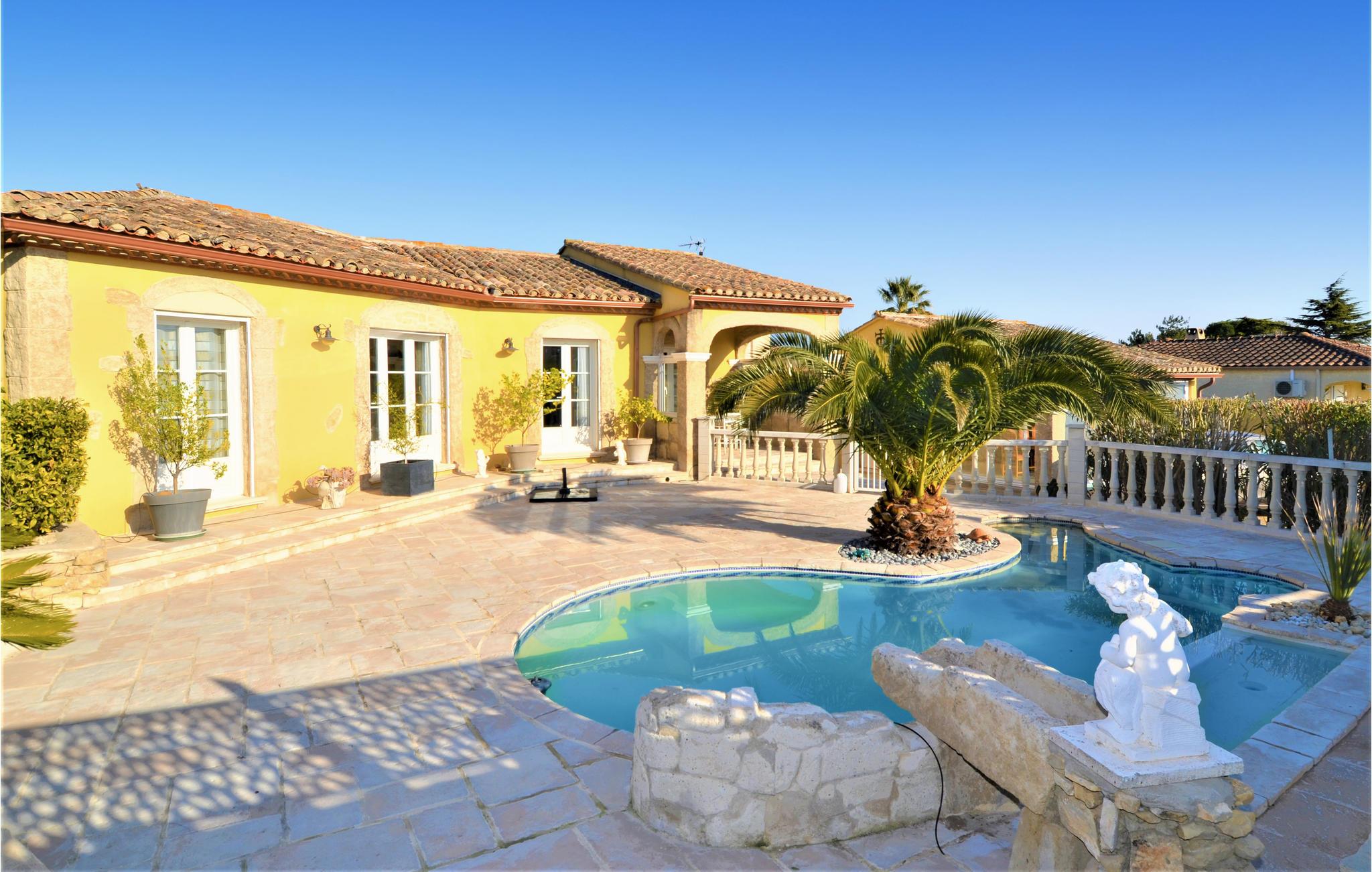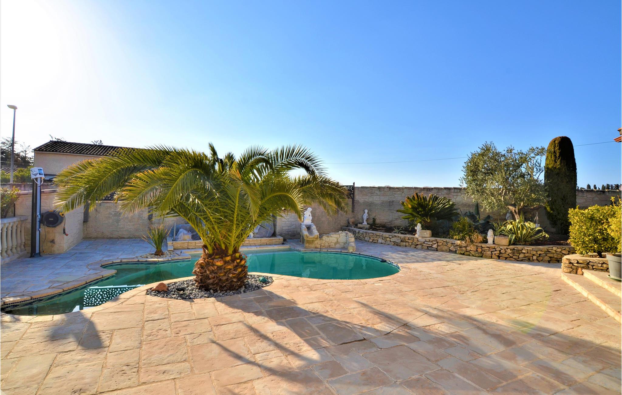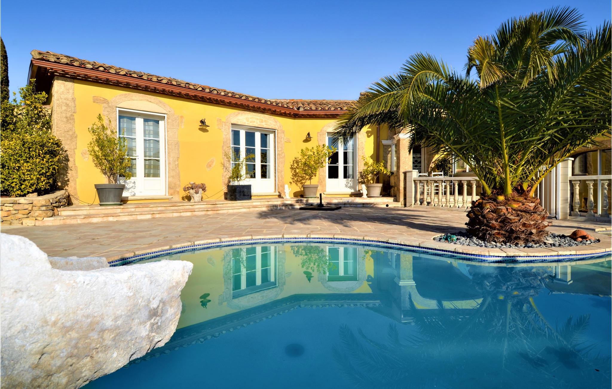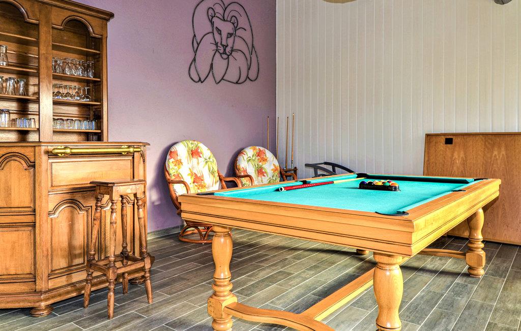 Her venter deg et fantastisk romslig feriehus med flere aktivitetsmuligheter for deg og vennene dine. I den store flislagte stuen med sine slående steinvegger kan du tilbringe tid sammen og nyte spennende samtaler eller spille spill. I aktivitetsrommet finner du et biljardbord og en bar hvor du kan tilbringe kveldene. Utenfor finner du et utekjøkken og grill, samt et basseng omgitt av solsenger, hvor du kan sole deg og slappe av for å holde deg gående gjennom dagen.