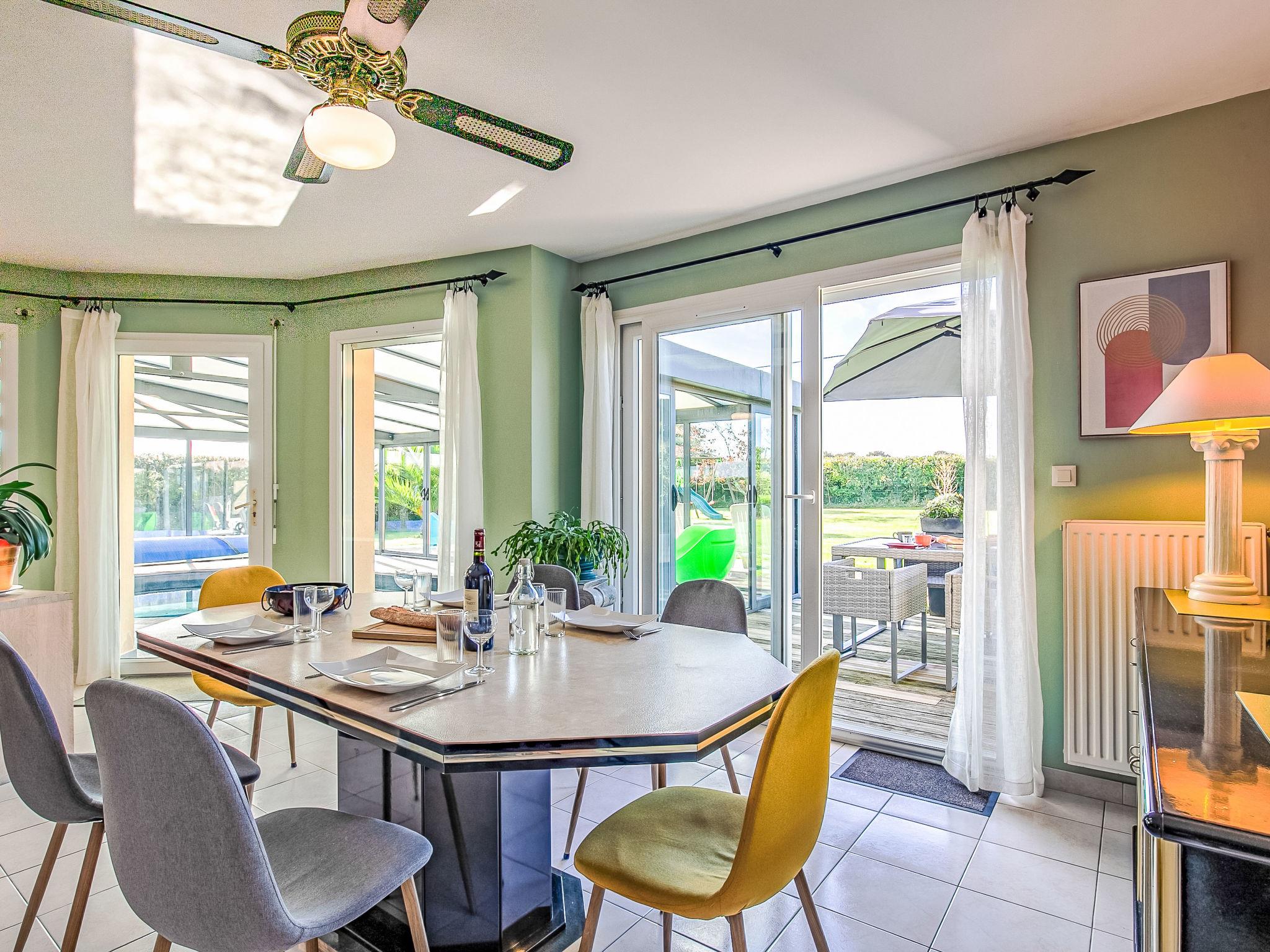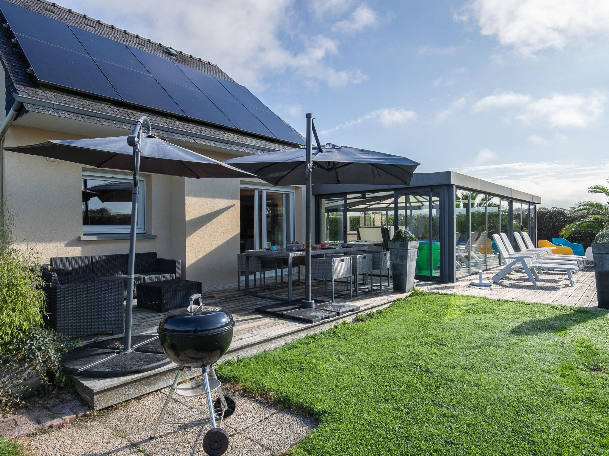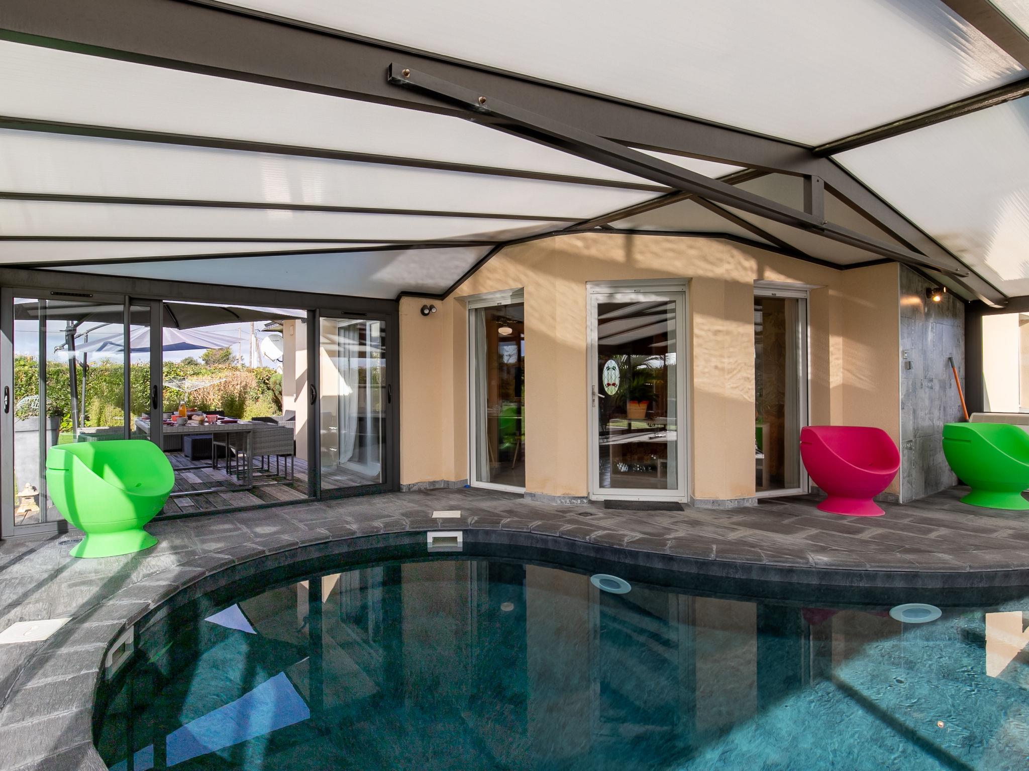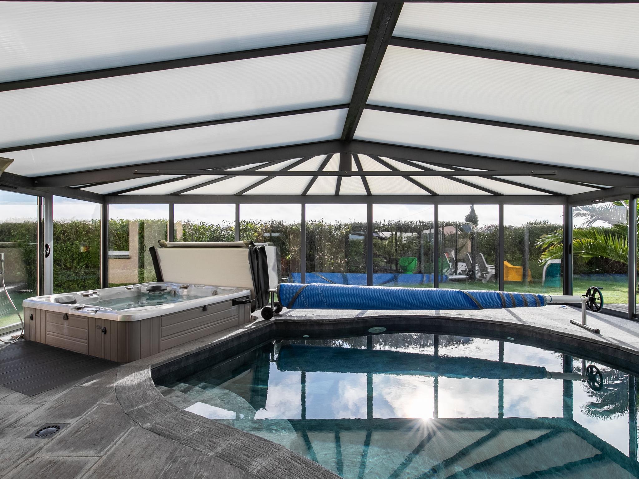 Beautiful, cosy, comfortable single-family house "Chez David". In the hamlet Keradec 1.8 km from the centre of Kersaint-Plabennec, 8.4 km from the centre of Plabennec, in a quiet position, 13 km from the sea, 13 km from the beach. Private: property 1'500 m2 (fenced), well-kept garden with lawn and wildlife garden, indoor pool heated (8 x 4 m, depth 170 cm, seasonal availability: 01.Jan. and 31.Dec.). Hot tub, pool house with shower, children's playground (slide, swing). In the house: fitness room. Parking (for 2 cars) on the premises. Shop 11 km, supermarket 3 km, shopping centre 15 km, restaurant 1.7 km, bar 1.7 km, bakery 3.7 km, bus stop 1.7 km, sandy beach "Plage du Moulin Blanc" 13 km, indoor swimming pool 15 km. Sports harbour 15 km, golf course (18 hole) 20 km, surf school 15 km, sailing school 15 km. Nearby attractions: Landerneau 12 km, Brest, Océanopolis 16 km, Plougonvelin, Fort Berthaume 40 km, Pointe de St.Mathieu, Le Conquet 43 km, Saint Renan 25 km, Quimper 73 km.
