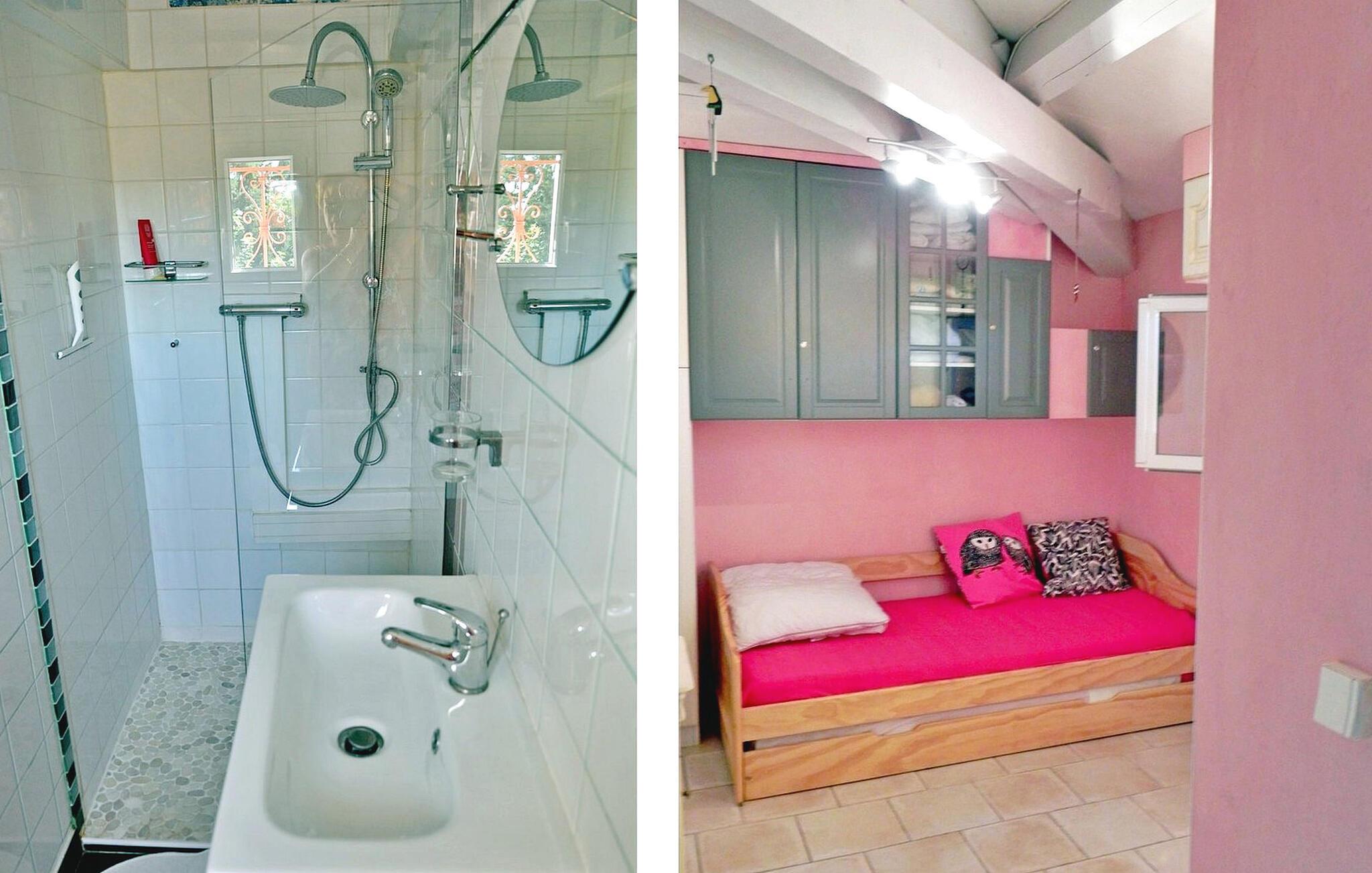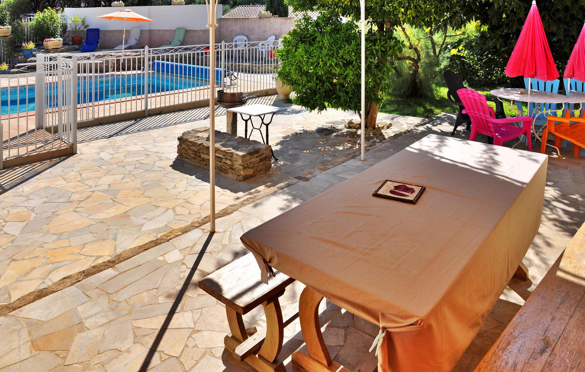 Dette feriehuset med klimaanlegg for 6 personer (4 voksne + 2 barn) ligger i l'Isle sur la Sorgue og har et privat, inngjerdet basseng. I første etasje er det en spisestue/stue med franske vinduer som fører ut til terrassen. Kjøkkenet i åpen planløsning, et grovkjøkken og et vaskerom byr på moderne bekvemmeligheter. I andre etasje finner du fire soverom, hvorav de tre første har dobbeltsenger og rikelig med oppbevaringsplass. Det fjerde, et barnerom, har køyesenger. Gå ut på en 2500 m² stor tomt med trær, blomster og skyggefulle steder. På terrassen, som er tilgjengelig fra kjøkkenet og spisestuen/stuen, kan du spise utendørs og grille. Det private bassenget (8 m x 4,30 m) er et idyllisk feriested med åtte solsenger og parasoller. Villaen ligger i et rolig nabolag ved foten av Saint Antoine-høyden i landsbyen l'Isle sur la Sorgue. De nærmeste shoppingmulighetene ligger ca. 1,5 km unna. Du kan spasere til sentrum av L'Isle sur la Sorgue eller ta en spasertur på Saint Antoine-høyden. Nyt komfort, stil og sesongens muntre stemning på dette fortryllende feriestedet.