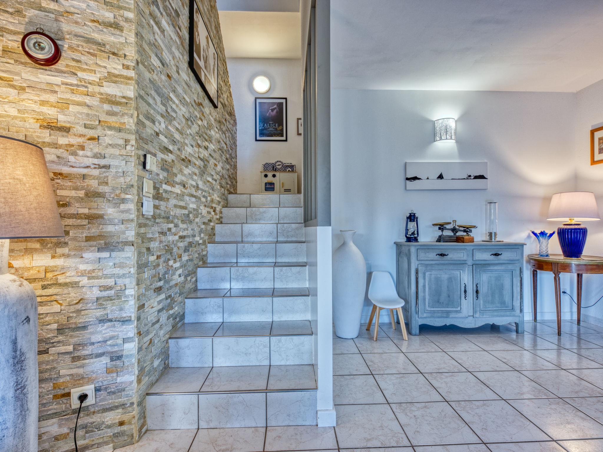 4-room villa 90 m2 on 2 levels. Comfortable furnishings: living/dining room with open-hearth fireplace and TV. Exit to the terrace. 2 rooms, each room with 2 beds (90 cm). Open kitchen (oven, dishwasher, 4 induction hot plates, microwave). Shower, sep. WC, double hand-basin. Electric heating. Upper floor: 1 room with 1 french bed (160 cm, length 200 cm), shower/WC and TV. Exit to the balcony. Terrace 60 m2, roofed, west facing position terrace 48 m2, west facing position. Terrace furniture. View of the swimming pool and the garden. Facilities: washing machine, dryer. Internet (WiFi, free). Parking (fenced 2 cars). Please note: non-smokers only. Smoke alarm.