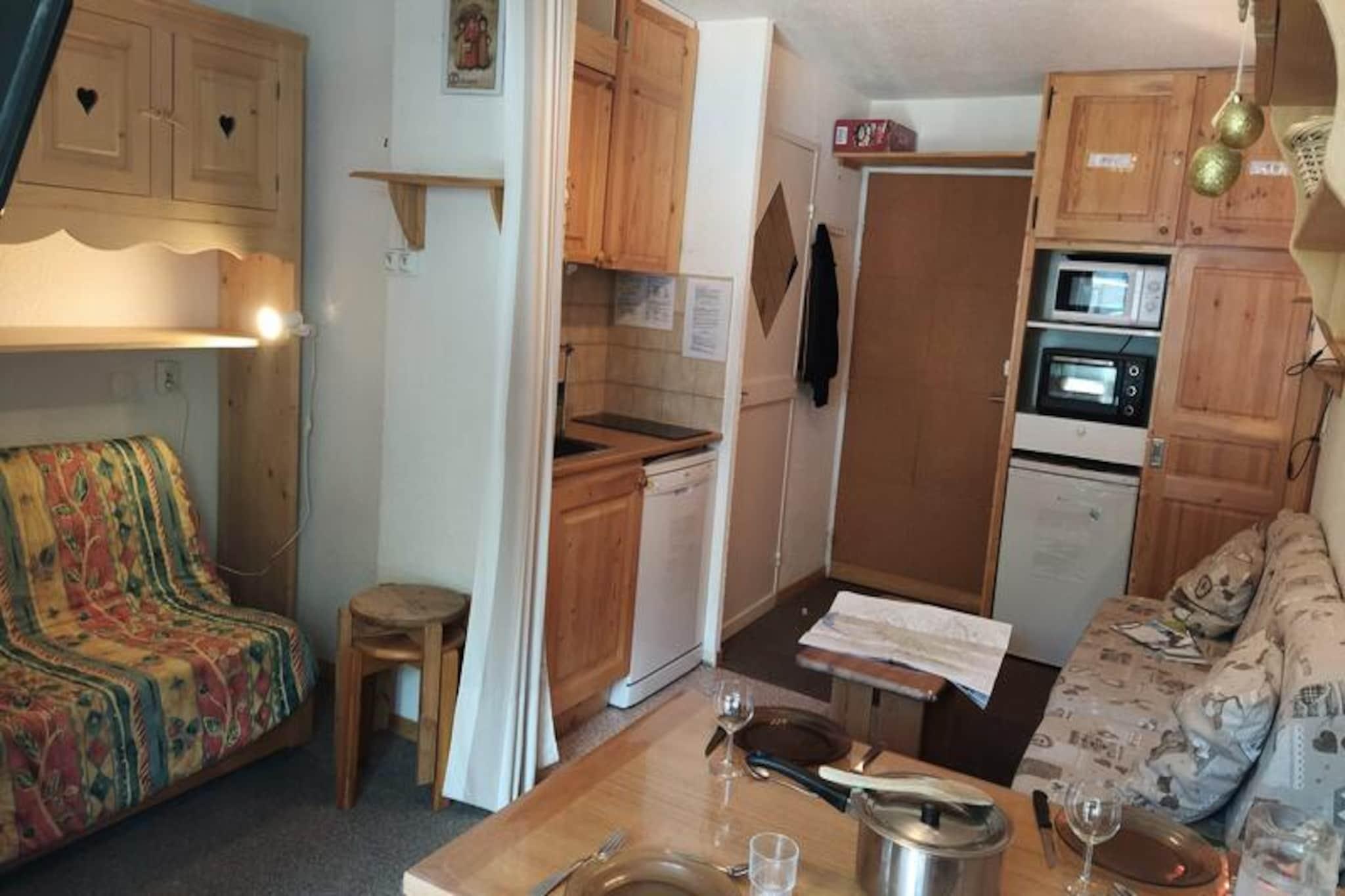 Denne koselige leiligheten i Les Cimes de Caron-residensen ligger ved inngangen til det pulserende Arolles-distriktet, og tilbyr en innbydende alpin ferie. Med sin førsteklasses beliggenhet nær busstasjonen, Caron sports- og kjøpesenter og en rekke restauranter, finner du alt du trenger innen rekkevidde. Residensens direkte tilgang til bakkene sikrer at du alltid er bare noen øyeblikk unna ditt neste eventyr, mens den korte spaserturen tilbake fra Cairn-gondolen gir et snev av bekvemmelighet til skidagene dine. De nylig renoverte fellesområdene og muligheten til å leie en garasjeplass forbedrer oppholdet ditt ytterligere. Denne leiligheten på 24 m², som ligger i 5. etasje med heisadgang, er gjennomtenkt designet for å innkvartere opptil fire gjester. Den lukkede nordvendte balkongen gir et fredelig tilfluktssted for å nyte den friske fjelluften. Innvendig er kjøkkenkroken utstyrt med miniovn, kjøleskap og elektrisk komfyrtopp, noe som gjør det enkelt å tilberede måltider etter en dag i bakken. Stuen har en komfortabel sovesofa, mens den åpne hytta har to enkeltsenger, noe som gir fleksible sovemuligheter. Et bad med badekar og toalett fullfører plassen og sikrer et komfortabelt og funksjonelt opphold. Utover boligen er Arolles-distriktet et knutepunkt for aktivitet, med sin livlige atmosfære og nærhet til SKISET Goitschel-butikken i Altineige-residensen for alt du trenger av utstyr. Enten du er her for å skjære deg gjennom snøen, utforske det lokale spisestedet eller bare slappe av i de rolige alpine omgivelsene, er denne leiligheten din perfekte base. Opplev sjarmen til de franske Alpene og skap uforglemmelige minner i dette innbydende fjelltilfluktsstedet.