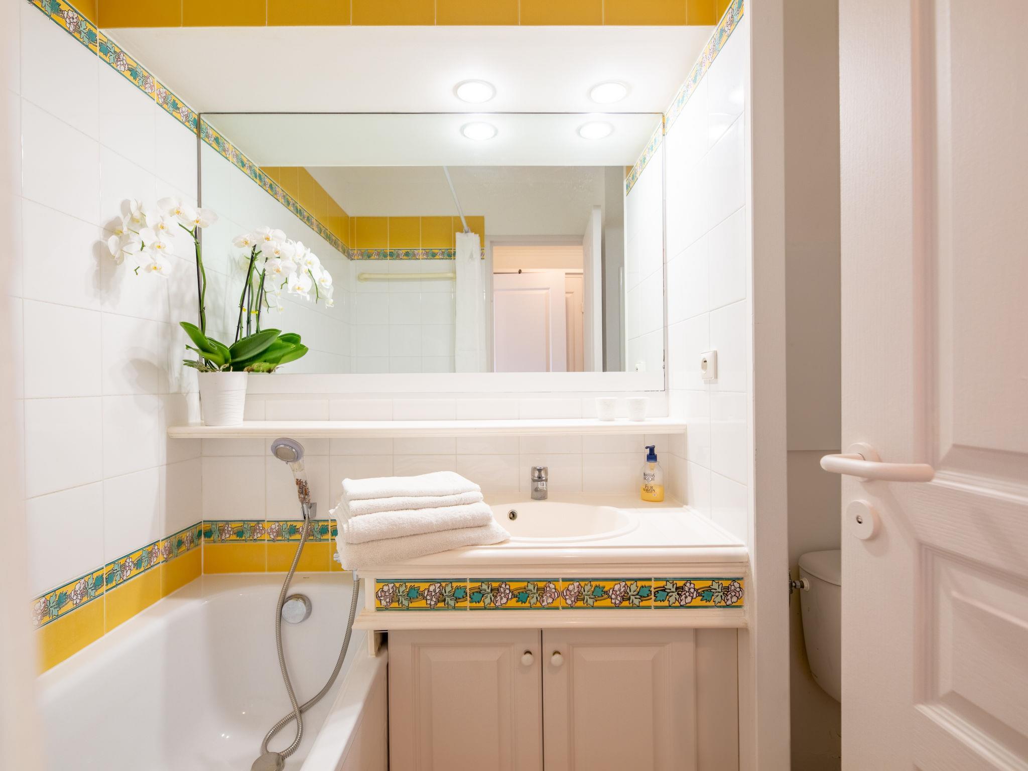 2-room apartment 35 m2, on the ground floor, south facing position. Comfortable and beautiful furnishings: living/dining room with 2 sofabeds (80 cm, length 190 cm), TV (flat screen). Exit to the terrace, to the patio. 1 room with 1 french bed (1 x 140 cm, length 190 cm). Open kitchen (dishwasher, 2 ceramic glass hob hotplates, toaster, kettle, electric coffee machine, Capsules for coffee machine (Tassimo) extra, combination microwave). Bath/WC. Electric heating. Terrace 8 m2 partly roofed. Terrace furniture. Facilities: safe, iron, baby cot, hair dryer. Internet (WiFi, extra). Parking space n 206, height 200 cm. Please note: non-smokers only. Smoke alarm. 83107000921OG