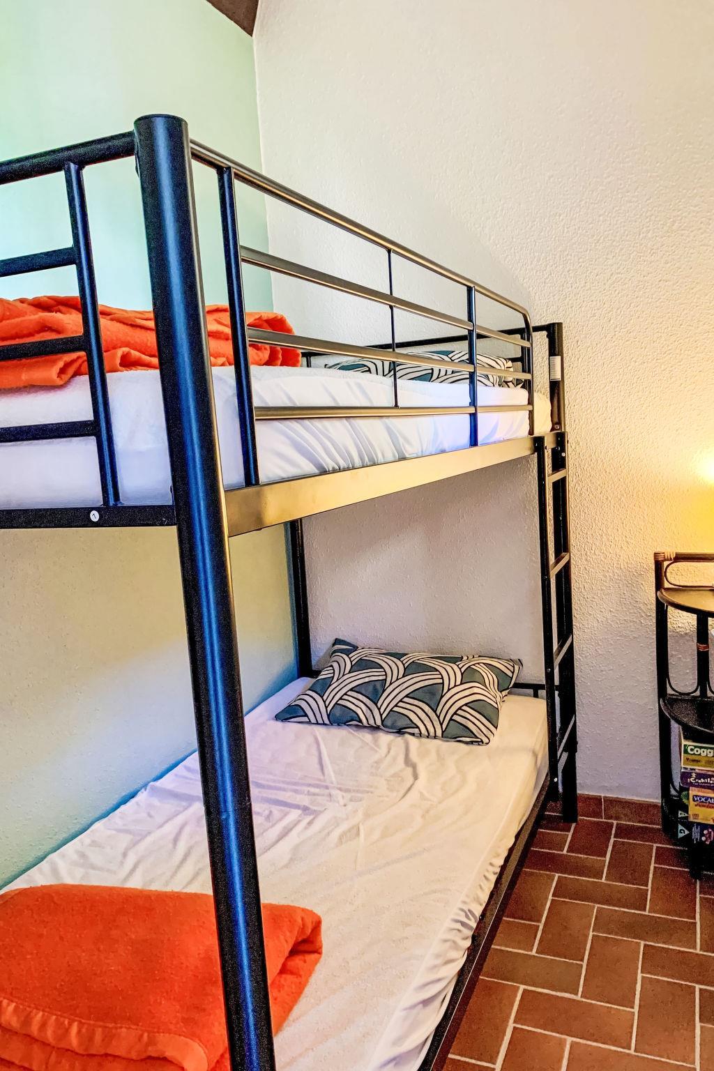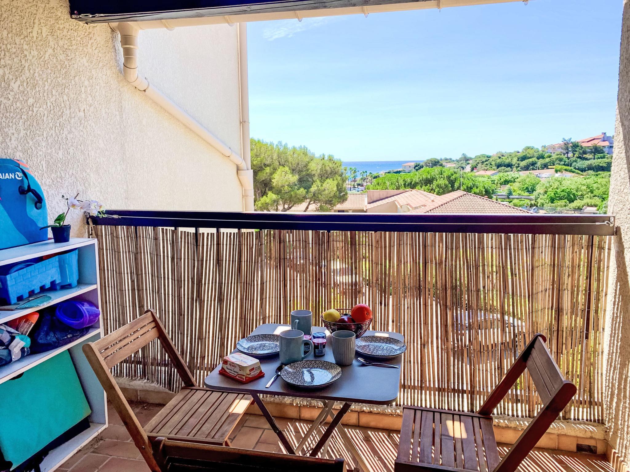 3-room apartment 30 m2 on 1st floor, south-east facing position. Object suitable for 2 adults + 2 children. Simple furnishings: living/dining room with panoramic window with TV (flat screen), fan. Exit to the terrace. 1 room with 1 french bed (1 x 140 cm, length 190 cm), fan. 1 small room with 1 x 2 bunk beds (90 cm, length 190 cm). Kitchenette (mini-oven, 2 ceramic glass hob hotplates, toaster, kettle, freezer, electric coffee machine, Capsules for coffee machine (SENSEO)). Exit to the terrace. Shower, sep. WC. Heating. Terrace 6 m2, roofed. Terrace furniture. View of the sea. Facilities: washing machine, hair dryer. Internet (WiFi, extra). Parking. Please note: suitable for families. TV only FR. Smoke alarm. Offer by a private individual according to Art. 155, IV of CGI. 83107002761QD
