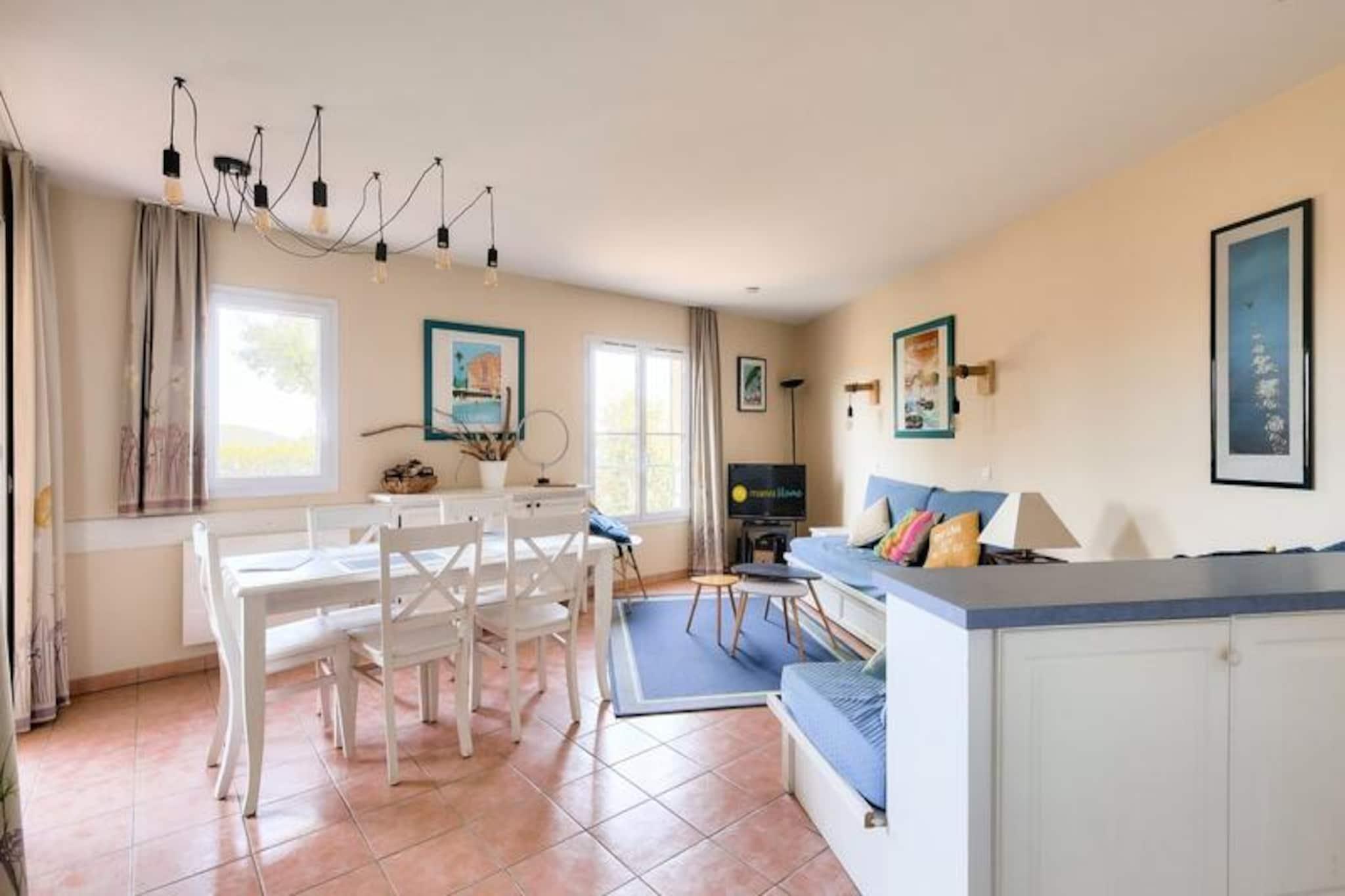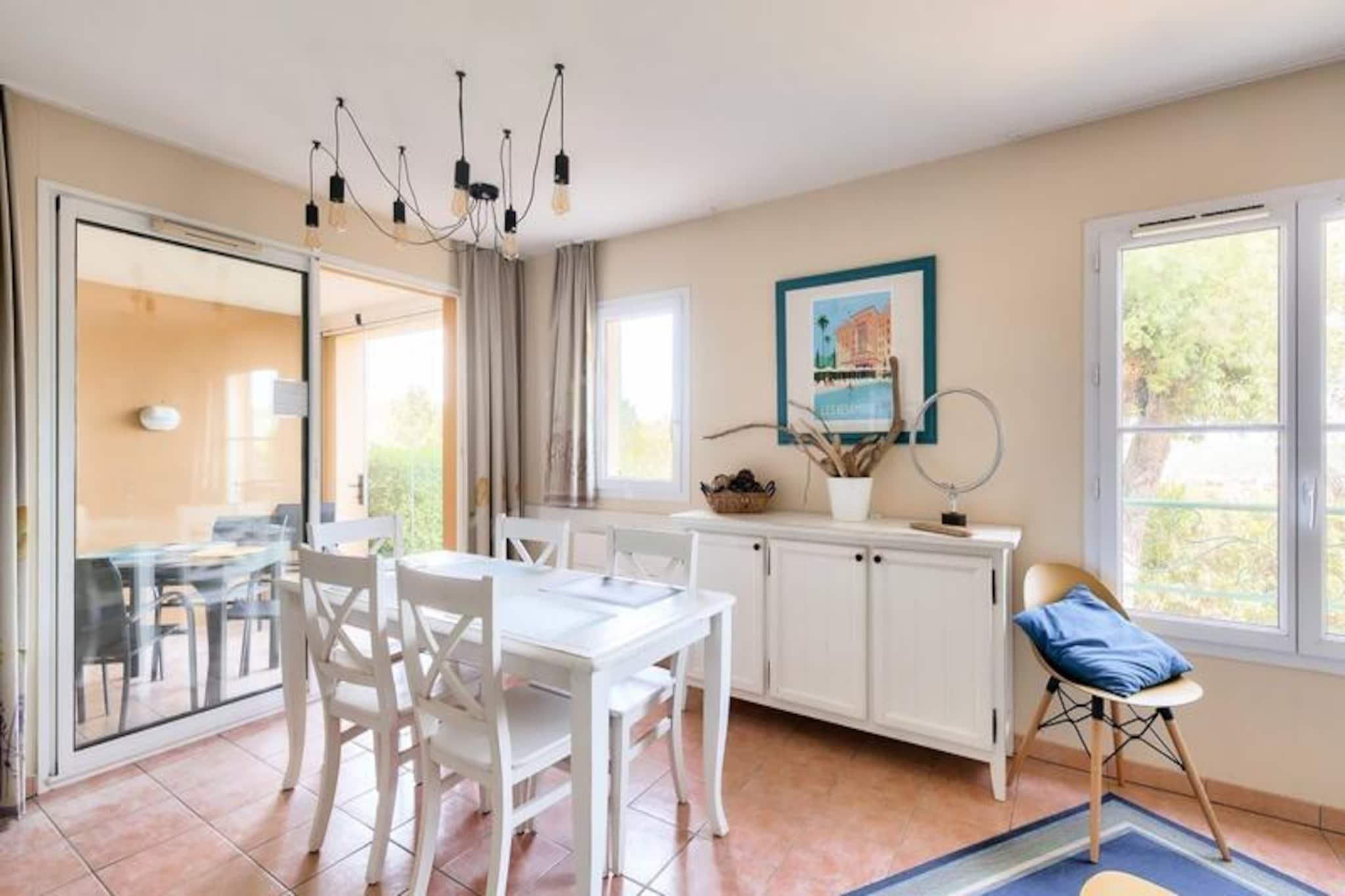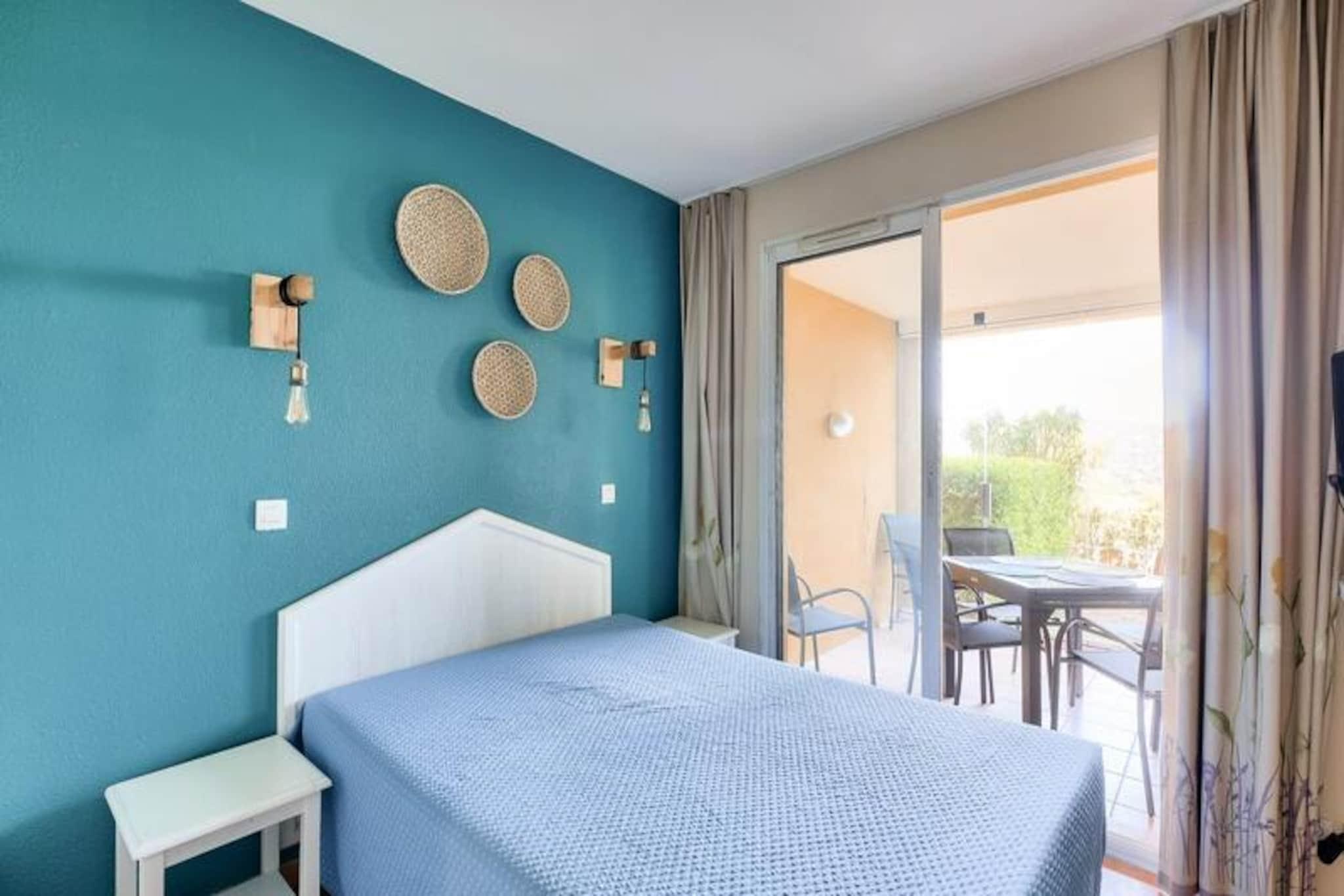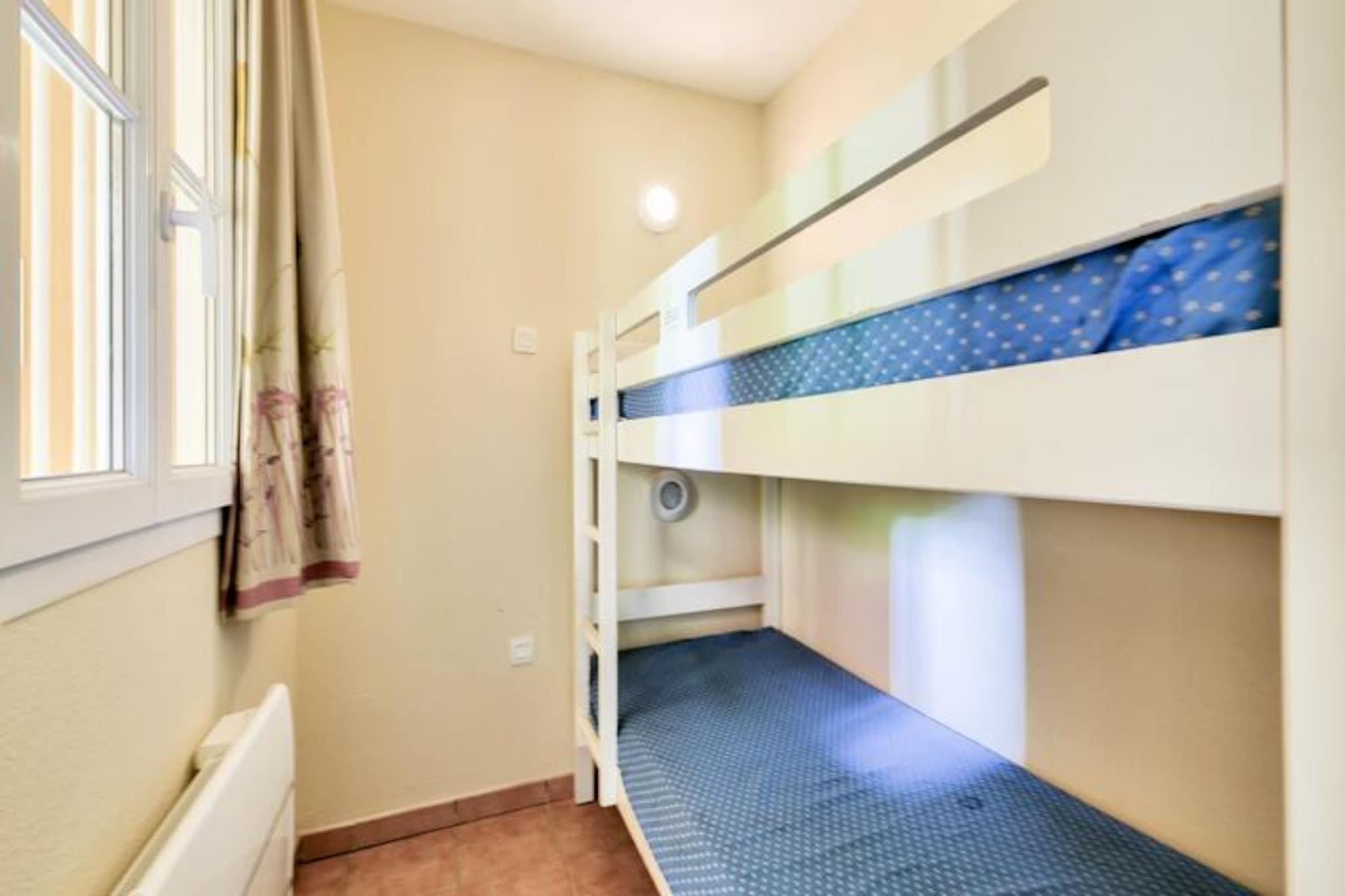 Maeva Home-residensen, som ligger over mer enn 15 hektar mellom Saint-Raphael og Saint-Tropez, tilbyr et vakkert og rolig tilfluktssted, bare noen få kilometer fra strendene i Sainte Maxime og Issambres. En tursti gir enkel tilgang til strendene, mens boligen har et utendørsbasseng som er åpent fra mai til september, med naturskjønn utsikt over havet og omkringliggende områder som Fréjus og Saint Raphael. Ulike vannaktiviteter som seiling, vannski, dykking og kajakkpadling er tilgjengelig for gjestene i nærheten. Denne leiligheten i 1. etasje har klimaanlegg, en overflate på ca. 47 m², og er designet for et komfortabelt opphold. Den inkluderer en stue med to sovesofaer og en uttrekkbar seng, et kjøkken som er åpent mot stuen, to soverom (ett med dobbeltseng og det andre med køyesenger), og et bad med badekar og toalett. En møblert overbygd terrasse med hage- og havutsikt tilbyr en avslappende plass, komplett med bord og seks stoler. Leiligheten gir også en reservert parkeringsplass og rikelig med lagringsplass. Gjestene kan også dra nytte av fasiliteter på stedet som et lekeområde for barn, tennisbaner (ekstra kostnad) og turstier. Tilleggstjenester inkluderer sengetøy, håndklær og sluttrengjøring, tilgjengelig mot en ekstra avgift. Kjæledyr er tillatt, og Wi-Fi er tilgjengelig mot et pristillegg. Eiendommen er et perfekt valg for de som leter etter en fredelig ferie med kvalitetstjenester og nærliggende rekreasjonsaktiviteter.