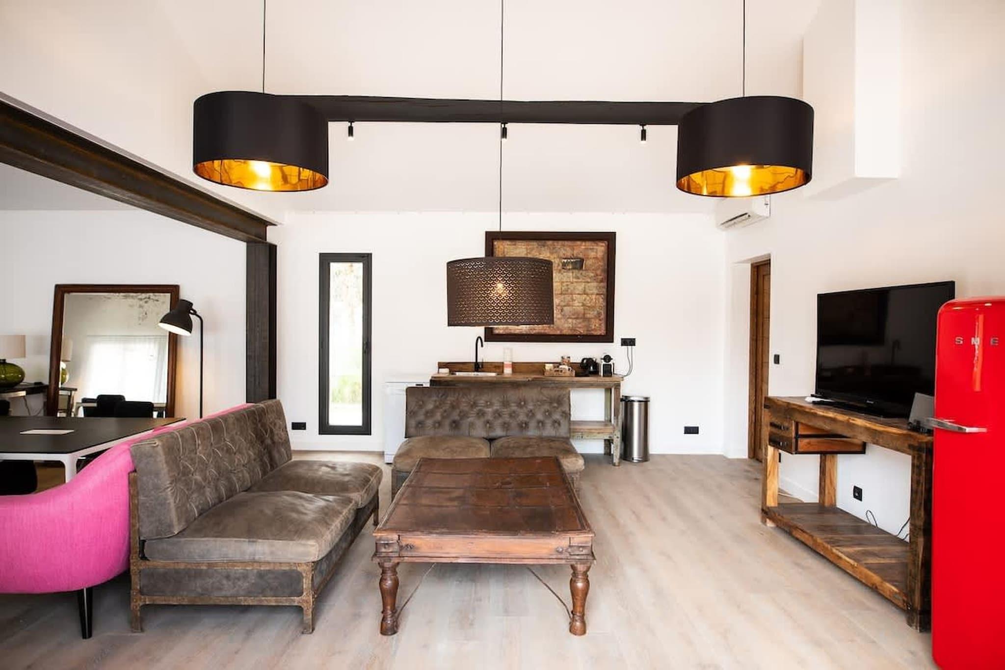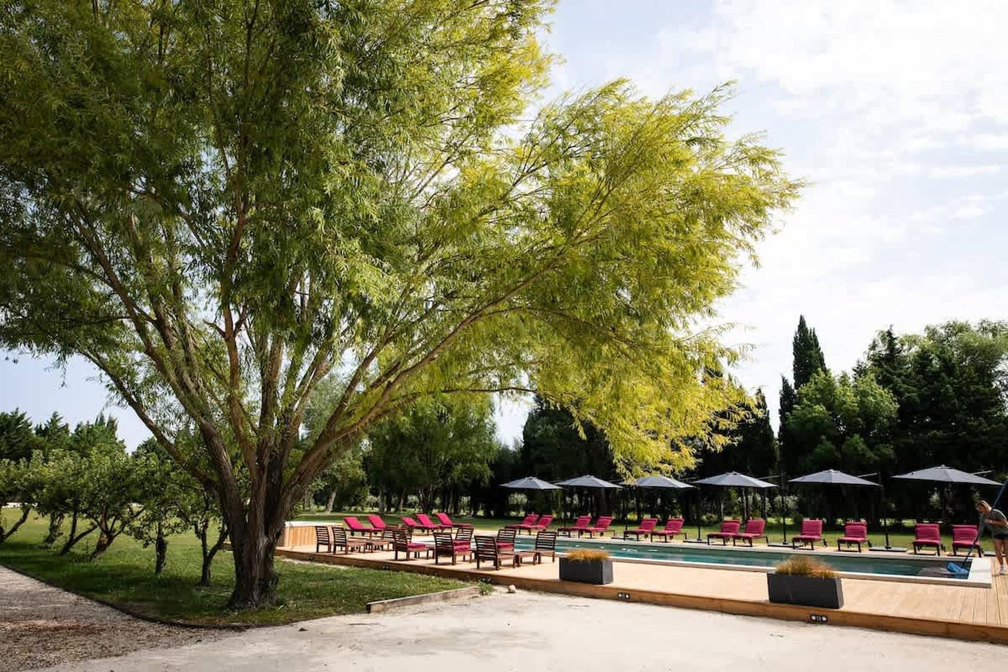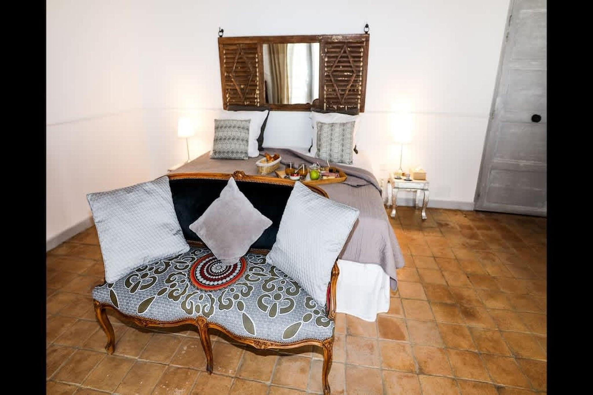 Du ankommer til et fredelig sørlig hjørne av Noves, hvor gater slynger seg gjennom gamle steinhus og lavendelduftende luft som driver forbi i skumringen. Denne villaen inviterer deg til å roe ned og omfavne landsbyen med dens rolige, men likevel fylte sjel, med middelalderporter, en romansk kirke, skyggefulle smug og enkel tilgang til landsbygda og småbylivet. Denne villaen er ekstravagant i sine fasiliteter, som inkluderer badstue, hammam, treningsstudio og til og med projektorrom. Den huser også et stort basseng, boblebad og et sommerkjøkken. Når du kommer inn gjennom hoveddøren, befinner du deg i en stor stue, forbundet med de fire romslige soverommene med king-size-senger, inkludert en liten hage, velutstyrte moderne bad og en terrasse med en parasoll hver. Det er en frittstående leilighet i gårdshuset med stue, privat terrasse og to soverom med king-size-senger og et fullt møblert bad, og en annen uavhengig suite i nærheten av bassenget med et dobbelt soverom og et ekstra rom med sovesofa, inkludert et bad for innkvartering av ekstra gjester. Det er ingen tilgang til kjøkkenet; I stedet vil vertinnen og kokken være tilgjengelige for å tilby deg måltider som oppfyller dine ønsker. Ytterligere fasiliteter inkluderer – Wi-Fi, klimaanlegg, en 1,7 hektar stor park for å utforske området, en vinkjeller og et vaskerom for enkelhets skyld. Under oppholdet ditt vil du finne deg selv omgitt av sjarmen til Noves, ta en spasertur gjennom smale middelaldersmåter, kikke på gamle voller og den 12. århundre kirken Saint Baudile, påminnelser om en dyp, rik historie. For naturelskere tilbyr det omkringliggende landskapet rolige fotturer, enkle kjøreturer til nærliggende provençalske byer, vingårder, markeder og grønne åssider.