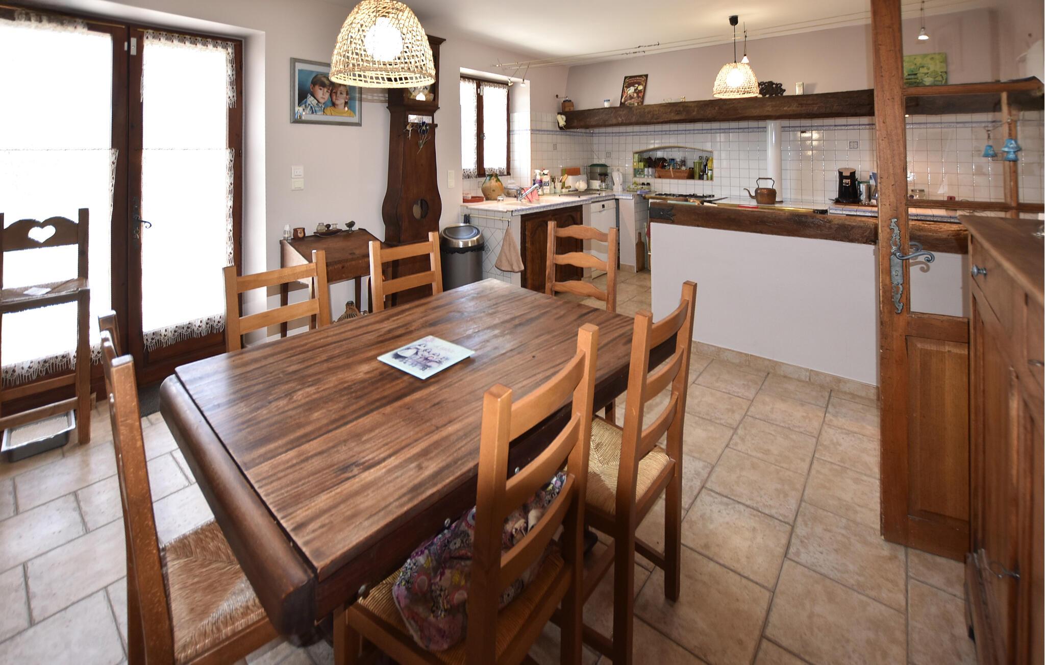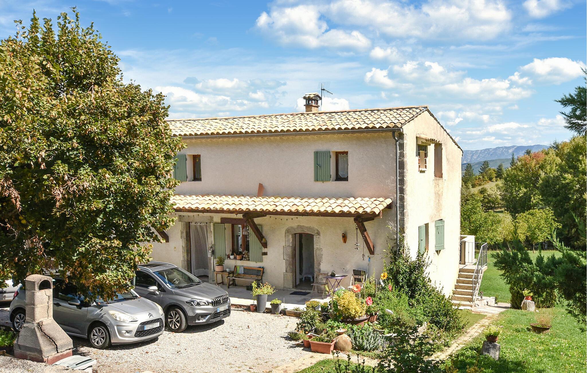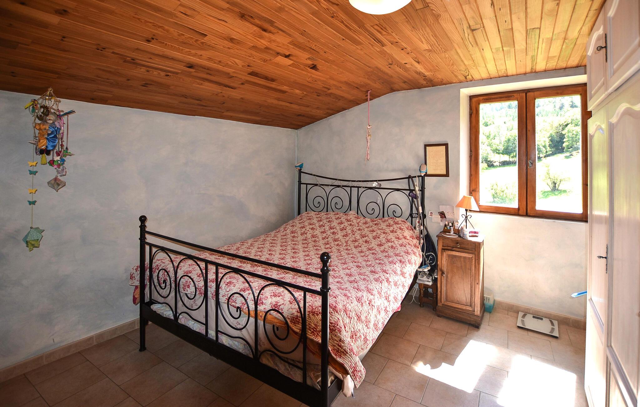 Opplev herlige feriestunder i dette sjarmerende landstedet, som byr på god plass og en fantastisk utsikt over fjellene rundt. Finn deg til rette i den romslige stuen med en koselig sofa, og nyt kveldene sammen ved spisebordet. Bruk det store spisekjøkkenet med sin rustikke sjarm til å tilberede deilige måltider.