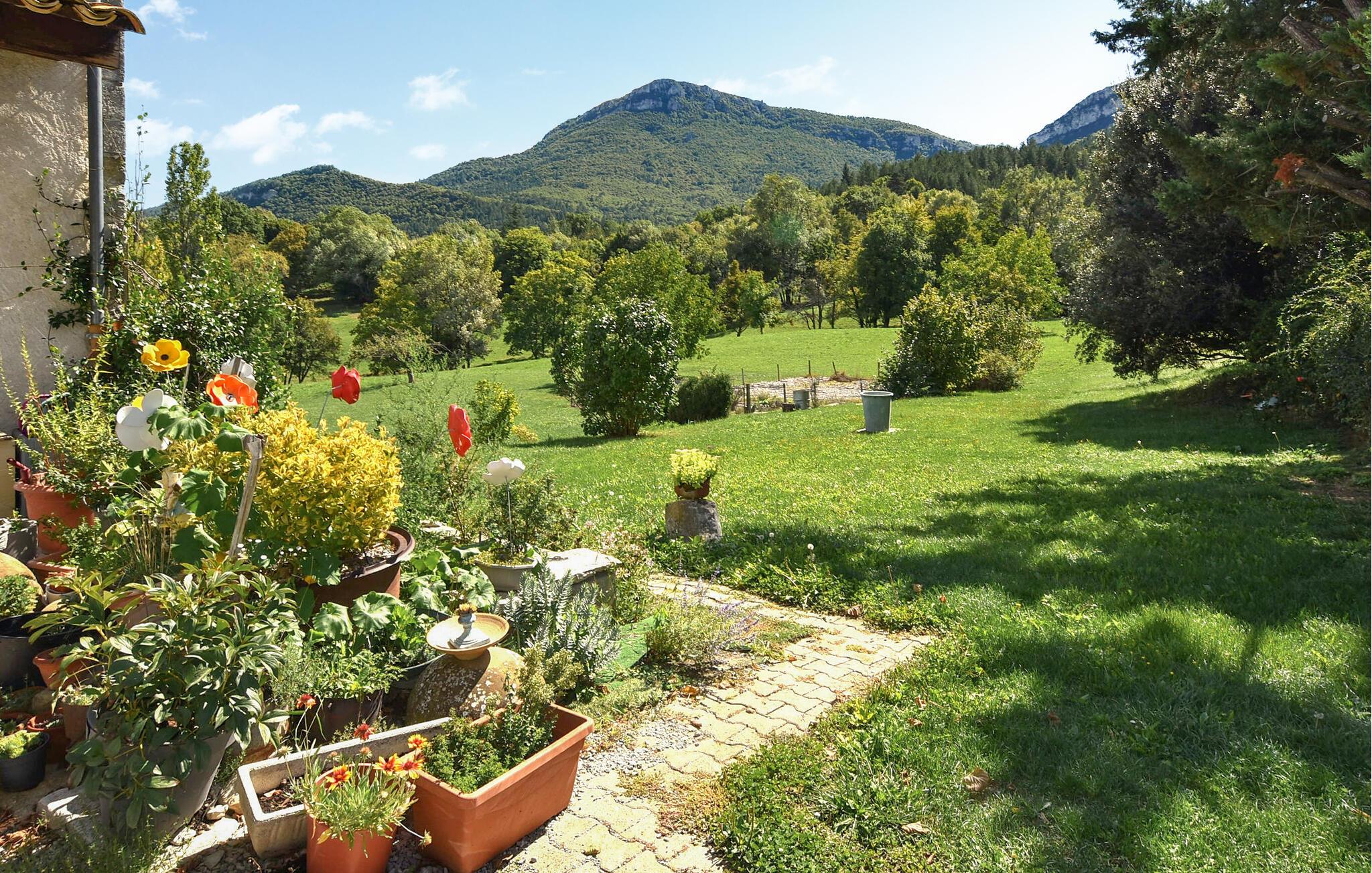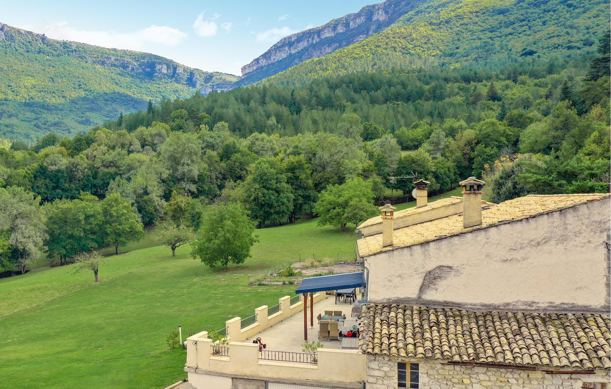 Gå ut på den romslige terrassen og nyt utsikten over den grønne dalen og fjellene. Ta med deg måltidene ut og slapp av under den overbygde pergolaen. Utforsk den store tomten med hage og blomstrende planter, og nyt roen i de landlige omgivelsene.