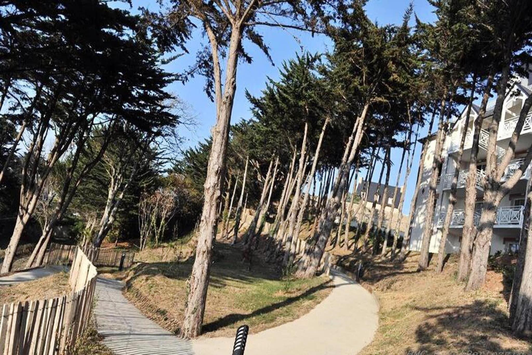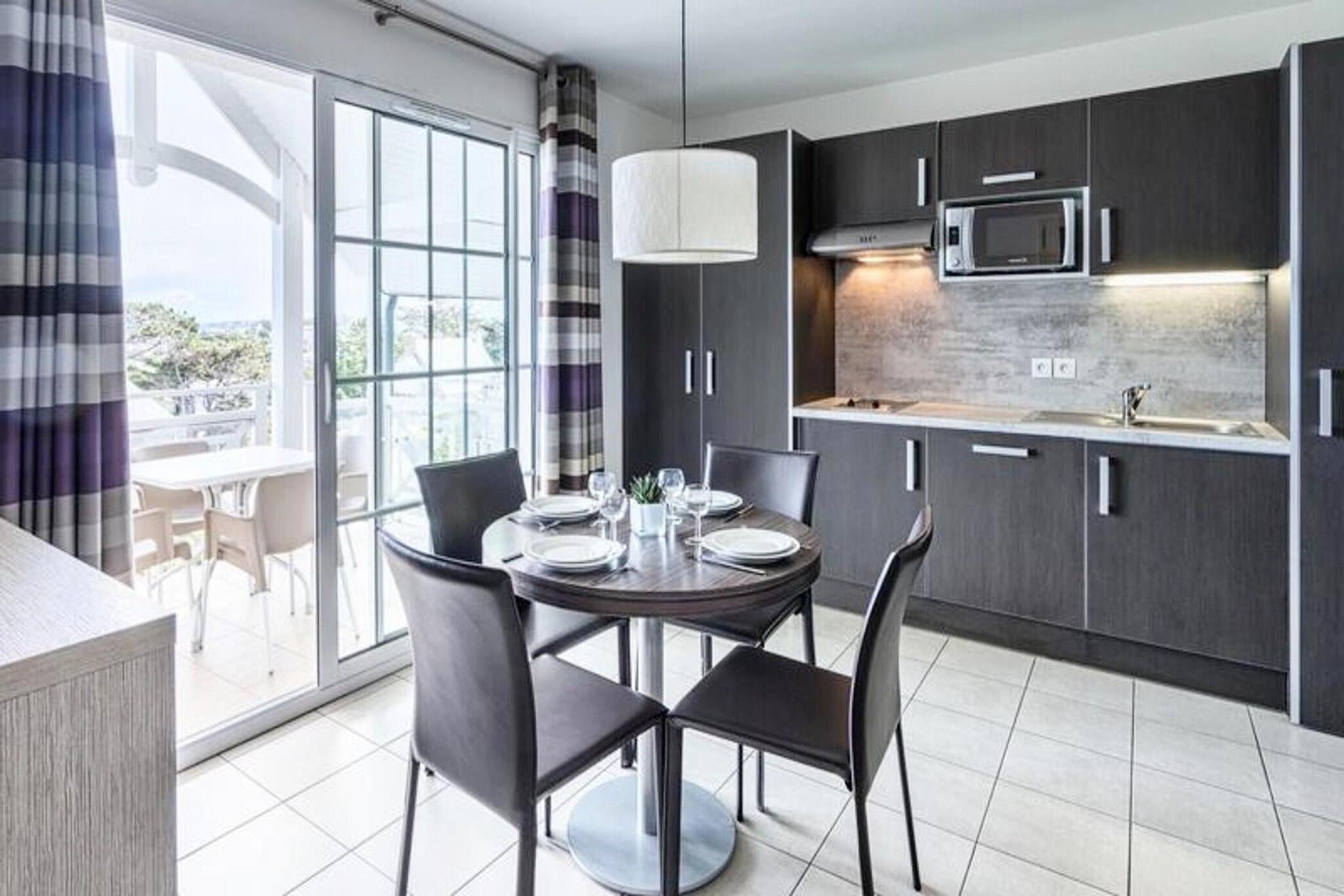 Denne sjarmerende leiligheten er ideell for 4 personer, og tilbyr et komfortabelt opphold med sideutsikt over havet. Den inkluderer et soverom med dobbeltseng, en alkove med køyesenger og et bad med WC. Leiligheten er kjæledyrvennlig, og tillater ett kjæledyr per opphold (unntatt for spesifikke raser), og tilbyr gratis Wi-Fi-tilgang, en TV og en privat utvendig parkeringsplass for ett kjøretøy. For familier er en barneseng tilgjengelig på forespørsel, og sengetøy og badehåndklær er inkludert. Leilighetens beliggenhet gir umiddelbar tilgang til Val André-stranden, noe som gjør den til et perfekt sted for strandelskere. Residensen ligger også i nærheten av kasinoet og andre viktige attraksjoner i denne pulserende badebyen. For avslapning kan du utforske det nærliggende Val André Marin Spa, kun 300 meter unna, som har et bredt utvalg av velværebehandlinger, et treningsområde og et hydroaktivt sjøvannsbasseng. Leiligheten er velutstyrt med kjøkken, slik at du kan tilberede dine egne måltider. Den har også et bad med WC. Ytterligere fasiliteter i boligen inkluderer muligheten for frokost mot et pristillegg, tilgang til badstue og sluttrengjøring for en problemfri opplevelse.