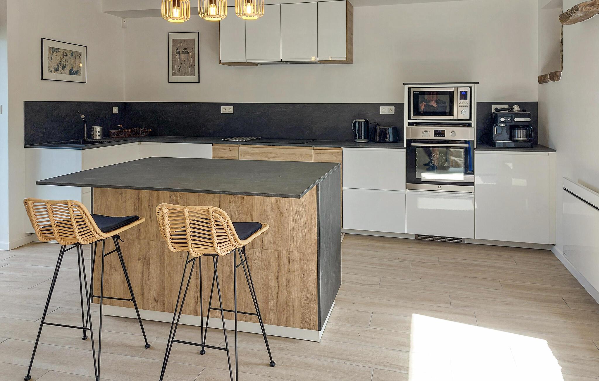 Velkommen til det stilfullt moderniserte historiske steinhuset, som har en ideell beliggenhet for utendørsaktiviteter og turer til stranden. Slapp av med familien i de koselige rommene, som er lyse og innbydende og smakfullt innredet med spesielle elementer. Start dagen med frokost på kjøkkenet med vakker utsikt over hagen.