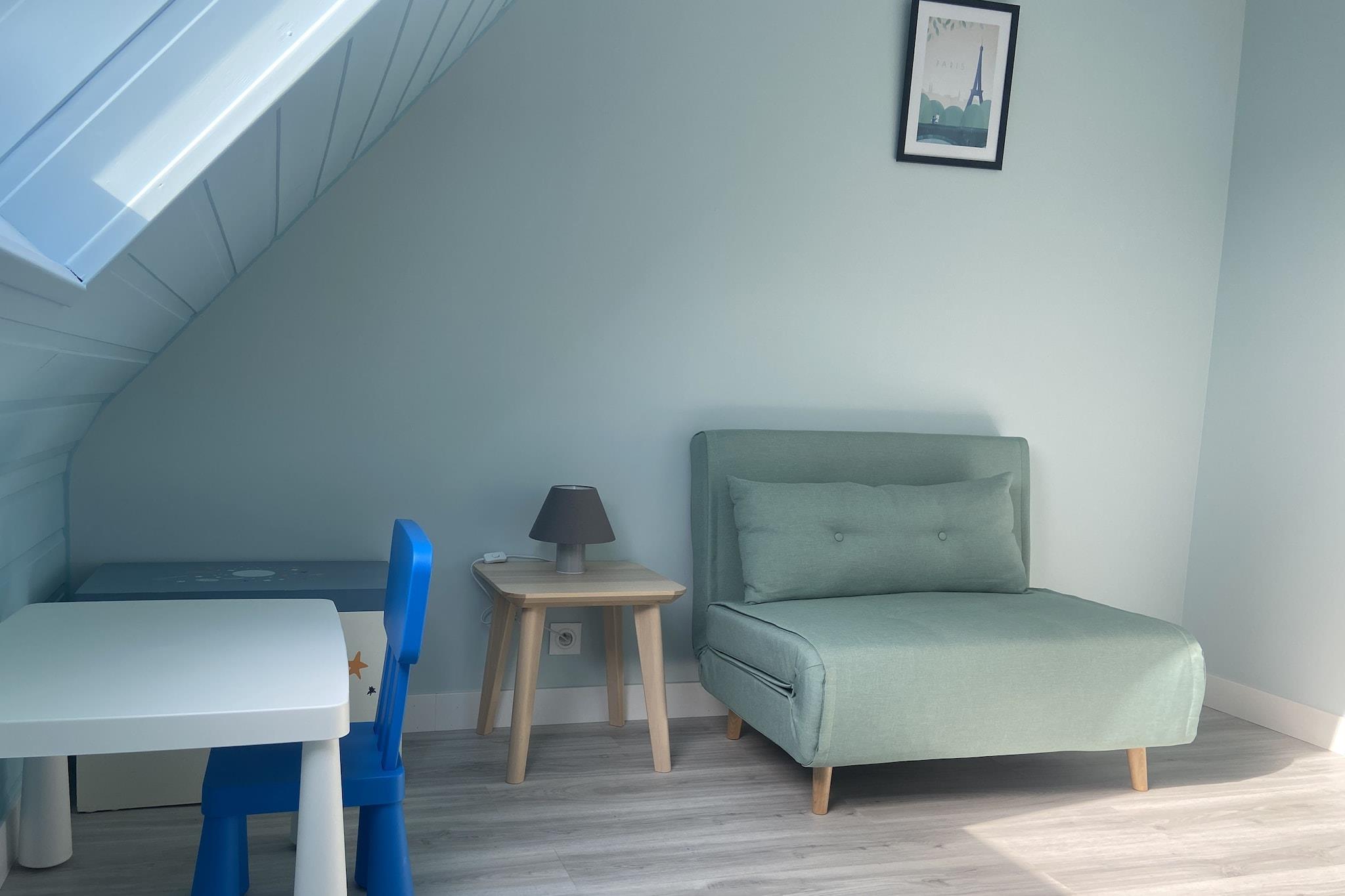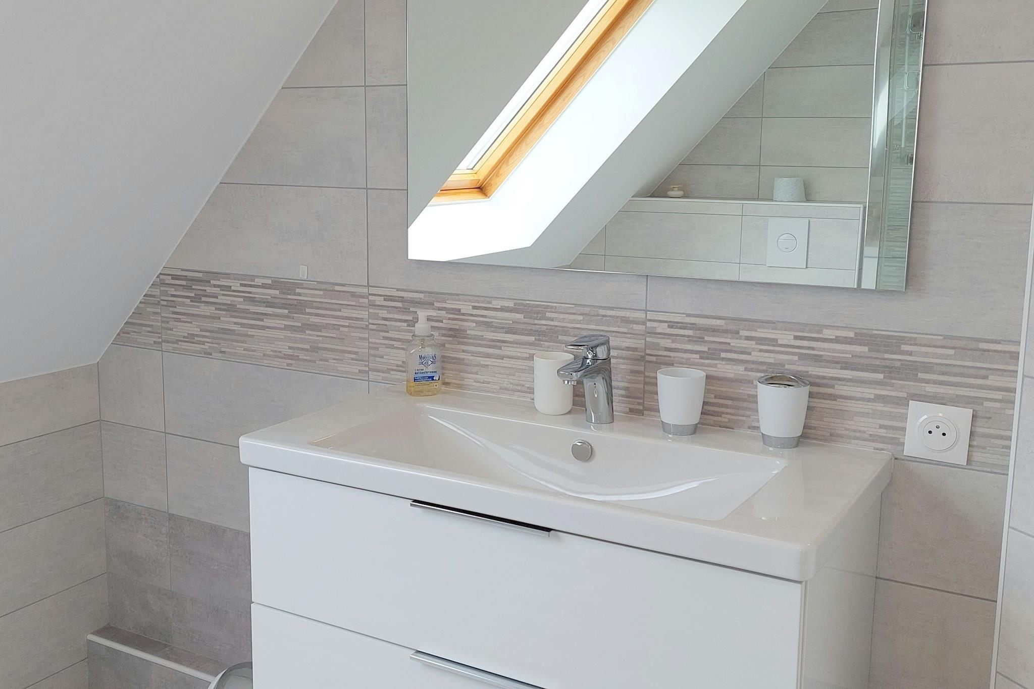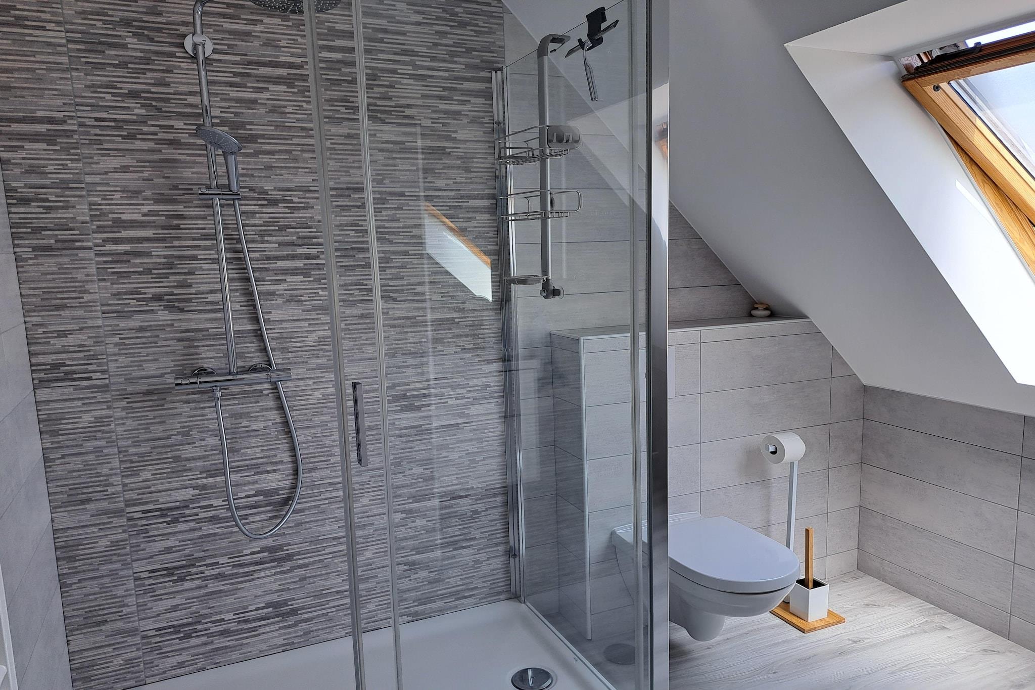 Første etasje: (Stue(TV(Ingen tyske TV-kanaler)), åpent kjøkken(vannkoker, brødrister, komfyr(induksjon), kaffetrakter, stekovn, mikrobølgeovn, oppvaskmaskin, kjøleskap med fryser), WC, oppbevaringsrom) i 2. etasje: (soveværelse(dobbeltseng(160 x 200 cm)), soveværelse(dobbeltseng(140 x 190 cm)), soveværelse(dobbeltseng(140 x 190 cm)), bad(dusj, toalett)) babybadekar, sprinkelseng, vaskemaskin, oppvarming, terrasse, hage(delvis inngjerdet, 600 m2), hagemøbler, grill, parkering, bordfotball, høy barnestol, terrassemøbler