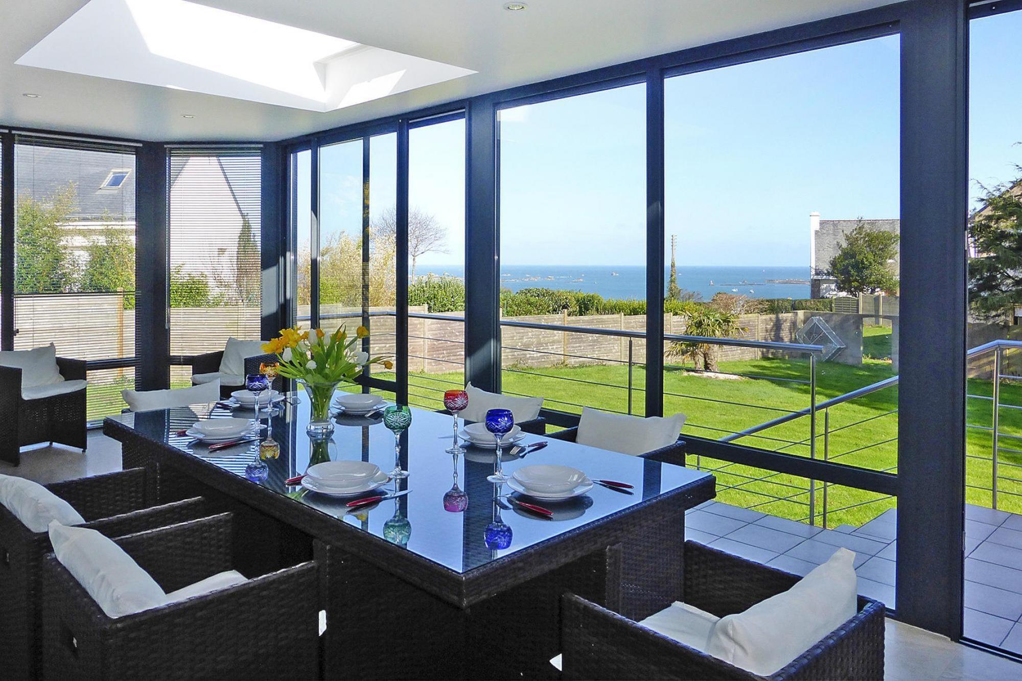 Rolig beliggende feriehus med en fantastisk utsikt over havet og offshore-øya Brehat. Høydepunktet i det ellers ganske klassiske huset er den moderne, lyse verandaen, som raskt vil bli ditt favorittsted. Selv i lavsesongen får man inntrykk av å «spise ute». Se skipene gå forbi og nyt panoramaet som endrer seg med tidevannets rytme. La deg forføre av den vakre blomsterøya Brehat, som byr på utallige fotomuligheter. Den store, inngjerdede hagen tilbyr god plass for barn å leke og for din firbeinte venn å løpe rundt (hunder er også tolerert på noen strender på denne kysten). På aperitiff-tid vil du gjerne nyte et typisk fransk spill boule. Ploubazlanec og litt lenger Paimpol er steder preget av fiske. Her kan du kjøpe deilig fersk fisk og sjømat eller smake på gode spesialitetsrestauranter. På noen få minutter med bil kan du også nå startpunktet for blomsterøya Brehat, en uforglemmelig utflukt som vi absolutt anbefaler. De omkringliggende bretonske byene Tréguier og Lezardrieux er verdt et besøk. Litt lenger sør ligger den populære badebyen St. Quay Portrieux med sitt sjøvannsbasseng og vakre hvite sandstrender.
