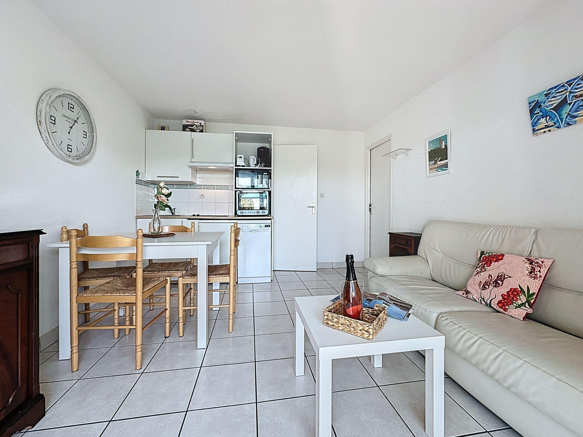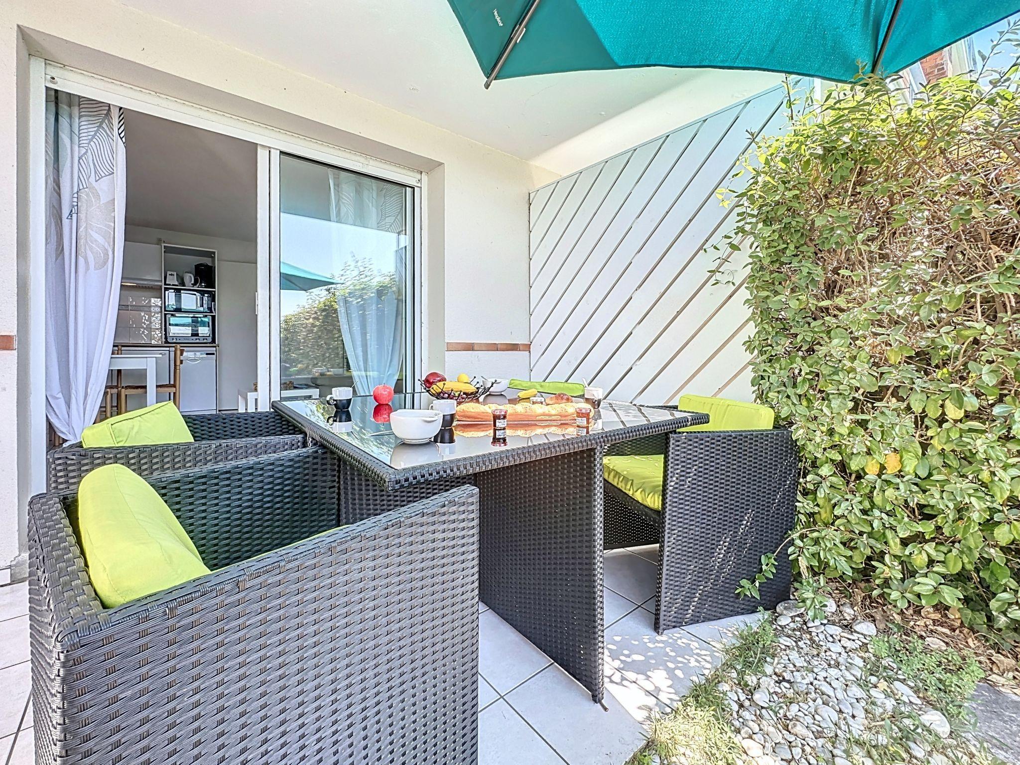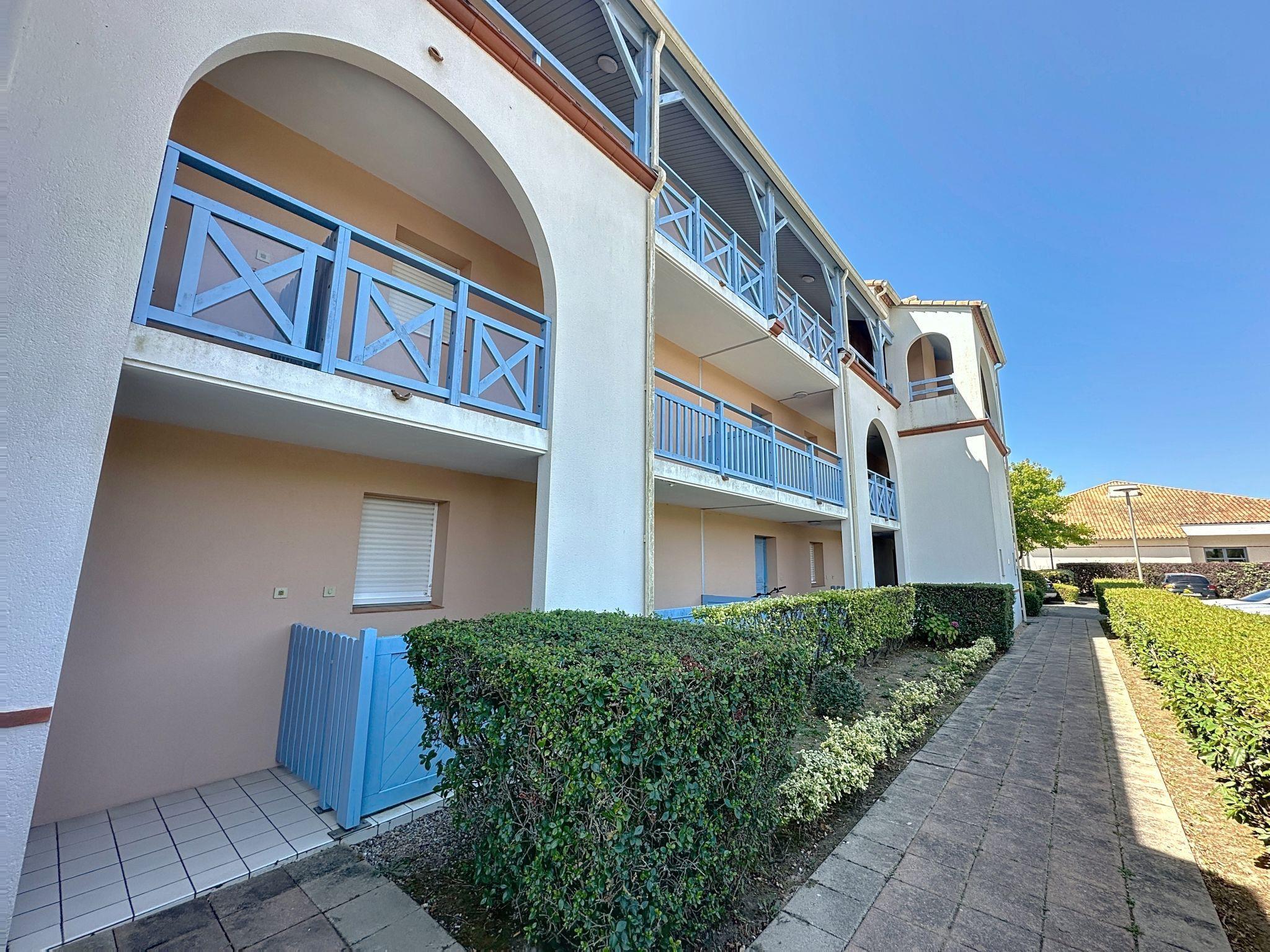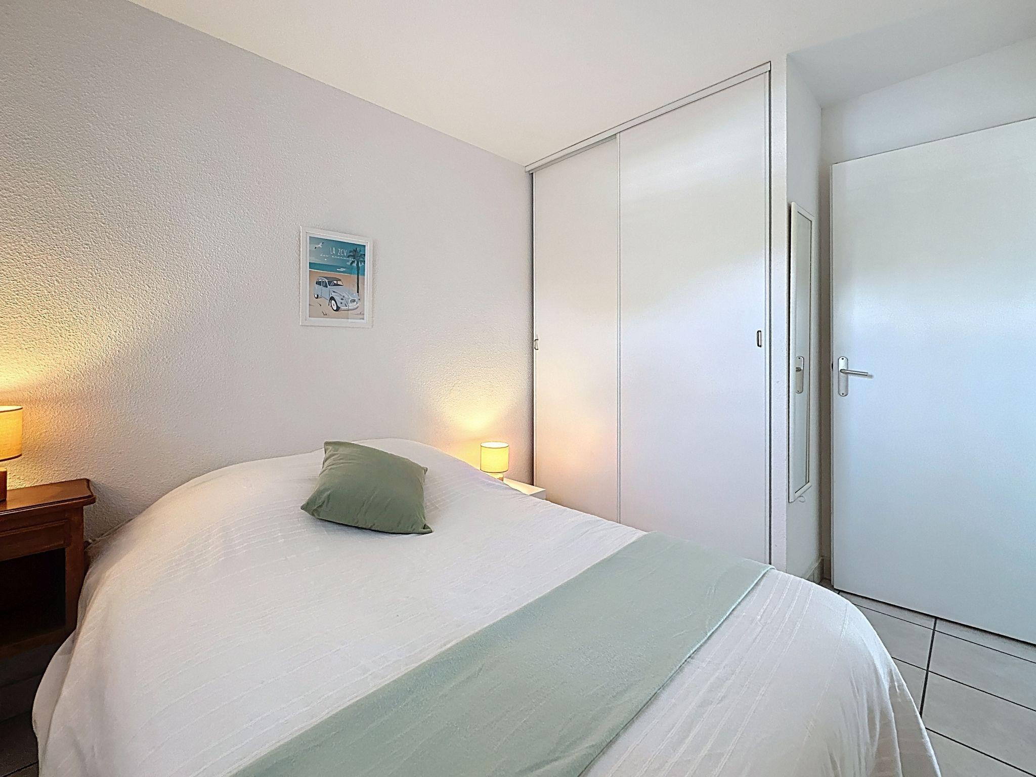 "Appt n°5", 2-room apartment 28 m2, on the ground floor, south facing position. Object suitable for 2 adults + 2 children. Living/dining room with TV (flat screen), DVD and DVD collection available. Exit to the terrace, to the patio, south facing position. 1 room with 1 french bed (1 x 140 cm, length 190 cm). Entrance hall with 1 x 2 bunk beds (80 cm, length 190 cm). Open kitchen (mini-oven, oven, dishwasher, 2 ceramic glass hob hotplates, toaster, kettle, microwave, electric coffee machine). Bathroom, sep. WC. Electric heating. Terrace 6 m2, south facing position, patio 15 m2, south facing position. Terrace furniture. View of the swimming pool and golf course. Facilities: hair dryer. Internet (WiFi, extra). Parking space n 5 (1 car). Please note: non-smokers only. Maximum 1 pet/ dog allowed. Smoke alarm. Offer by a private individual according to Art. 155, IV of CGI. 44131001270N4