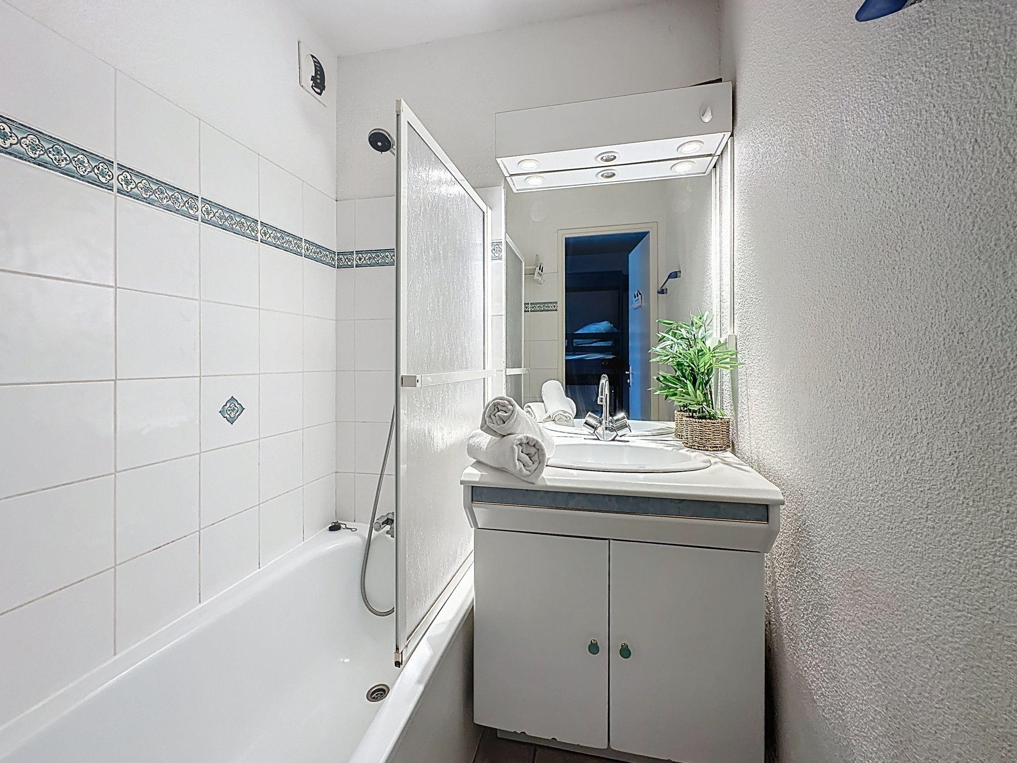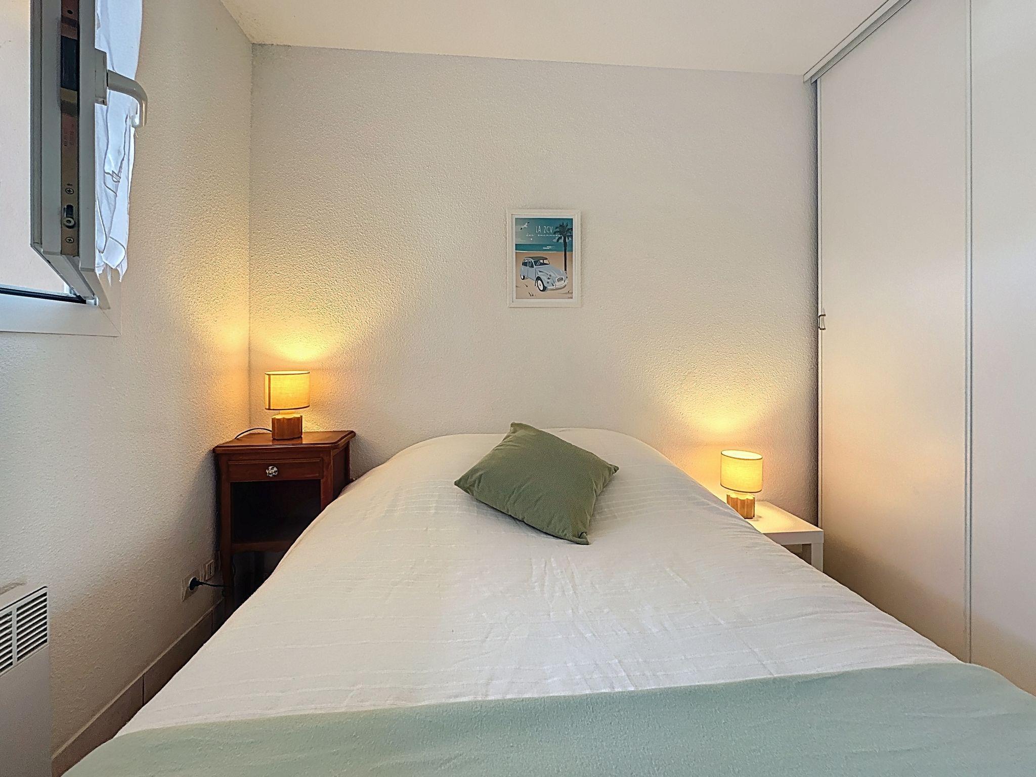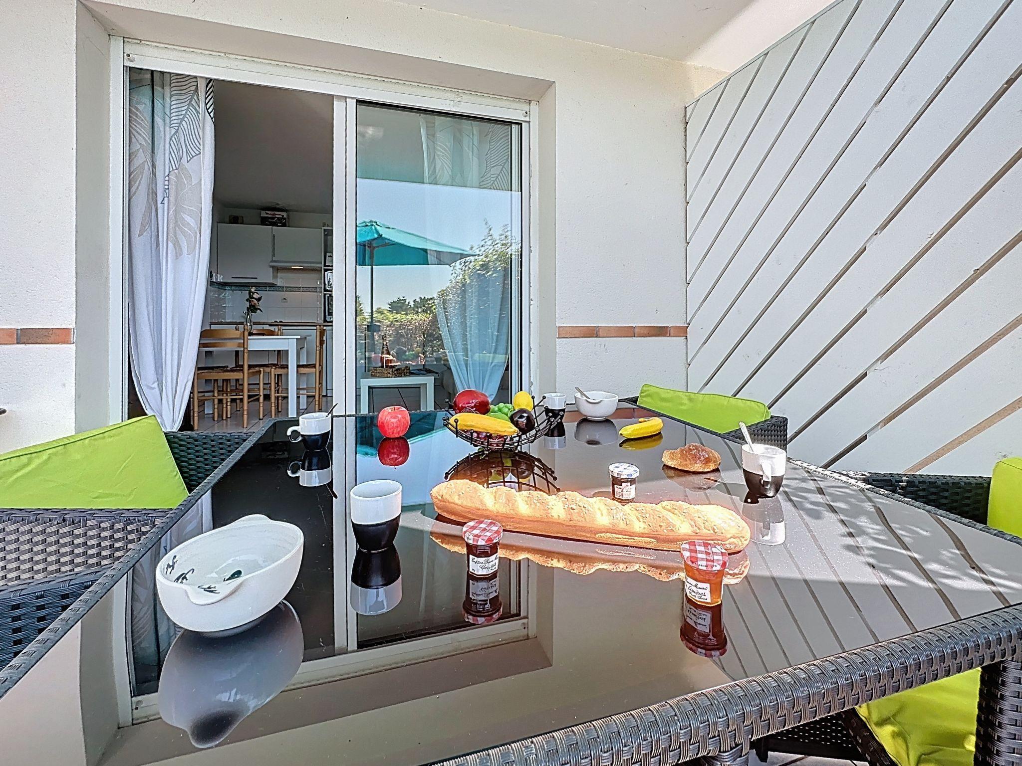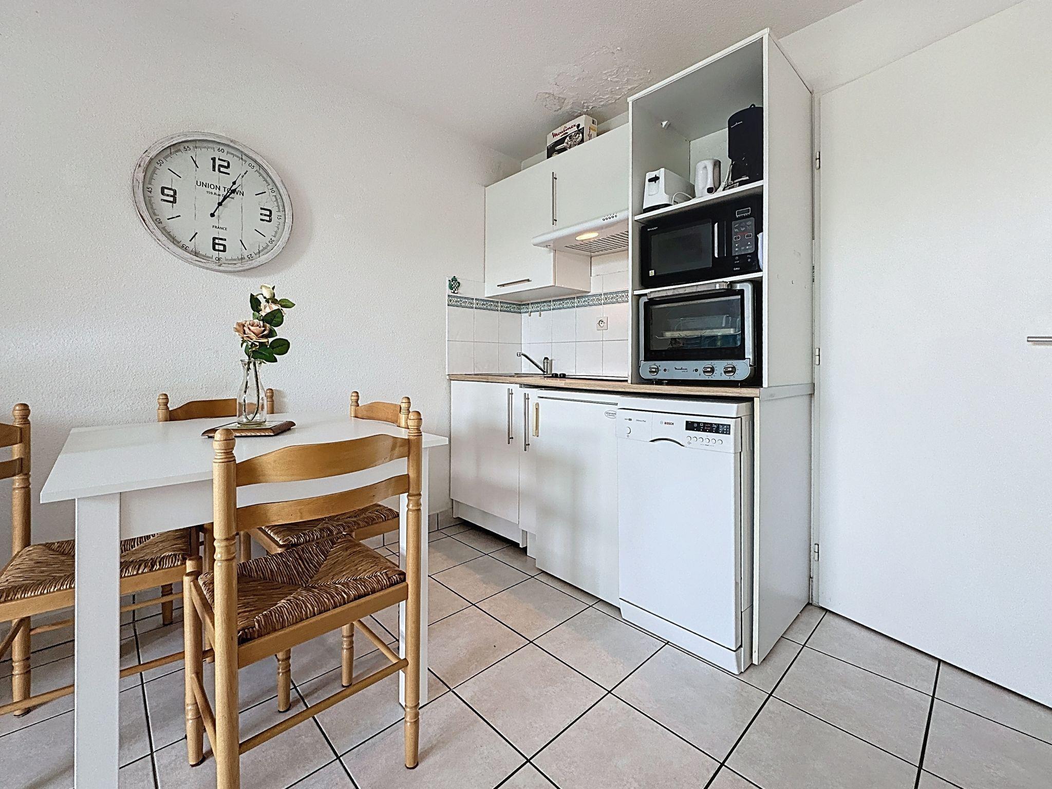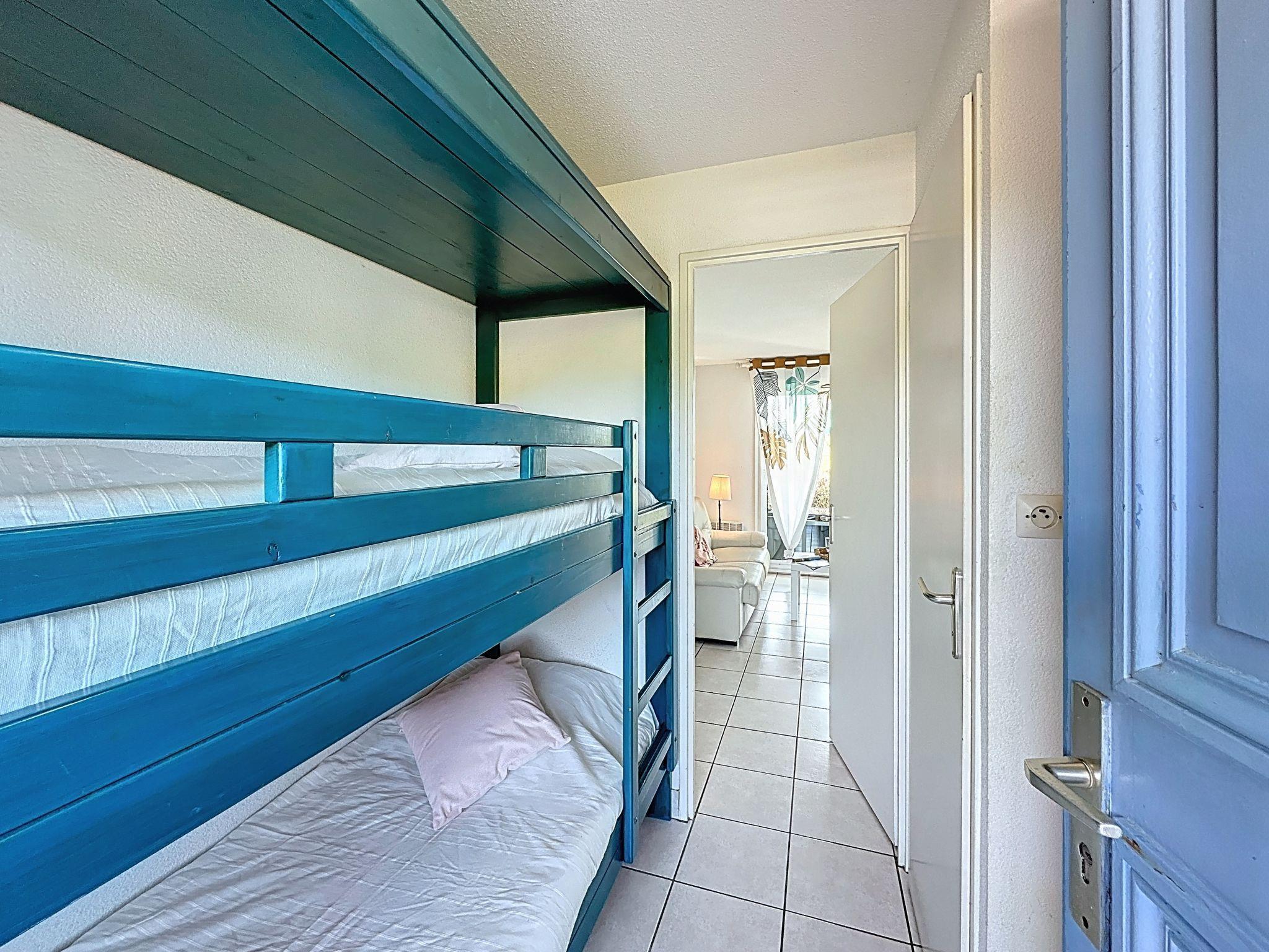 "Appt n°5", 2-room apartment 28 m2, on the ground floor, south facing position. Object suitable for 2 adults + 2 children. Living/dining room with TV (flat screen), DVD and DVD collection available. Exit to the terrace, to the patio, south facing position. 1 room with 1 french bed (1 x 140 cm, length 190 cm). Entrance hall with 1 x 2 bunk beds (80 cm, length 190 cm). Open kitchen (mini-oven, oven, dishwasher, 2 ceramic glass hob hotplates, toaster, kettle, microwave, electric coffee machine). Bathroom, sep. WC. Electric heating. Terrace 6 m2, south facing position, patio 15 m2, south facing position. Terrace furniture. View of the swimming pool and golf course. Facilities: hair dryer. Internet (WiFi, extra). Parking space n 5 (1 car). Please note: non-smokers only. Maximum 1 pet/ dog allowed. Smoke alarm. Offer by a private individual according to Art. 155, IV of CGI. 44131001270N4