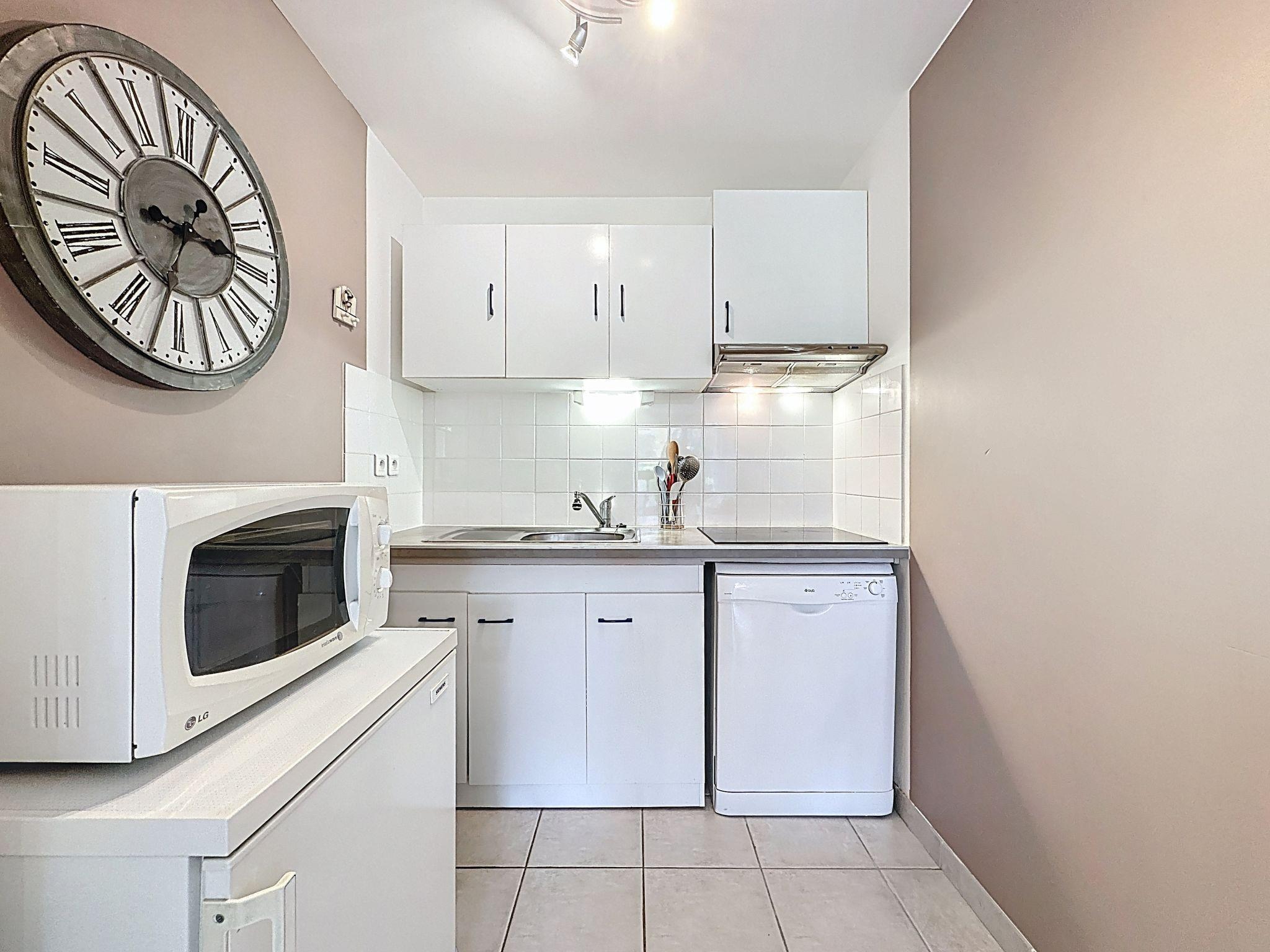 "Le Clos de la Corderie", 2-room apartment 46 m2, on the ground floor, west facing position. Spacious, modern furnishings: living/dining room with 1 double sofabed (1 x 140 cm, length 190 cm), TV (flat screen). Exit to the terrace, to the patio, west facing position. 1 room with 1 french bed (1 x 160 cm, length 200 cm). Exit to the terrace, to the patio, west facing position. Open kitchen (dishwasher, 4 ceramic glass hob hotplates, toaster, kettle, microwave, electric coffee machine). Bathroom, sep. WC. Electric heating. Terrace 20 m2, west facing position, patio 25 m2, west facing position. Terrace furniture. Facilities: washing machine, iron, hair dryer. Internet (WiFi, free). Parking space n 27 (roofed, 1 car). Please note: non-smokers only. Smoke alarm. Offer by a private individual according to Art. 155, IV of CGI. 44131001317DU