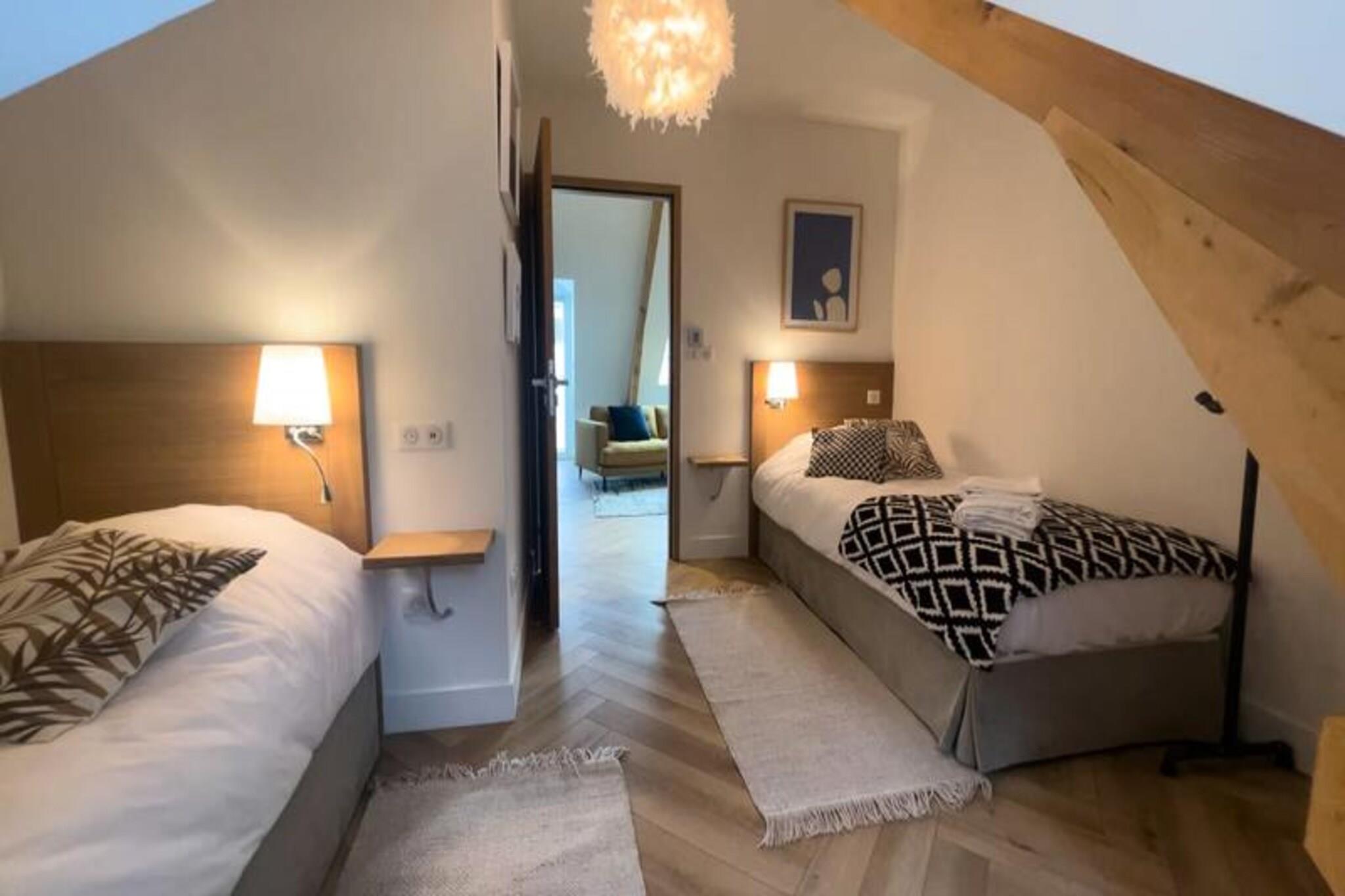 Denne T3-leiligheten kombinerer komfort p? hotellniv? med privatlivet til et feriehus. Ligger i 3. etasje i en hundre ?r gammel bygning, og har 2 soverom med utsikt over furutr?r og villaer ved sj?en. Leiligheten har klimaanlegg, komfortable senger, kvalitetssenget?y og eget bad med dusj og toalett. En vaskemaskin/t?rketrommel er inkludert for ekstra bekvemmelighet. Wi-Fi er tilgjengelig i hele leiligheten, og tilleggstjenester som parkering, et spa-hamam-omr?de eller massasjer er tilgjengelig mot et pristillegg. Kj?ledyr er velkomne mot et gebyr. Leiligheten ligger i Pornichet, n?r stranden, som deles med La Baule, og den livlige marinaen. Utforsk det lokale kasinoet og pulserende nabolag, eller bes?k n?rliggende attraksjoner som Gu?rande, saltmyrene og Bri?re Regional Park. Leiligheten tilbyr ogs? enkel tilgang til Saint-Nazaires skipsbyggingshistorie, Le Croisics fiskehavner og Morbihan-bukten. Leiligheten har et fullt utstyrt kj?kken med stekeovn, mikrob?lgeovn, oppvaskmaskin, kj?leskap og fryser, ideelt for ? tilberede m?ltider for opptil 5 personer. Gjestene kan nyte m?ltider innend?rs eller g? ut p? den felles balkongterrassen, som tilbyr fantastisk utsikt over havet og omr?det rundt.