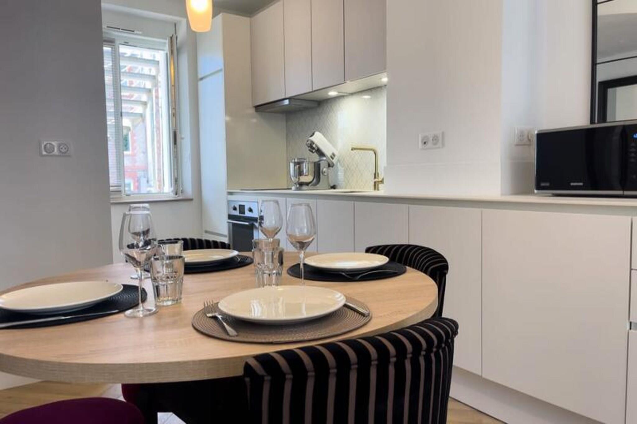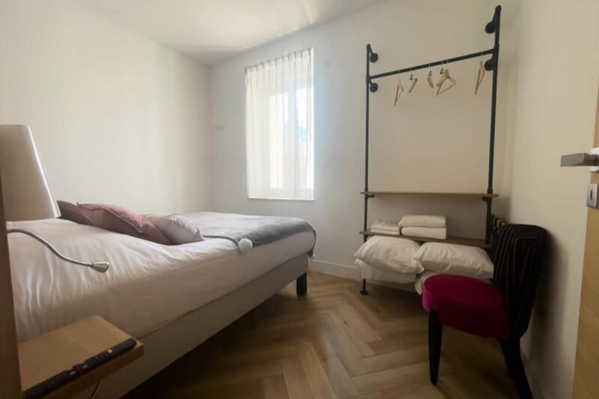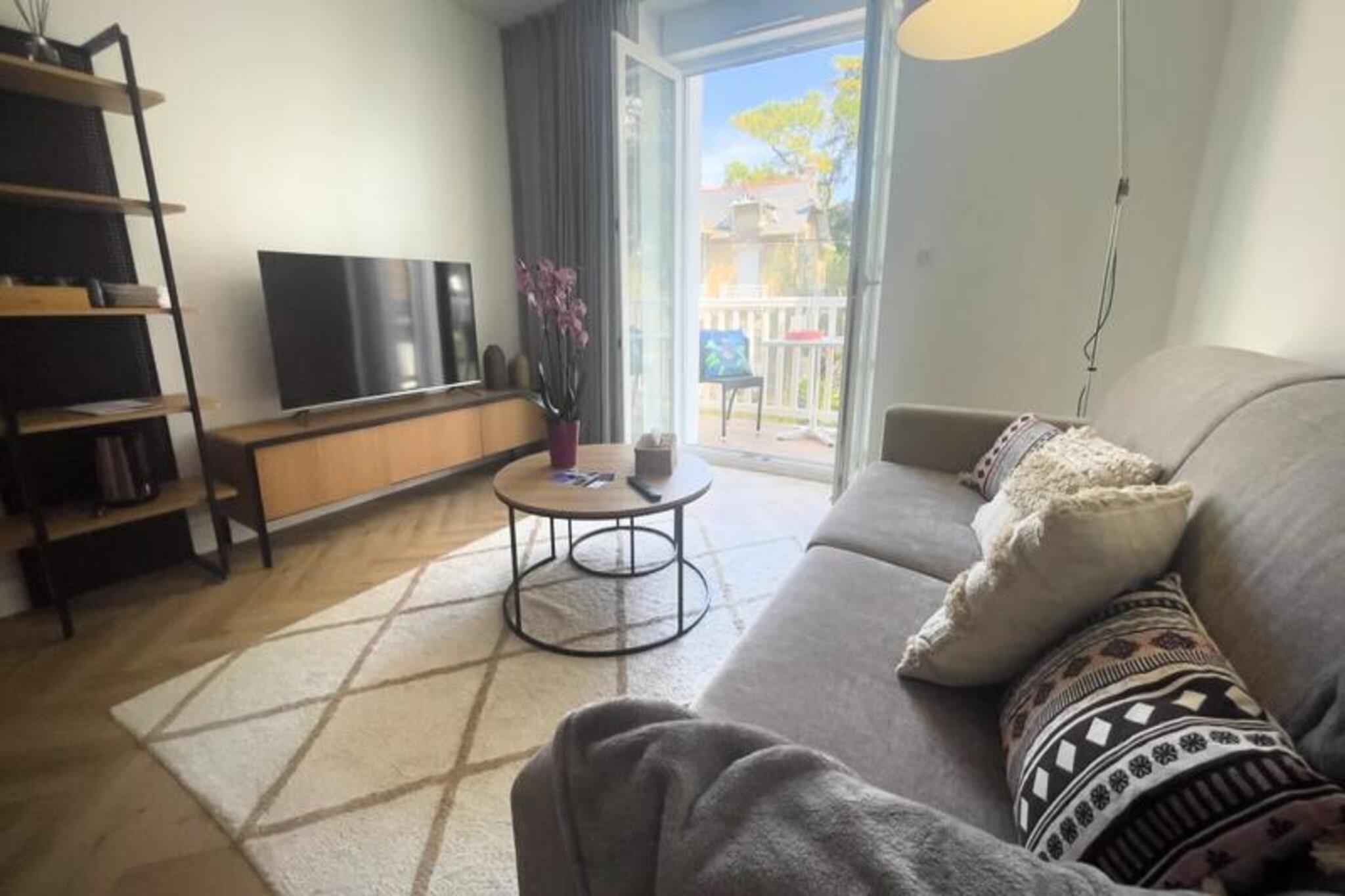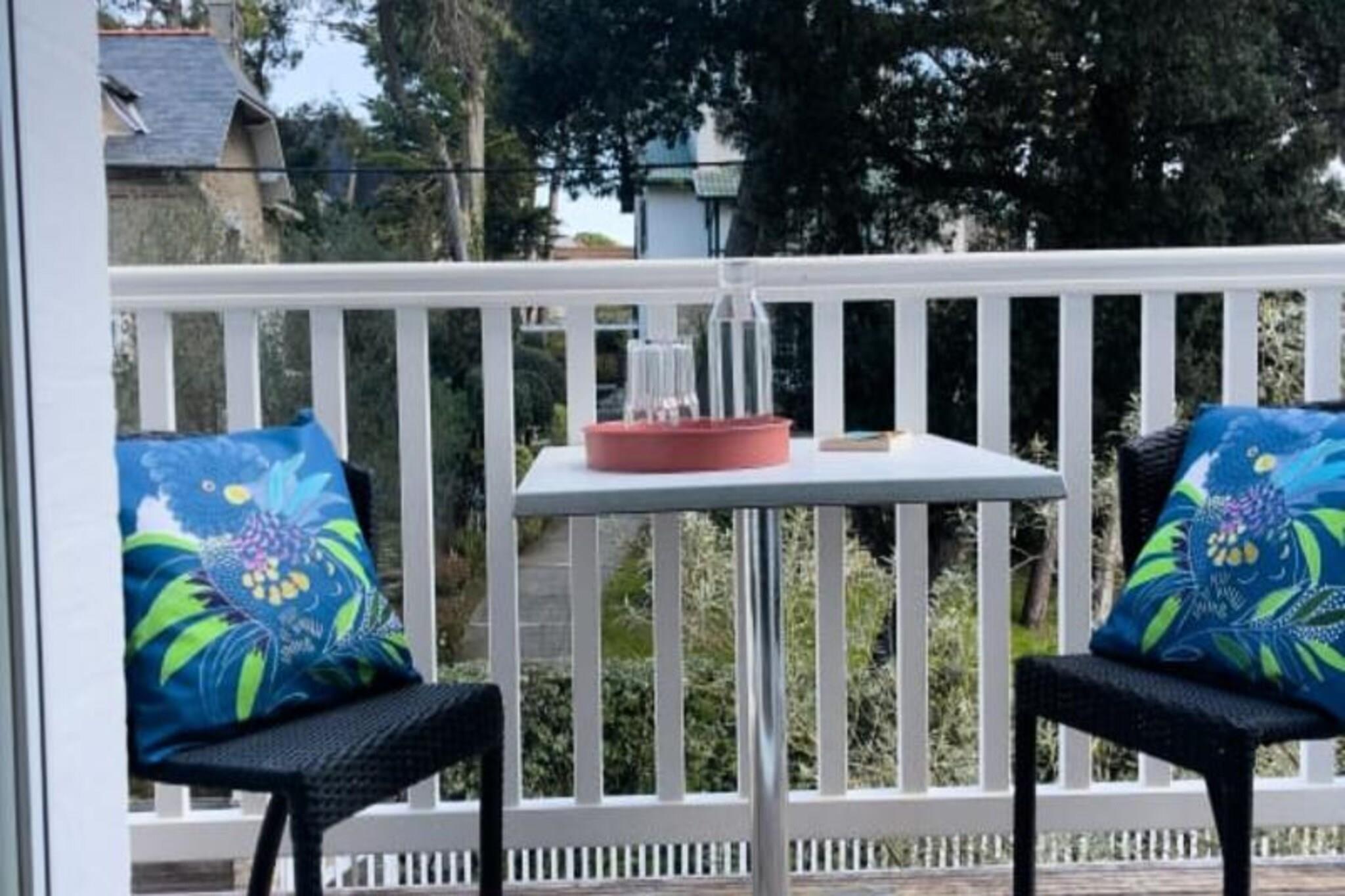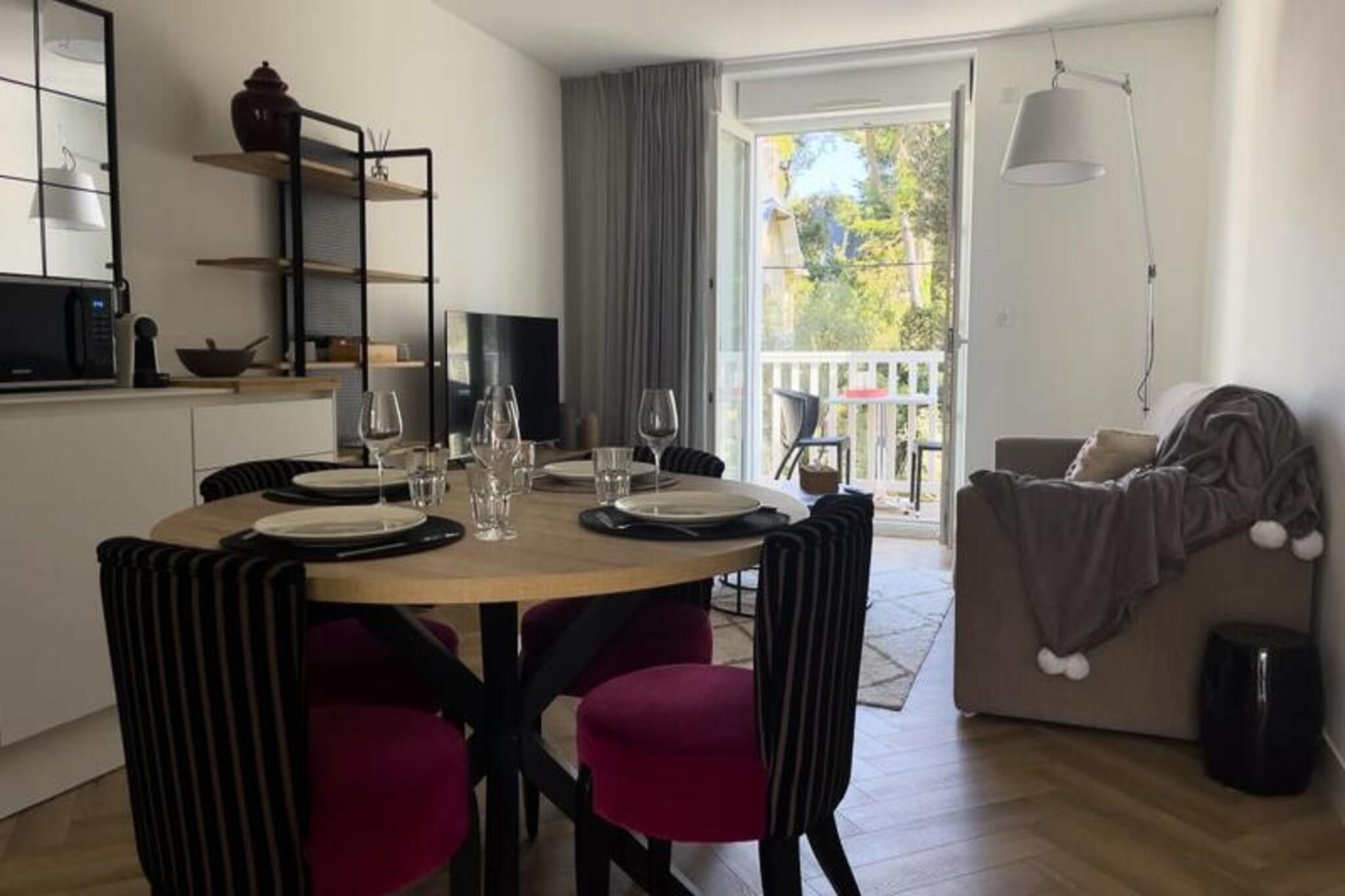 Denne T3-leiligheten, som ligger i en ?rhundregammel bygning, tilbyr hotelltjenester for et komfortabelt opphold. Den har 2 soverom med utsikt over furutr?r og villaer ved sj?en, bad med dusj og eget toalett og stue med sovesofa for 2 ekstra gjester. Leiligheten har klimaanlegg, Wi-Fi, kvalitetssenget?y og vaskemaskin/t?rketrommel. En privat utvendig terrasse bidrar til sjarmen. Kj?ledyr er ikke tillatt. Leiligheten har en ideell beliggenhet i Pornichet, en pulserende badeby. Gjestene har lett tilgang til stranden, kafeer, restauranter og butikker. Utforsk n?rliggende attraksjoner som kasinoet, marinaen og livlige nabolag. Omr?det er rikt p? historie, med Gu?rande, saltmyrer, Bri?re regionale park og Saint-Nazaire, kjent for skipsbygging. Morbihan-bukten ligger ogs? bare en kort kj?retur unna. Leiligheten har et fullt utstyrt kj?kken med stekeovn, mikrob?lgeovn, oppvaskmaskin, kj?leskap og fryser, med plass til opptil 5 personer. Tilleggstjenester tilgjengelig mot en avgift inkluderer parkering, tilgang til et spa-hammam og massasjetjenester. Den felles terrassen tilbyr naturskj?nn utsikt over stranden og furutr?r, og er et perfekt sted ? slappe av.