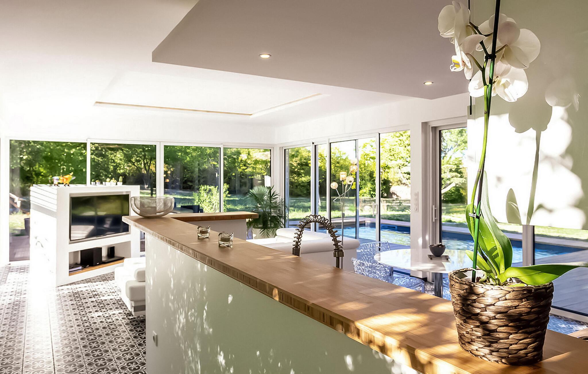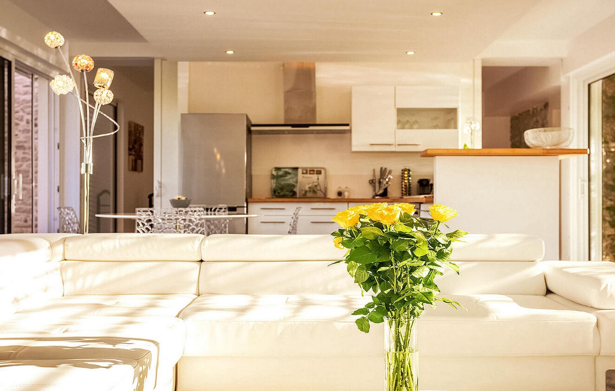 Denne luksuriøse ferievillaen i Carnas byr på en utsøkt romantisk ferie med en rekke eksklusive funksjoner og inviterer deg til å bo midt i en middelhavshage omkranset av rolig bambus. Villaen har en fantastisk stue med skyvevinduer, slik at du kan fordype deg i skjønnheten i den omkringliggende hagen. Nyt komforten med en storskjerm med gratis Netflix-tilgang, hjemmekino og en sjenerøs sjeselongsofa. La deg friste av kulinariske opplevelser på det eksklusive kjøkkenet, som er utstyrt med moderne bekvemmeligheter som Nespresso-kaffemaskin og infusjonsmaskin. Soverommet utstråler luksus, og skyvevegger gir fleksibilitet mellom sove- og oppholdsrom, mens en walk-in-garderobe forbinder soverommet og det utsøkt designede badet. Badet har to servanter i elegant bambusdesign og en romslig duo-dusj med to regnsøyler. Utenfor har villaen en vakkert anlagt hage og et privat svømmebasseng (7 x 3 meter), som er oppvarmet fra april til oktober og er perfekt for en forfriskende dukkert. Du kan også slappe av i det skjermede boblebadet eller unne deg en dukkert i utendørsdusjen. En solterrasse i teak med solsenger og hagemøbler venter på deg. Adkomsten til villaen skjer via en privat vei med egen parkeringsplass, slik at du kan nyte størst mulig privatliv og komfort under hele oppholdet. Villaen ligger på eiendommen til eierne, som bor på stedet. Den ligger mellom Nîmes og Montpellier, i nærheten av landsbyen Carnas og middelalderlandsbyen Sommières. Med 300 soldager i året byr dette paradiset i den provençalske Gard på et sjeldent vakkert landskap: 30 minutter lenger sør finner du Camargue-dammene og sandstrendene i Languedoc. Bare et steinkast unna ligger nasjonalparken Cévennes, som byr på like spektakulære landskap. Regionen er rik på en fantastisk historisk arv: byen Avignon, de romerske byene Nîmes og Arles, Pont du Gard, hertugdømmet Uzès, de historiske Languedoc-byene Montpellier, Pézenas, Aigues-Mortes, Sommières og Sauve og en rekke sjarmerende landsbyer å besøke.