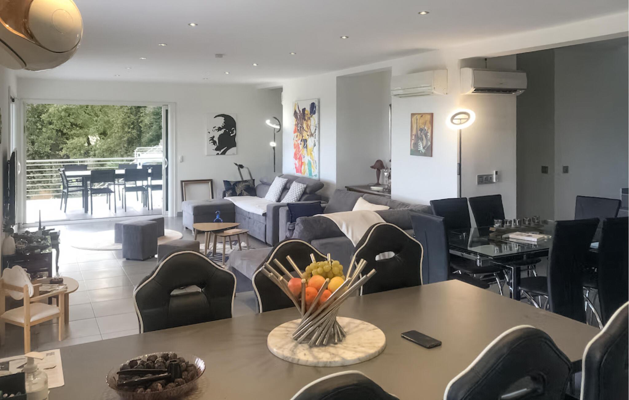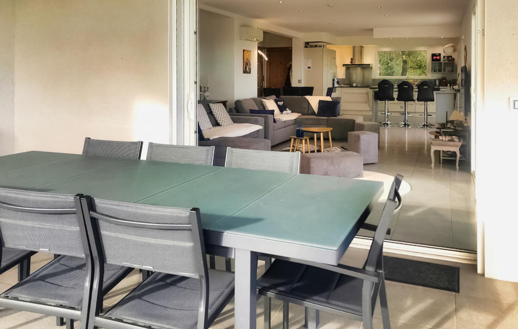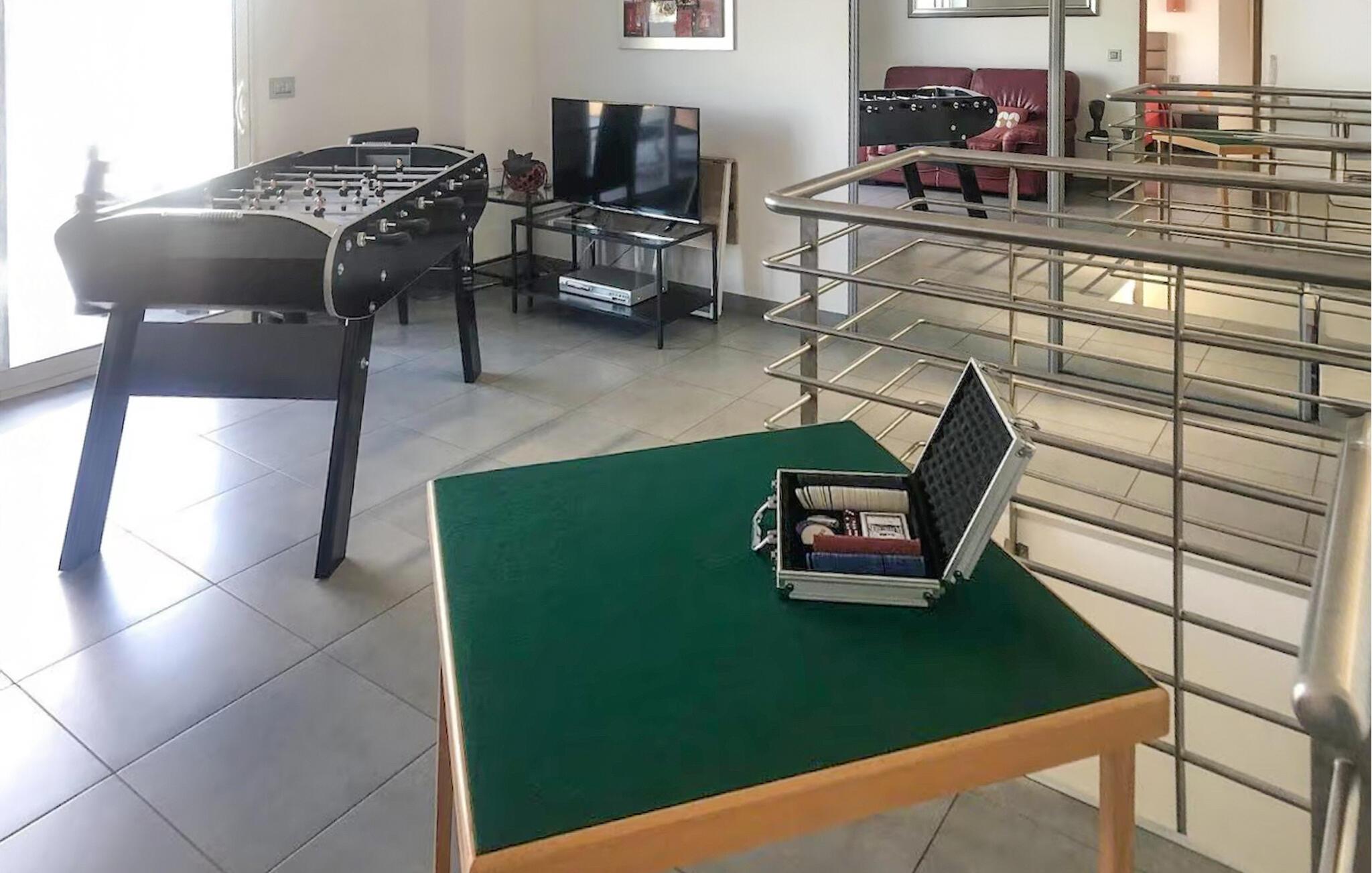 Denne villaen av høy kvalitet ønsker deg velkommen til en privilegert beliggenhet og vil glede deg med sitt lyse, romslige interiør. Gled dere til å lage mat sammen på det moderne kjøkkenet med åpen planløsning, se en film i den koselige stuen, ha det gøy ved bordfotballbordet eller spille en runde rulett.