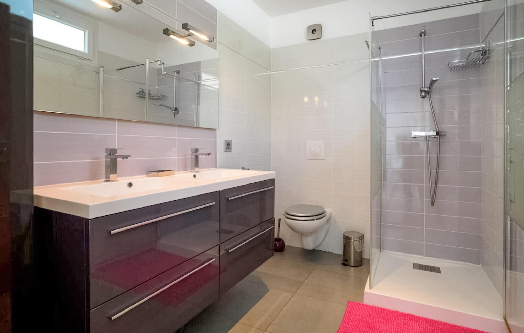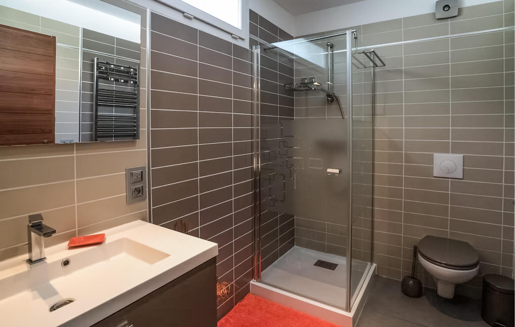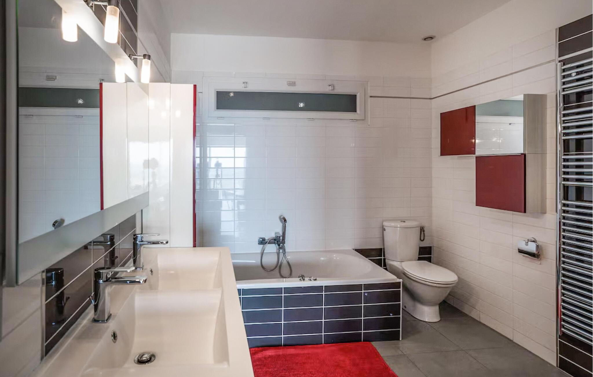 Denne villaen av høy kvalitet ønsker deg velkommen til en privilegert beliggenhet og vil glede deg med sitt lyse, romslige interiør. Gled dere til å lage mat sammen på det moderne kjøkkenet med åpen planløsning, se en film i den koselige stuen, ha det gøy ved bordfotballbordet eller spille en runde rulett.