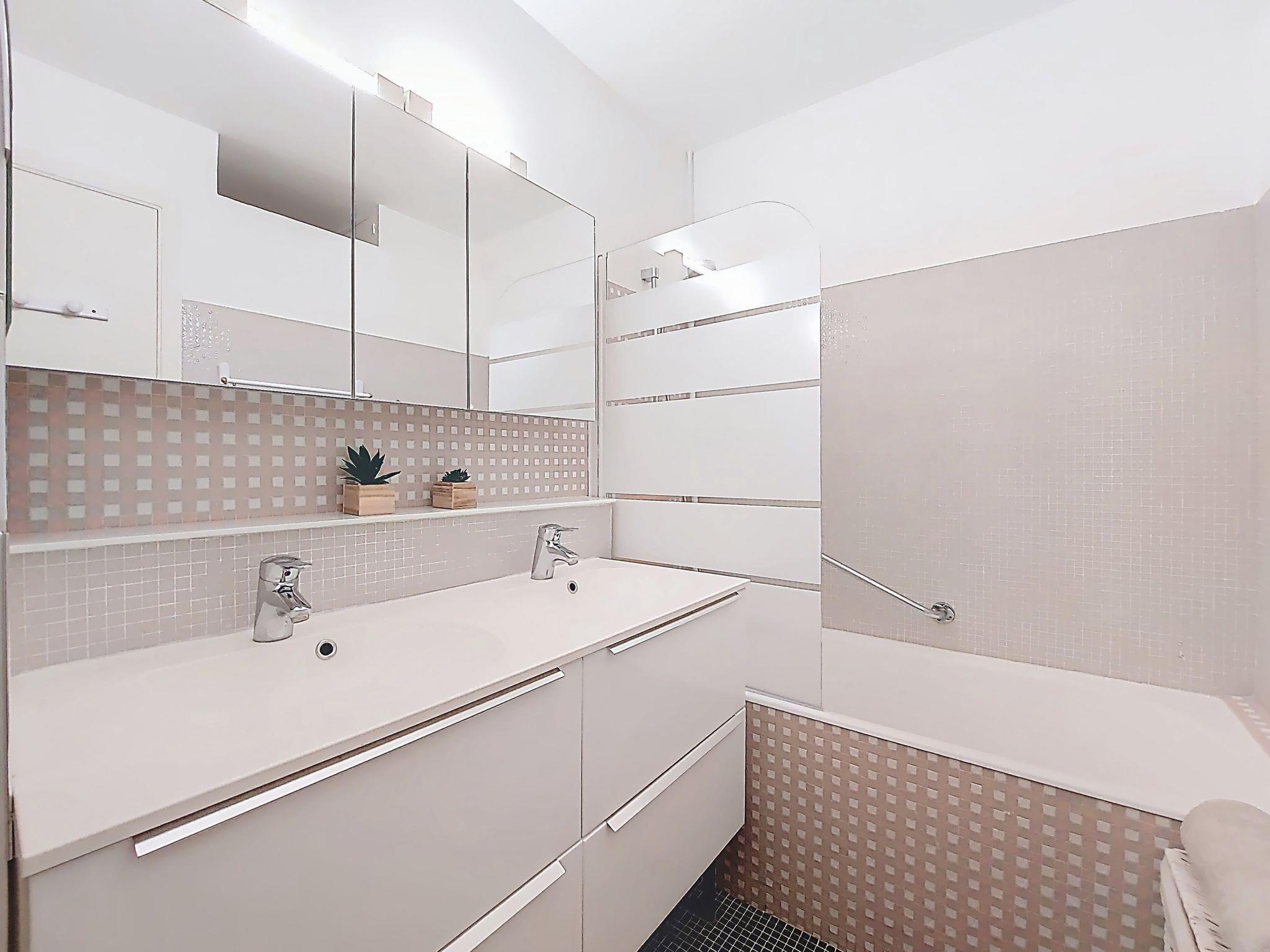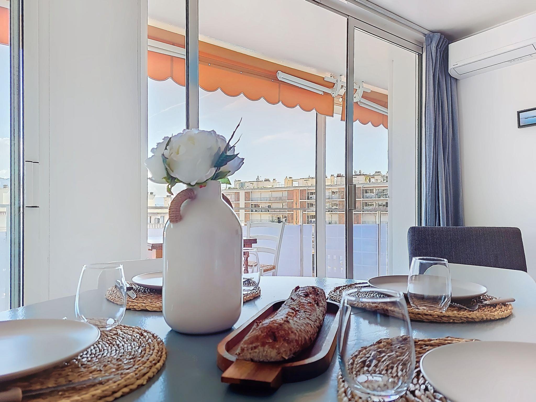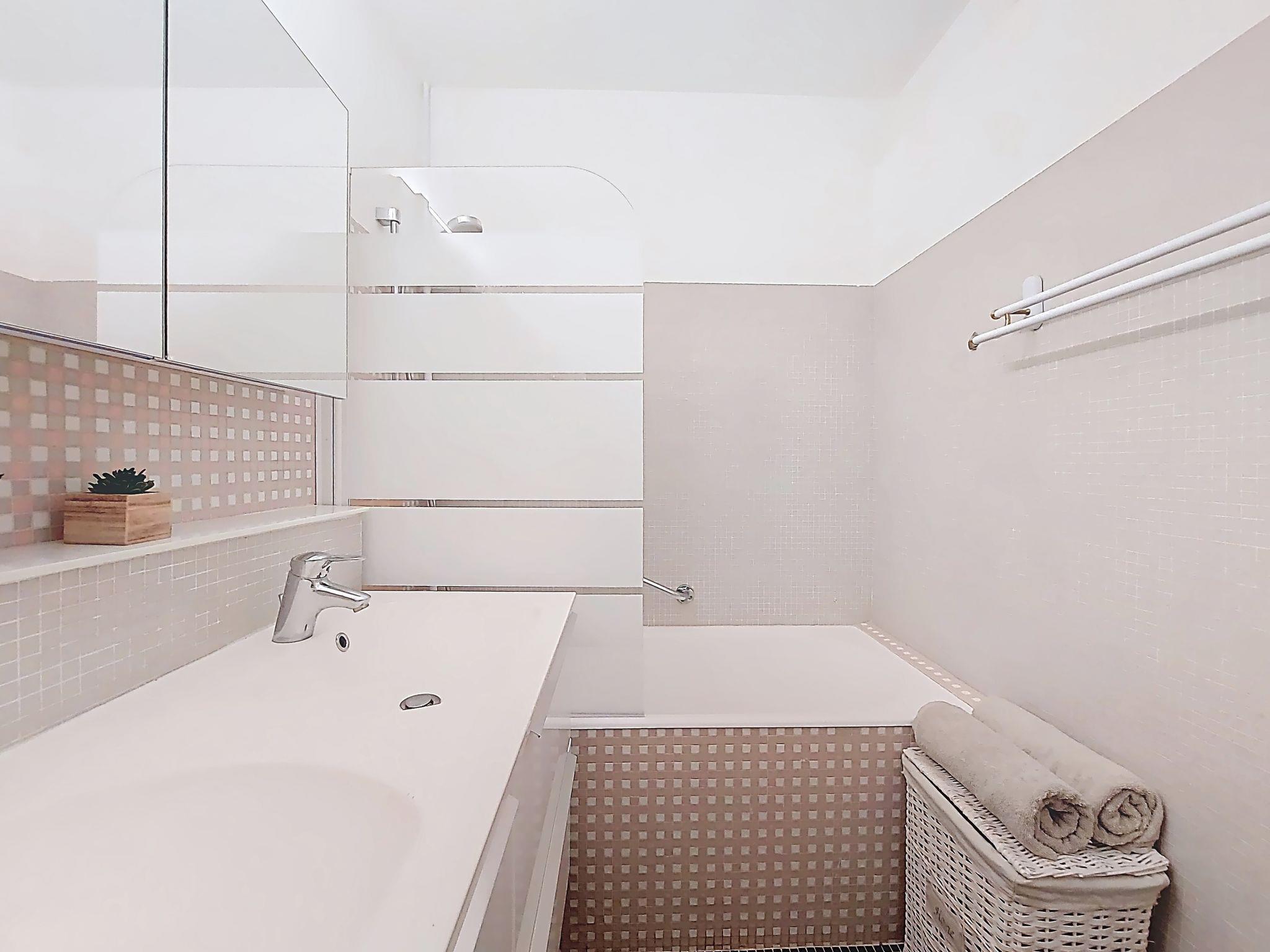 2-room apartment 47 m2 on 4th floor. Bright, comfortable furnishings: living/dining room with 1 double sofabed (140 cm, length 190 cm), flat screen and air conditioning. Exit to the terrace. 1 room with 1 double bed (140 cm, length 190 cm), air conditioning. Exit to the terrace. Kitchen (oven, dishwasher, 3 ceramic glass hob hotplates, toaster, kettle, microwave, electric coffee machine). Exit to the terrace. Bathroom, sep. WC. Large terrace 15 m2, east facing position. Terrace furniture, sitting area. View of the sea, the mountains and the resort. Facilities: washing machine. Internet (WiFi, extra). Parking. Please note: parking space for small car only. Maximum 1 small pet/ dog allowed. Smoke alarm. Offer by a private individual according to Art. 155, IV of CGI. 06104001557LR