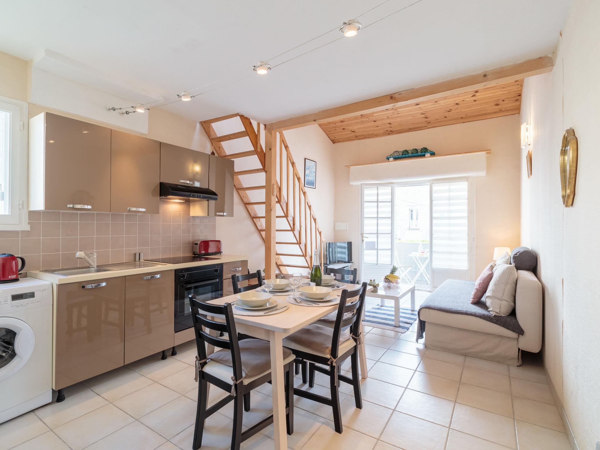 1-room studio 26 m2 on 2 levels, on the upper ground floor. Beautiful furnishings: living/dining room with 1 double sofabed (1 x 140 cm, length 190 cm), TV. Exit to the balcony. Kitchenette (oven, dishwasher, 2 induction hot plates, microwave, freezer). Shower/WC. Air-conditioning. Upper floor: gallery with sloping ceilings with 1 french bed (1 x 160 cm, length 190 cm). Small balcony 4 m2, south facing position and, east facing position. Balcony furniture. Facilities: washing machine. Internet (WiFi, extra). Please note: maximum 1 pet/ dog allowed. Smoke alarm. Instead of an enclosed bedroom, some sleeping areas are located in an open-plan area (gallery, alcove, etc.). 17306000238RT