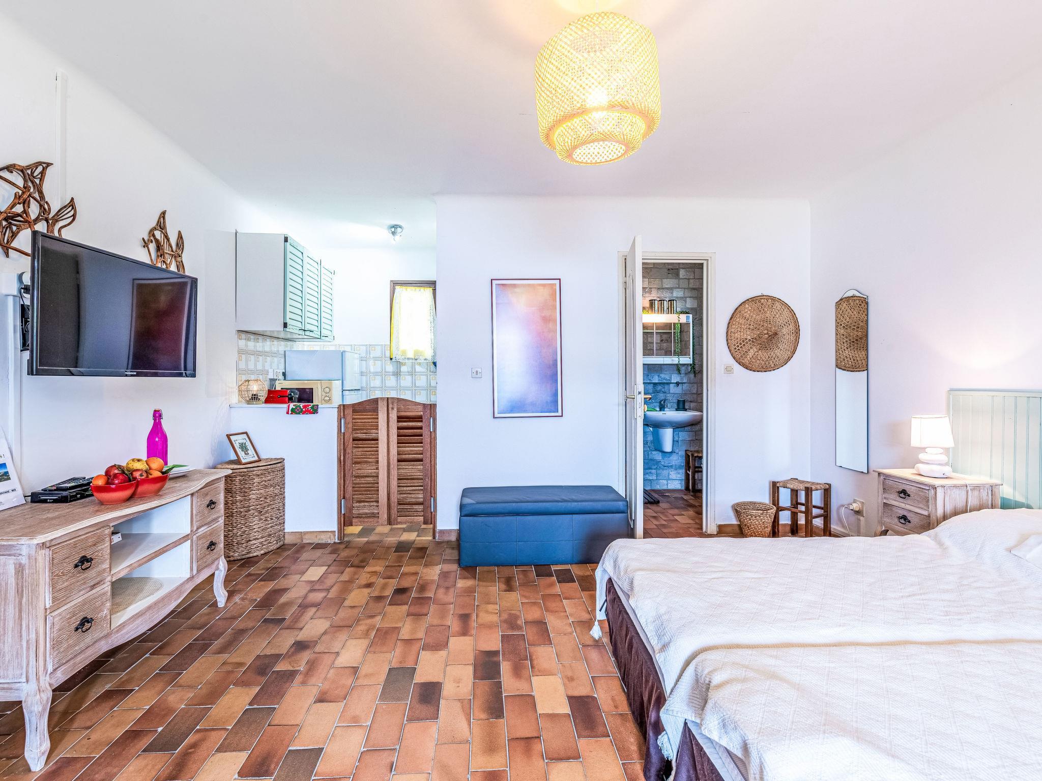 "La Baraka", 1-room apartment 25 m2. Simple furnishings: living/dining room with 2 beds (90 cm, length 190 cm), dining table and TV (flat screen). Exit to the terrace. Small, open kitchen (2 gas rings, kettle, microwave, electric coffee machine). Shower/WC. Electric heating, air-conditioning. Terrace roofed. Terrace furniture, deck chairs (2). Beautiful view of the sea and the countryside. Facilities: iron. Internet (WiFi). Parking at the house. Please note: non-smokers only. Smoke alarm. Offer by a private individual according to Art. 155, IV of CGI. FR9272.641.1