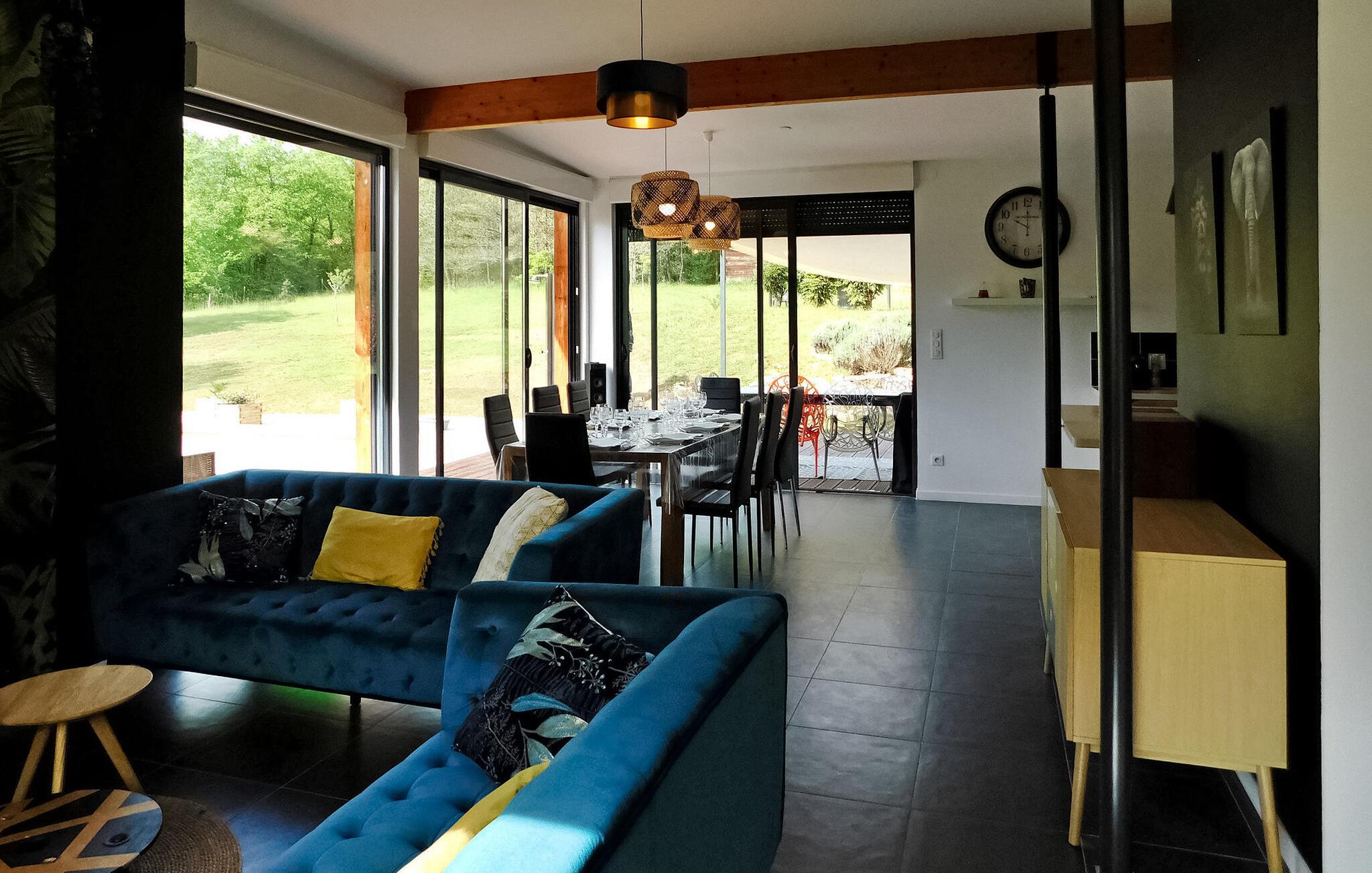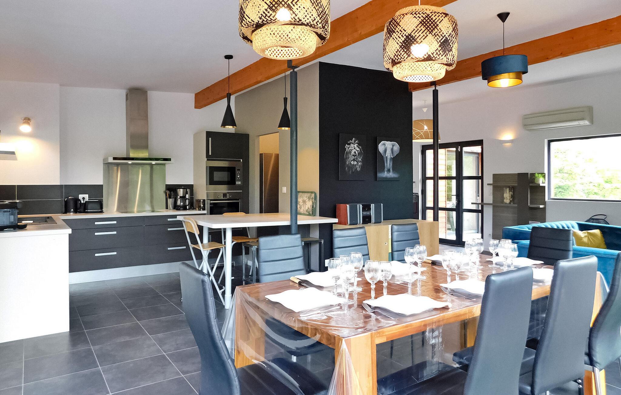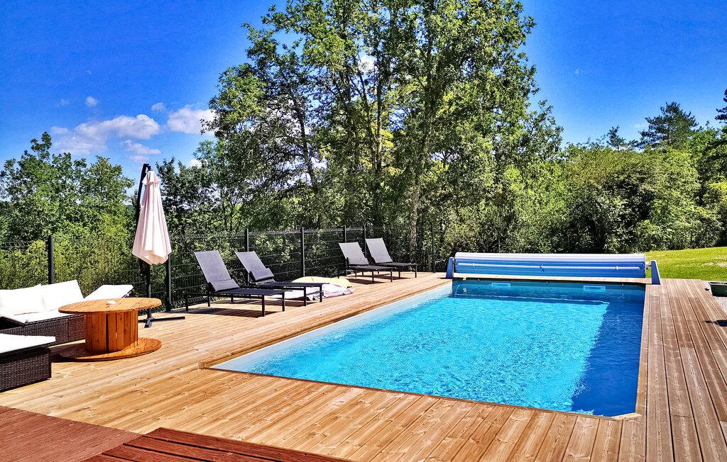 Dette moderne feriehuset i Dordogne ligger i fredelige, landlige omgivelser i nærheten av Saint Amand de Coly. Huset har et lyst og lyst område i første etasje med klimaanlegg, en koselig sittegruppe, spiseplass og et åpent kjøkken utstyrt med de viktigste hvitevarene. Det er også to soverom i første etasje, hvorav det ene er utstyrt med køyesenger og et bordfotballbord for barn. I andre etasje er det to soverom med klimaanlegg og et felles dusjrom. Utenfor har eiendommen et privat oppvarmet basseng, et lekeområde for barn med trampoline og lekehus, flere terrasser med hagemøbler og en plancha. Vær oppmerksom på at hovedadkomsten går via en tretrapp med rekkverk og en port. Om vinteren varmes huset opp med en pelletskamin. Huset ligger på landsbygda utenfor landsbyen Saint-Amand-de-Coly (lokal dagligvarebutikk, restaurant og brøddepot).