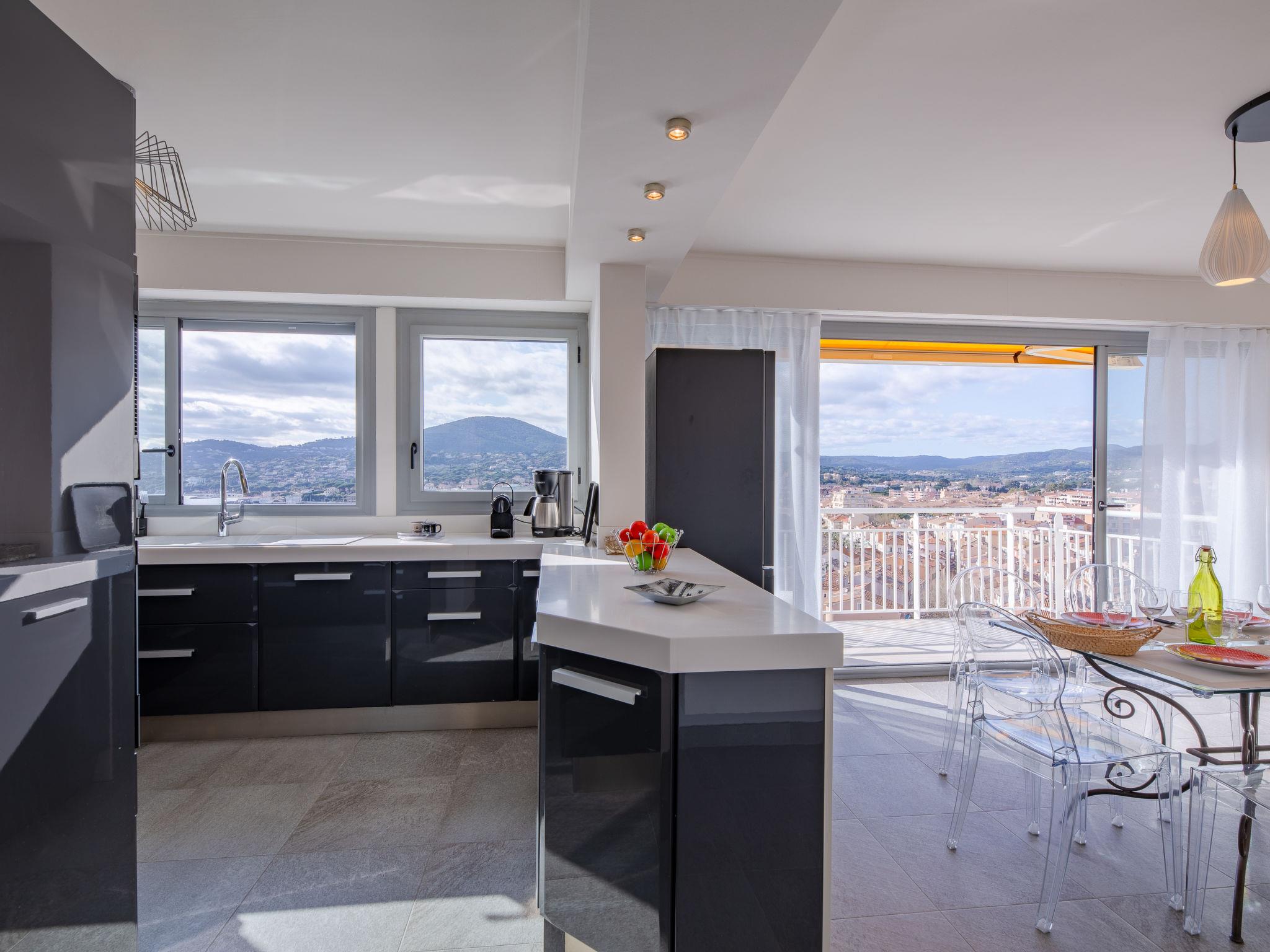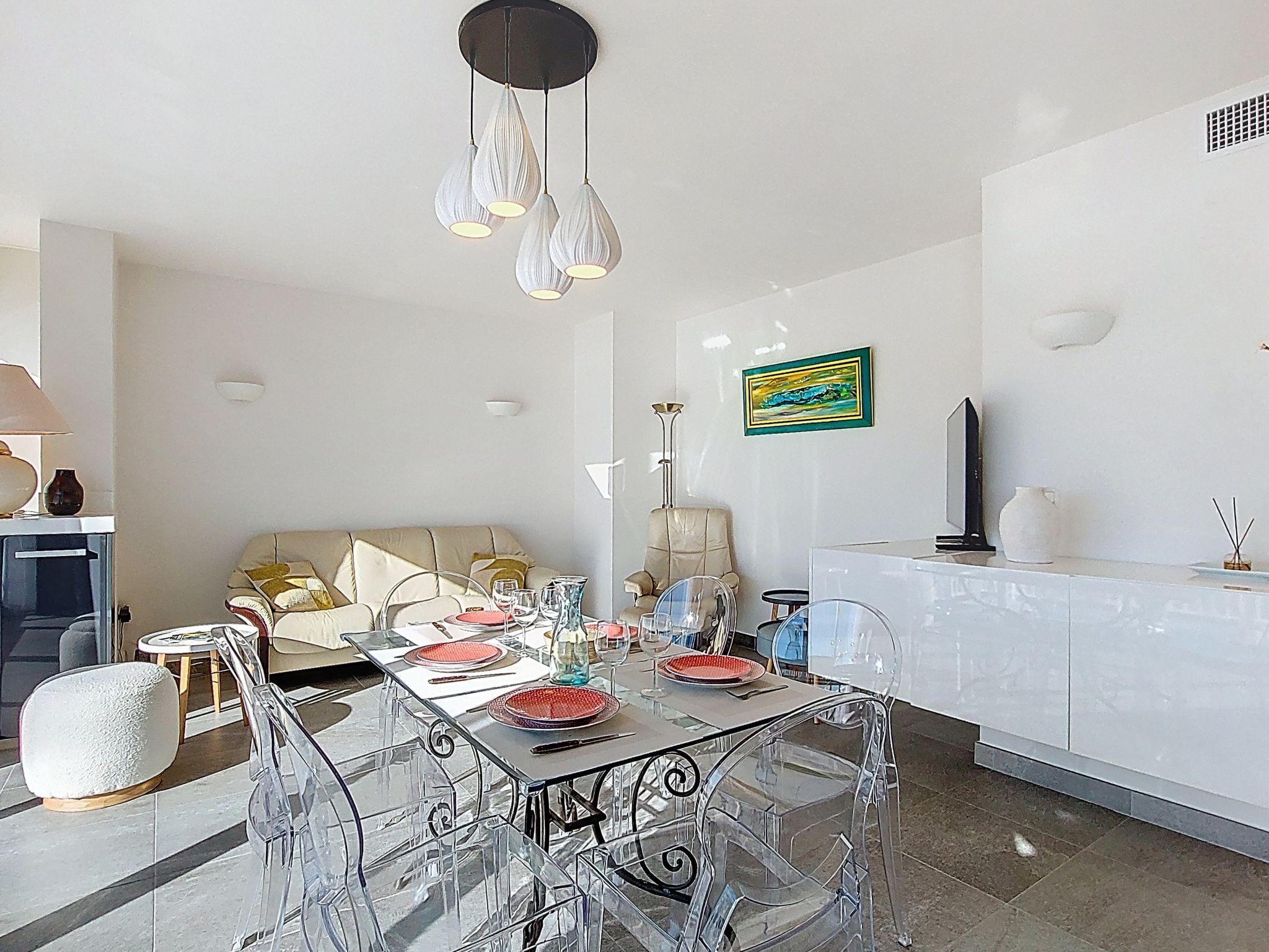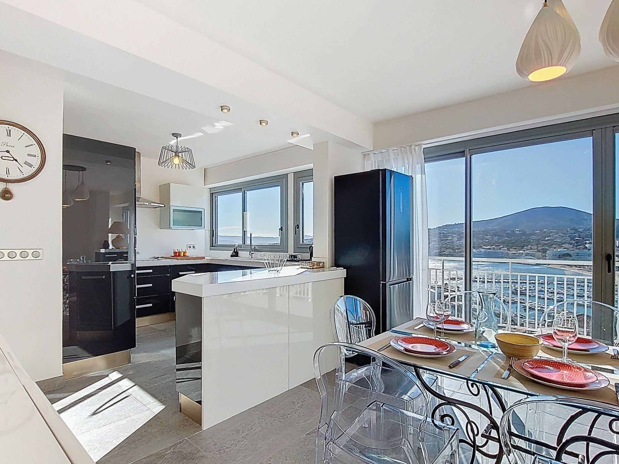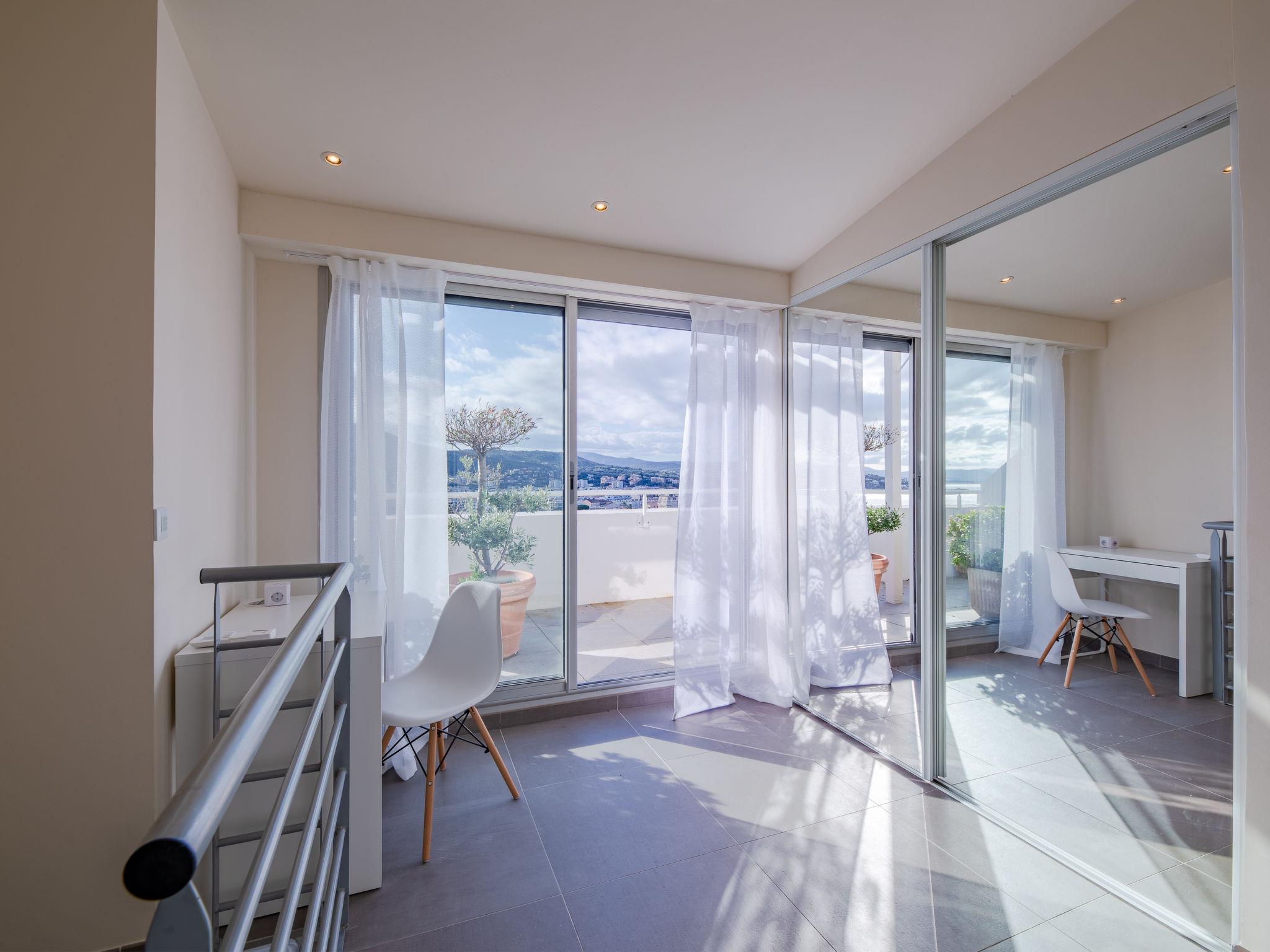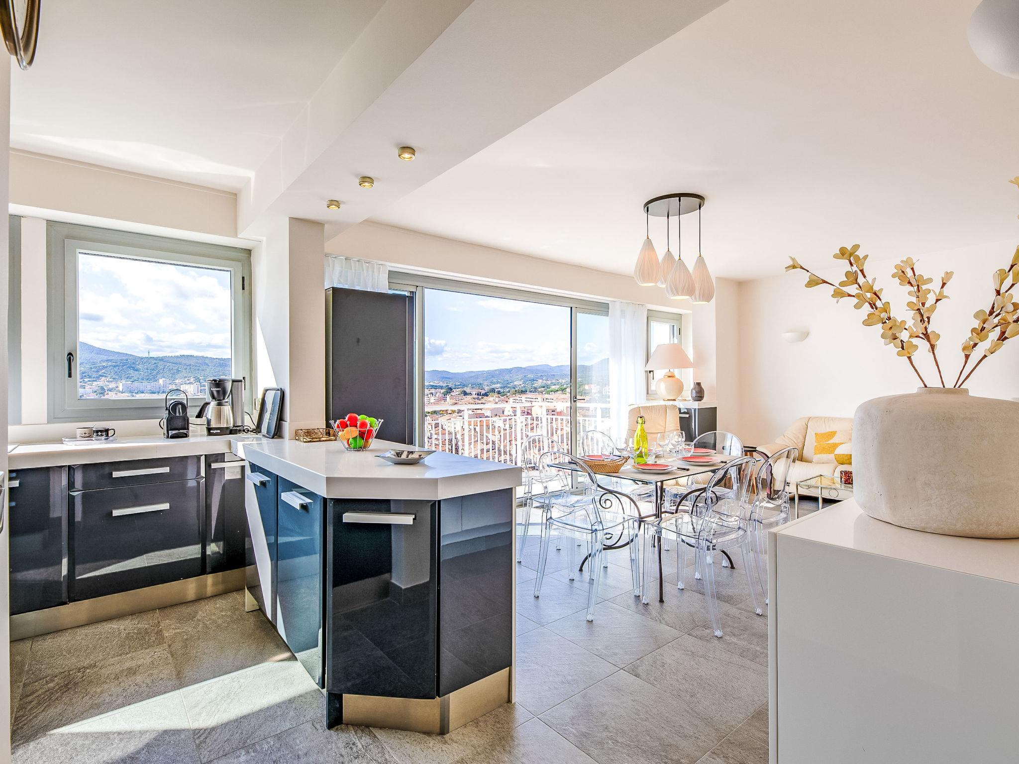 4-room maisonette 86 m2 on 10th floor, north-west facing position. Bright, fully renovated, modern furnishings: entrance hall. Living/dining room, west facing position with TV (flat screen). Exit to the balcony. 1 room, north facing position with 1 french bed (1 x 160 cm, length 200 cm). 1 room, north facing position with 2 beds (90 cm, length 200 cm). Open kitchen (oven, dishwasher, 4 induction hot plates, toaster, kettle, microwave, freezer, electric coffee machine). Shower, sep. WC. Air-conditioning, forced-air heating. Upper floor: (spiral staircase), 1 room, west facing position with 1 fold-away bed (120 cm, length 200 cm), shower. Exit to the terrace. Balcony 9 m2, west facing position, large balcony 47 m2, north-west facing position. Balcony furniture. Marvellous panoramic view of the sea and the town. Facilities: washing machine, iron, hair dryer. Internet (WiFi, free). Parking space n 595 (1 car). Please note: non-smokers only. Smoke alarm. Accommodation not suitable for PRM People with reduced mobility. Offer by a commercial proprietor according to Art. 155, IV, CGI 83115006050HT