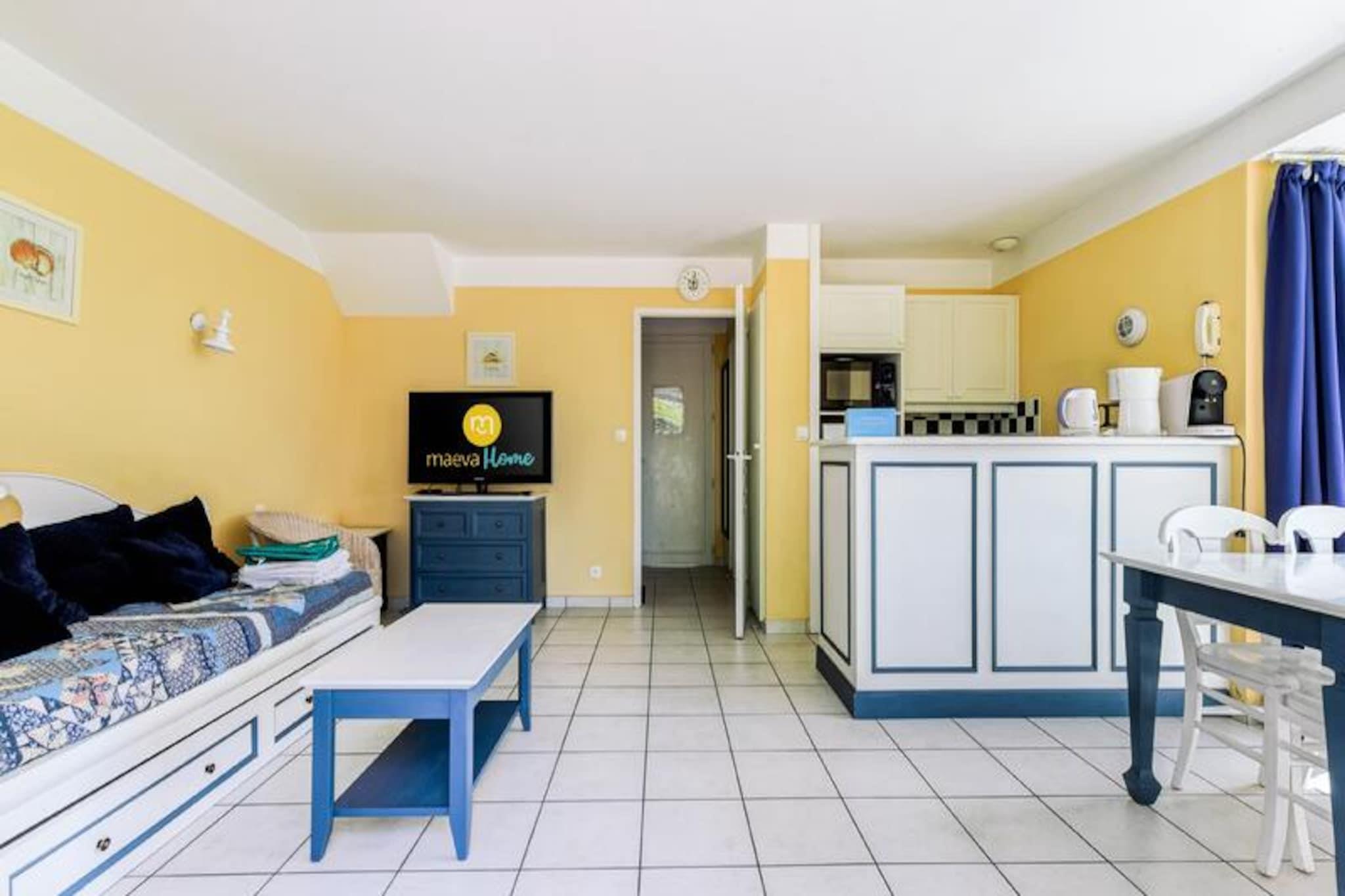 Dette to-etasjes feriehuset er perfekt for familier, og tilbyr komfortable soveplasser for opptil 6 gjester. Den har 2 soverom med dobbeltsenger og enkeltsenger, et hytteområde med køyesenger og en sovesofa i stuen. To bad, ett med badekar og det andre med dusj, sørger for bekvemmelighet for alle. Eiendommen tillater kjæledyr mot en ekstra avgift (husk å sjekke med boligen). Boligen ligger i Port-Bourgenay-residensen, og har en privat terrasse og parkering på stedet. Selve boligen ligger i nærheten av Bourgenay marina, og tilbyr en sjarmerende kystatmosfære. Selv om det ikke er noen restauranter eller butikker nevnt i umiddelbar nærhet, gir boligen tilgang til ulike fasiliteter avhengig av det spesifikke distriktet du er plassert i. Disse inkluderer oppvarmede svømmebassenger med plaskebasseng og utstyrte strender (åpne i høysesongen og reservert for gjester som bor i dette området). Inne i huset finner du et velutstyrt kjøkken åpent mot stuen, ideelt for å tilberede måltider sammen. Stuen gir en komfortabel plass å slappe av med plass til seks. Selv om noen fasiliteter som wifi, sengetøy og håndklær er tilgjengelig mot et pristillegg, er sluttrengjøring obligatorisk.