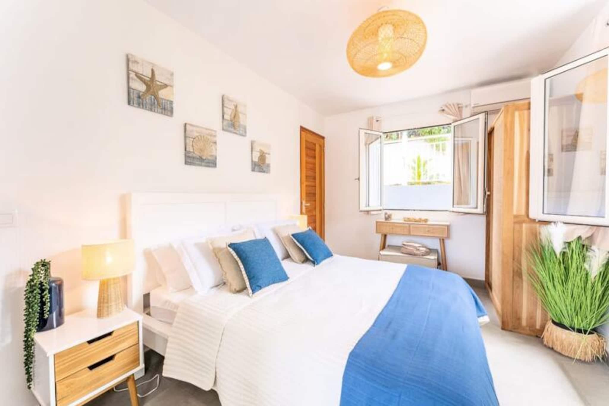 På den fortryllende øya Les Saintes tilbyr Villa Topaze en fredelig tilflukt der karibiske briser og moderne komfort blandes sømløst. Denne nybygde villaen ligger på den pittoreske Route de l'Anse Figuier i Terre-de-Haut, og er en ekte oase av fred. Bare en kort spasertur fra lokale butikker og restauranter, gir den den perfekte setting for en idyllisk ferie omgitt av naturlig skjønnhet og ro. Villa Topaze er designet for å innkvartere opptil seks gjester, med mulighet for to ekstra barn, og har tre soverom med klimaanlegg, som alle er omtenksomt innredet for å inspirere til avslapning. Første etasje har et soverom med eget bad og dusjkabinett, mens to ekstra soverom oppe deler et stilig bad med dusjkabinett og separat toalett. Det fullt utstyrte kjøkkenet åpner ut mot en romslig terrasse, hvor et spisebord for åtte inviterer deg til å nyte måltider under den karibiske himmelen. Utenfor skaper et privat saltvannsbasseng, solsenger og en kullgrill det ultimate stedet for å slappe av med familie eller venner. Utenfor villaen tilbyr øya uendelige eventyr. Utforsk det historiske Fort Napoleon, slapp av på den uberørte sanden på Pompierre-stranden, eller beundre det ikoniske Sukkertoppen. For vannettusiaster er \