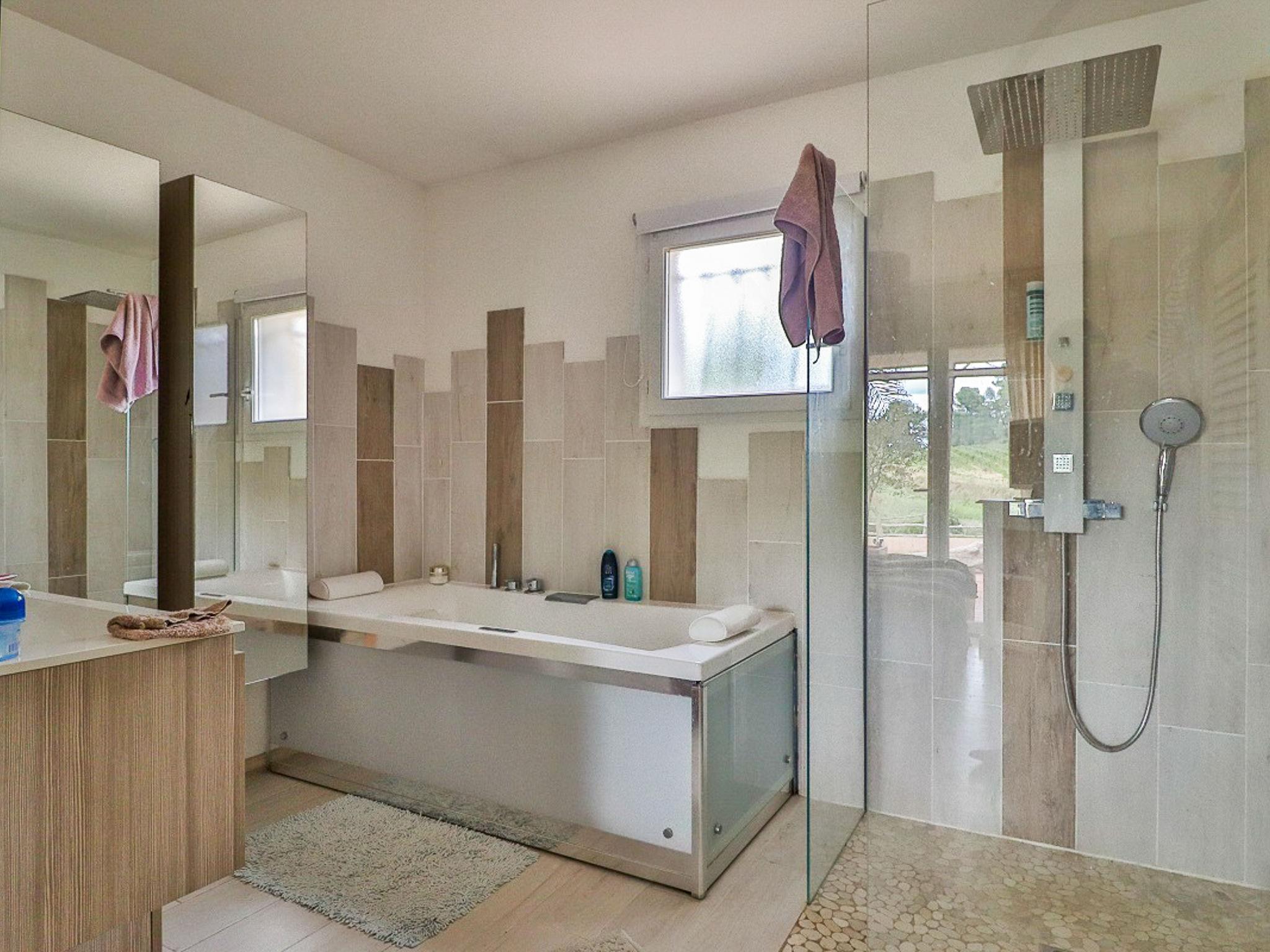 4-room house 130 m2 on 2 levels. Very comfortable and beautiful furnishings: living/dining room with open-hearth fireplace (only for decoration), dining table and flat screen. Exit to the garden, to the terrace, to the swimming pool. 1 large room with 1 french bed (1 x 160 cm), bath/shower and flat screen. Exit to the terrace, to the swimming pool. Open kitchen (dishwasher, 4 induction hot plates, toaster, kettle, microwave, freezer, electric coffee machine). Sep. WC. Electric heating, air-conditioning. Upper floor: 2 rooms, each room with 2 double beds (1 x 160 cm, length 190 cm). Shower/WC. Terrace 30 m2. Terrace furniture, barbecue, deck chairs. Facilities: washing machine. Internet (WiFi, free). Parking (2 cars). Please note: non-smoking house. Smoke alarm.