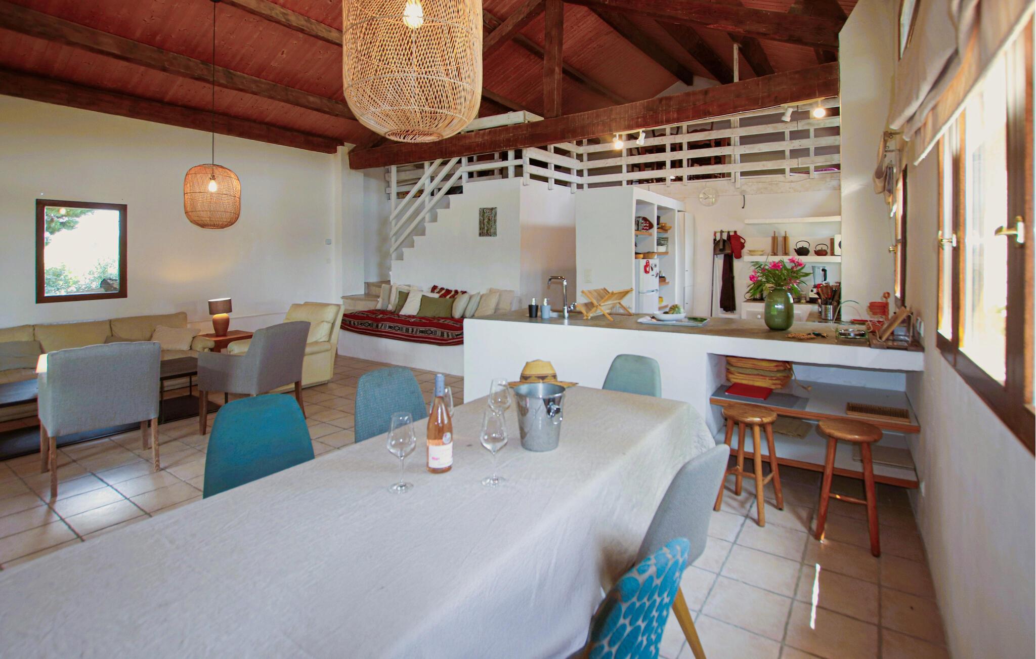 Dette sjarmerende feriehuset i loftstil ligger i en sjarmerende liten hage og gir deg god plass til å nyte harmoniske dager i det smakfullt møblerte interiøret, selv med en større familie. Du kan se frem til hyggelige måltider, avslappede lesestunder, muntre spillkvelder og stimulerende samtaler over et glass vin.