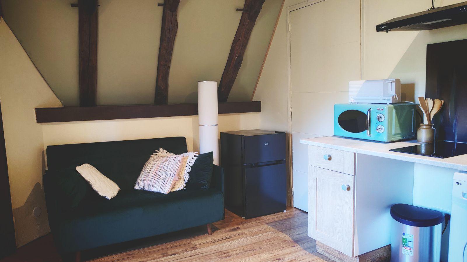 Kitchen and living room : Washing machine, dishwasher, table-top fridge with separate freezer compartment, combined microwave oven, capsule coffee maker (Nespresso format), 2-burner induction hob;