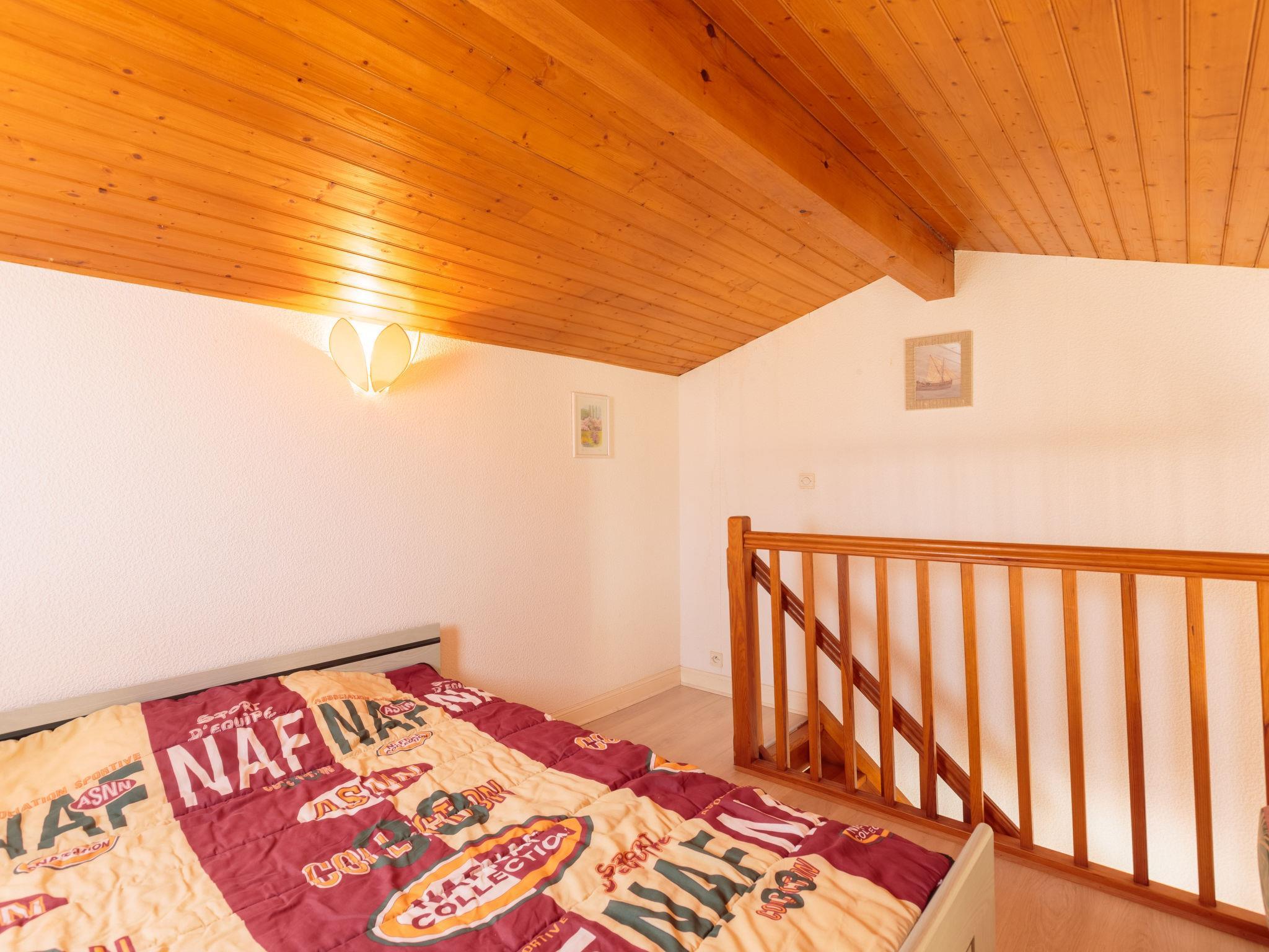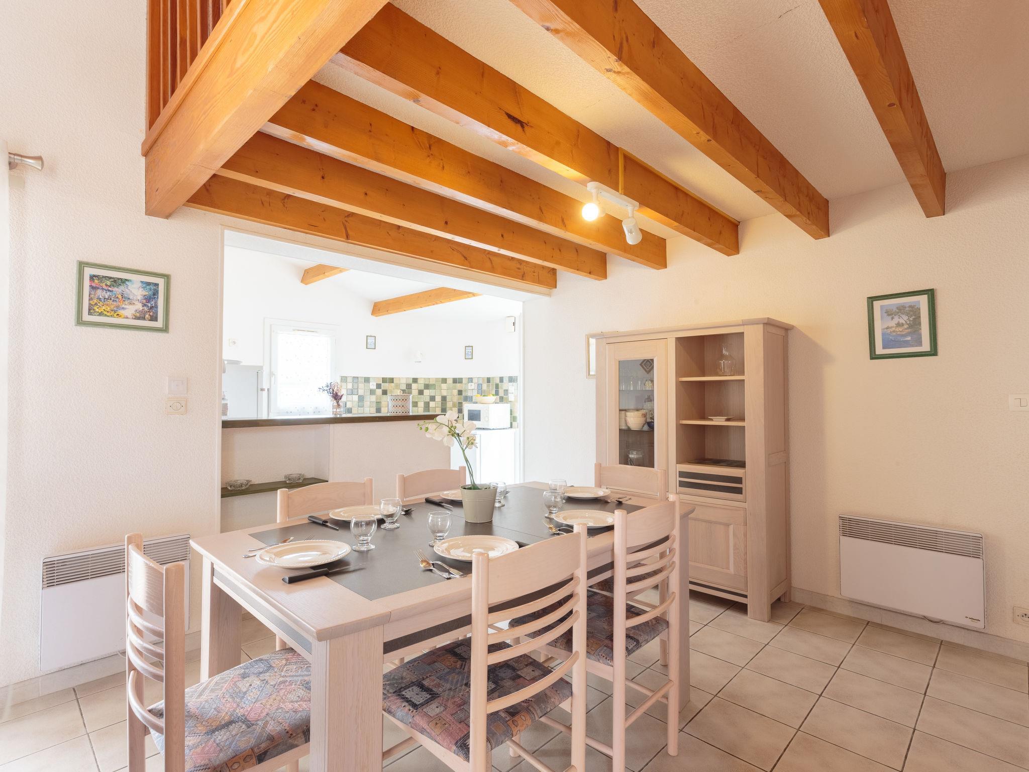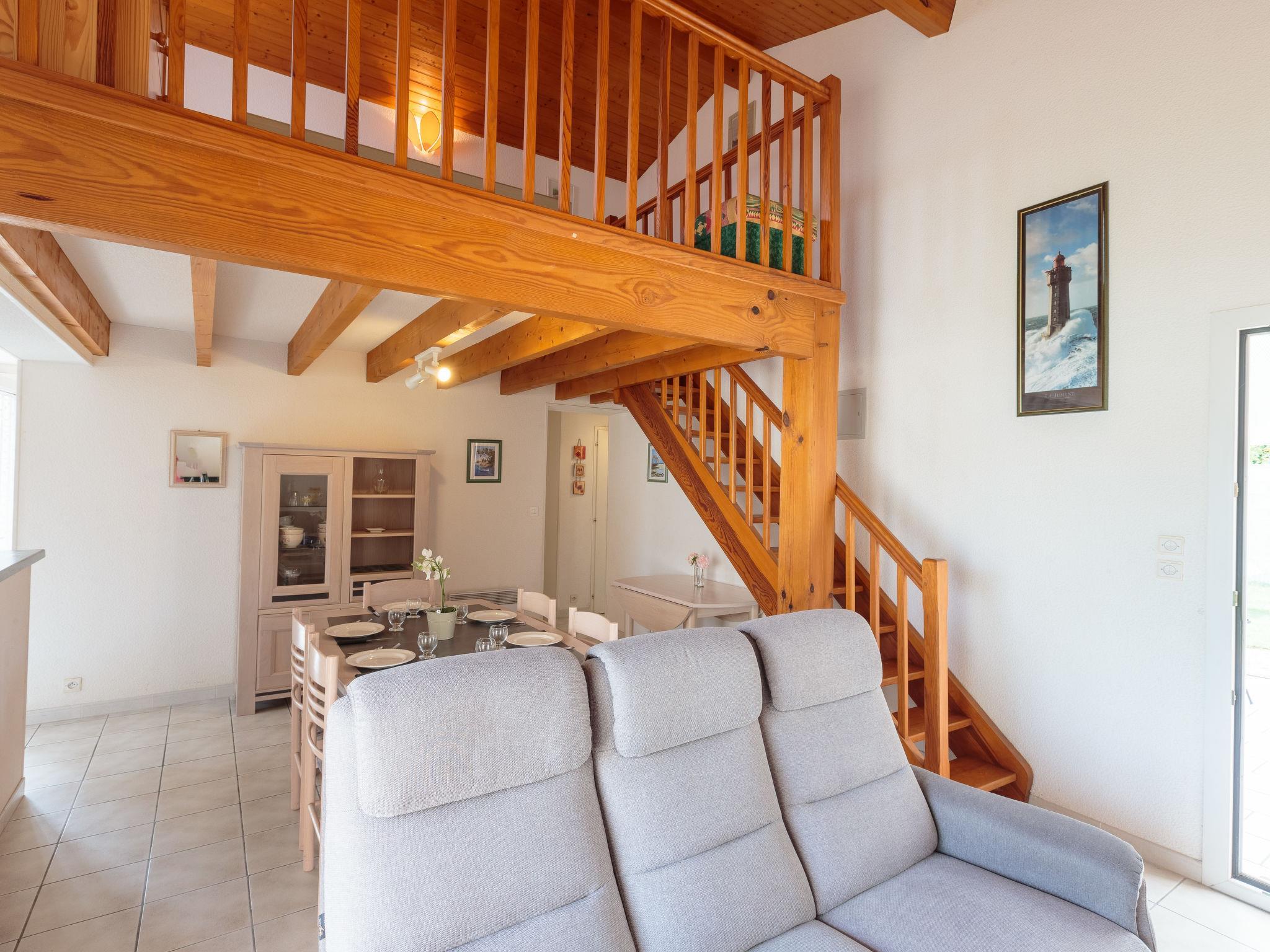 4-room house 76 m2 on 2 levels. Modern furnishings: living/dining room with TV (flat screen). 2 rooms, each room with 1 french bed (1 x 140 cm, length 190 cm). 1 room with 1 x 2 bunk beds (90 cm, length 190 cm). Open kitchen (4 hot plates, oven, dishwasher, microwave). Shower, sep. WC. Upper floor: gallery with sloping ceilings with 1 french bed (1 x 140 cm, length 190 cm). Electric heating. Terrace 14 m2, garden 350 m2. Terrace furniture. Facilities: washing machine. Internet (WiFi, extra). Parking (2 cars). Please note: smoke alarm. Instead of an enclosed bedroom, some sleeping areas are located in an open-plan area (gallery, alcove, etc.).