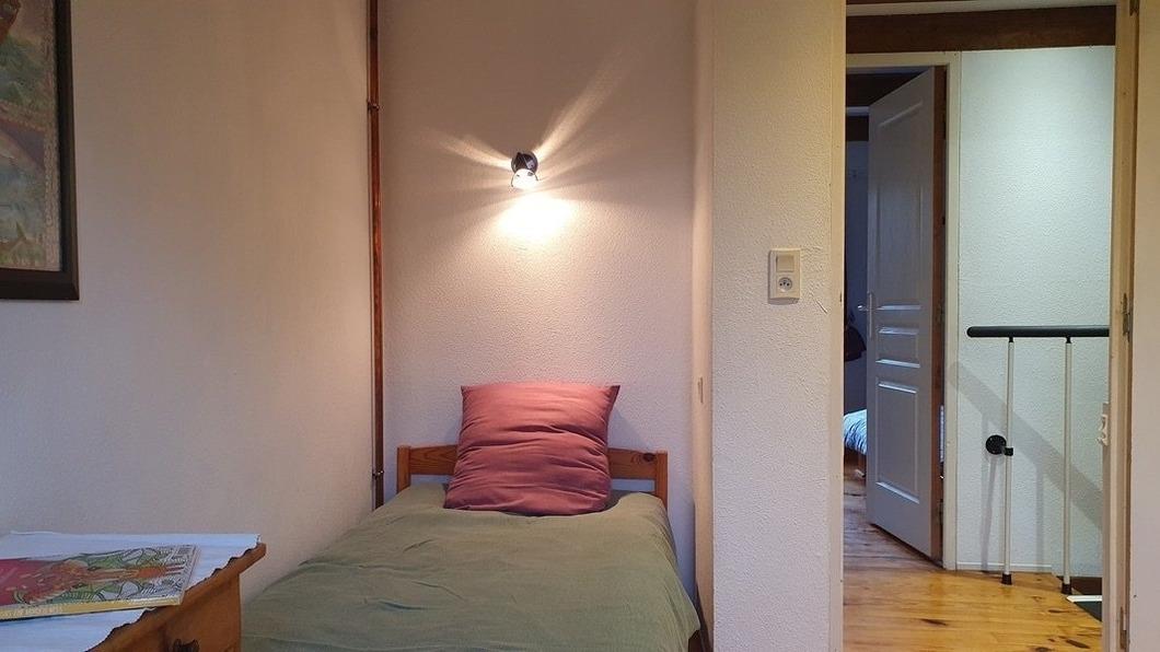 Über eine Wendeltreppe gelangen Sie in den ersten Stock zu den Schlafzimmern mit Holzparkett, die eine behagliche und ruhige Schlafatmosphäre bieten. Das nach Norden ausgerichtete Zimmer ist mit einem Doppelbett (1,40 m × 1,90 m) ausgestattet. Das zweite Schlafzimmer mit Südausrichtung verfügt über ein Doppelbett sowie ein zusätzliches Einzelbett (1,40 m × 1,90 m und 0,90 m × 1,90 m).