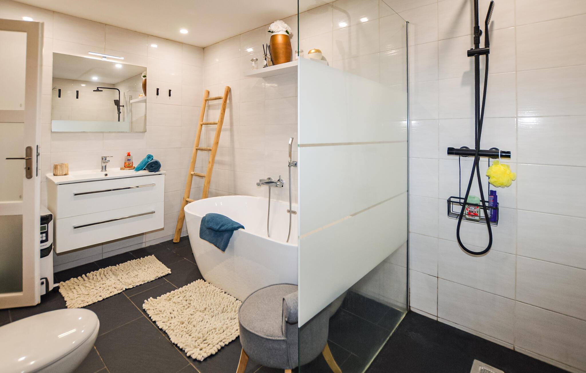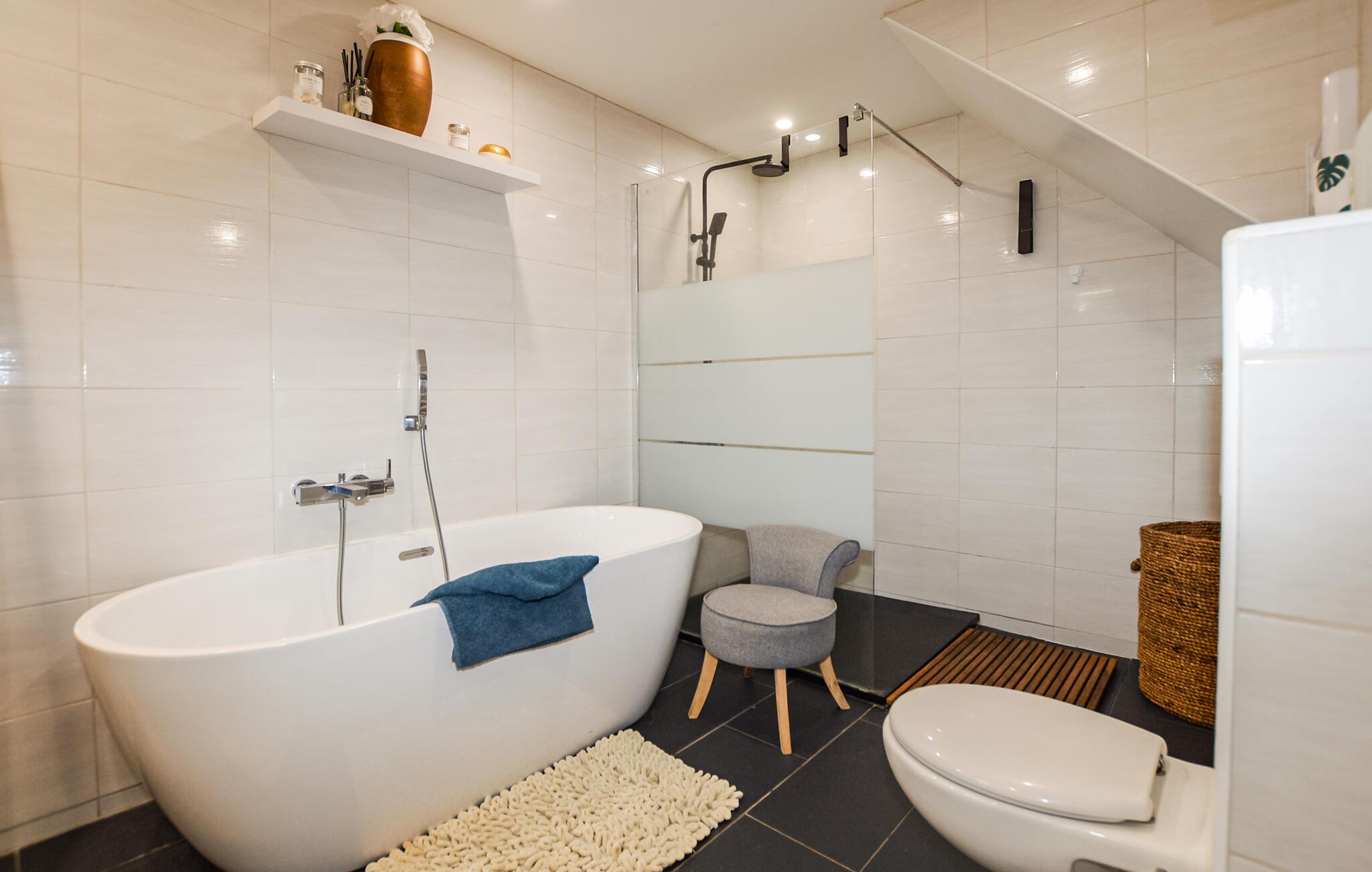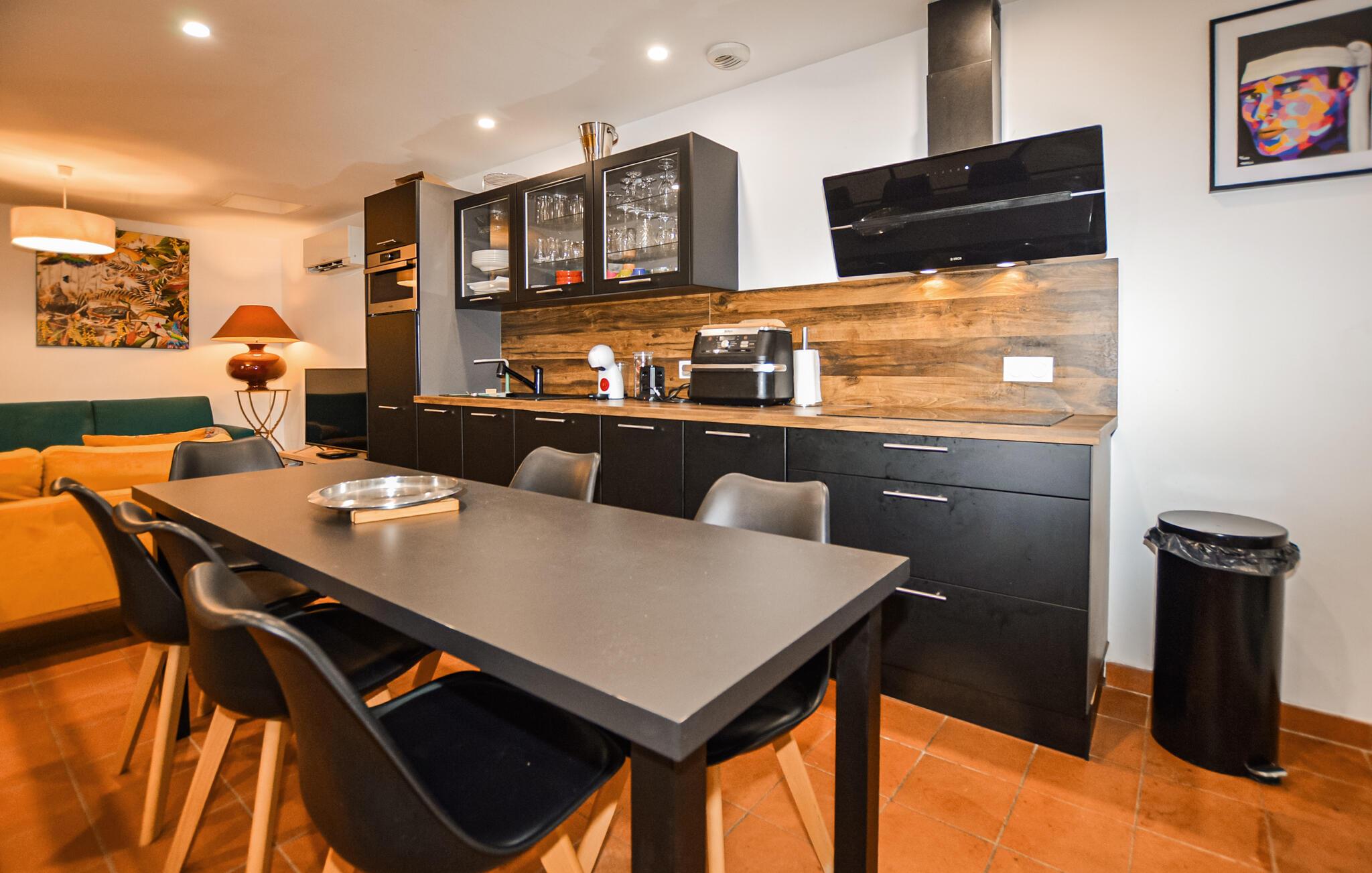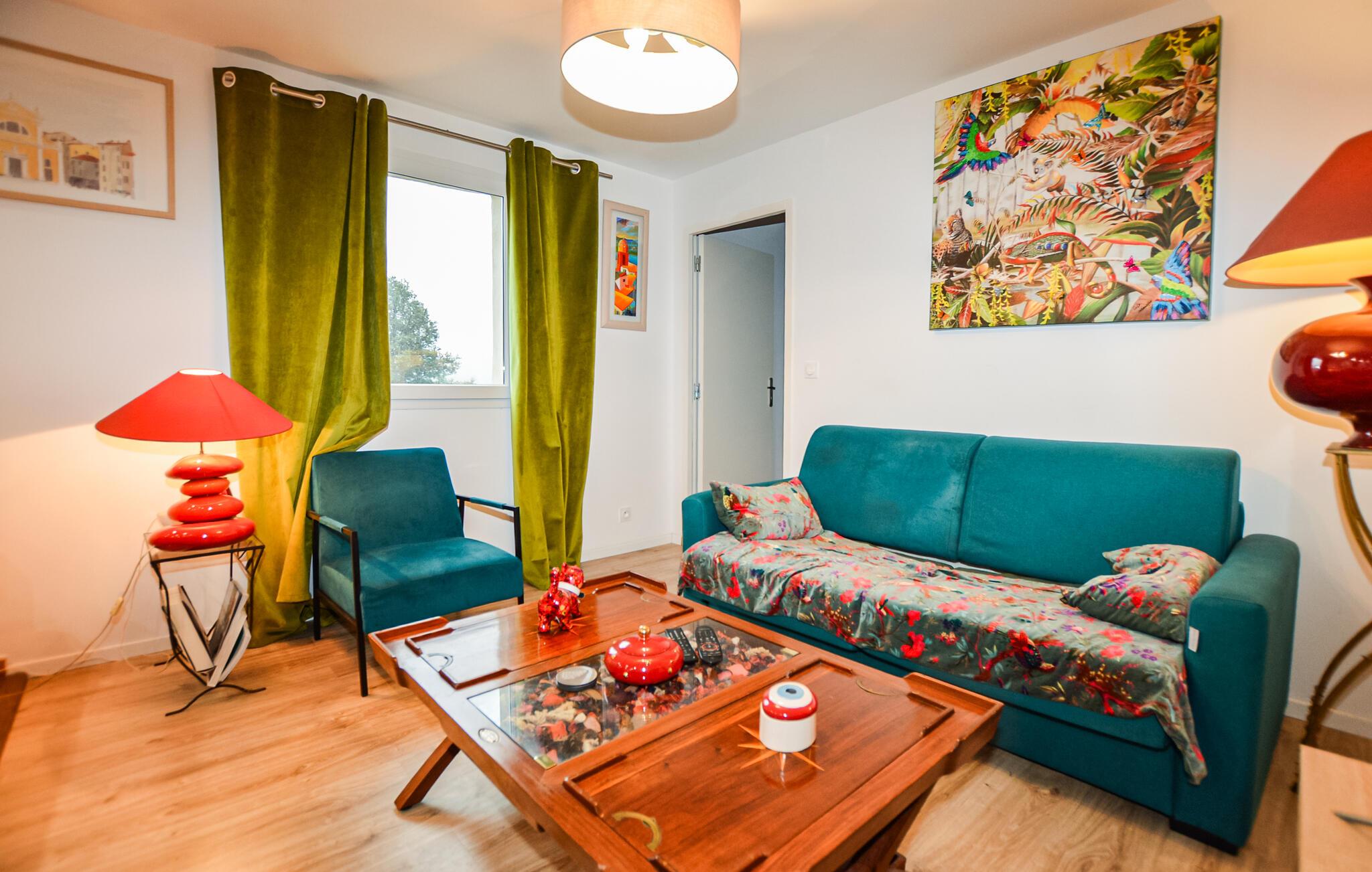 Føl deg som hjemme i de komfortable sofaene i stuen, og nyt den stilige kombinasjonen av treverk og fargerike detaljer. Bruk det vakre kjøkkenet med det romslige spisebordet til felles måltider. Planlegg dagene her og slapp av om kvelden med en film i stuen.