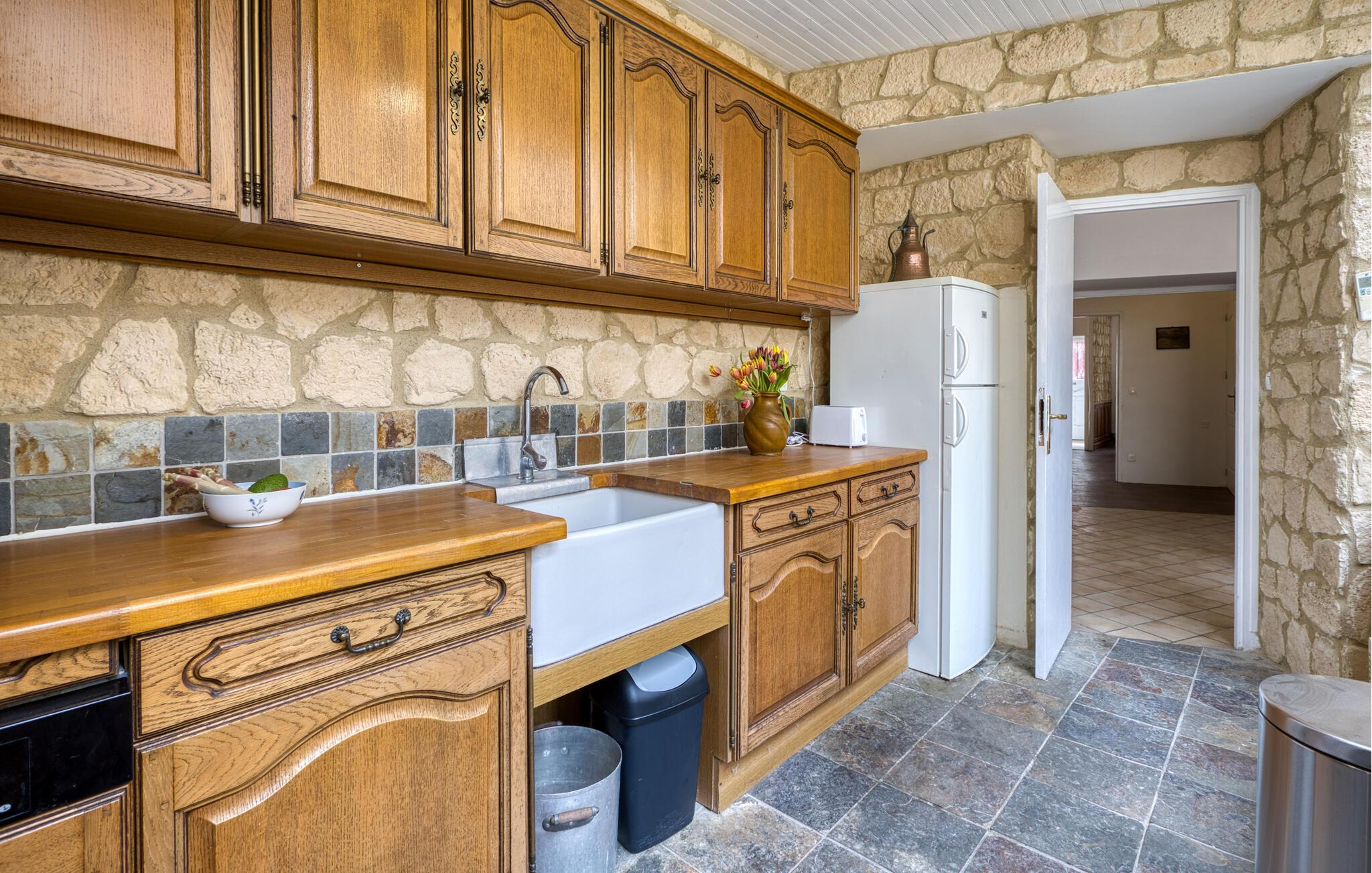 Dette natursteinhuset kombinerer rustikk sjarm med koselig komfort, og er et ideelt utgangspunkt for å utforske regionen. Føl deg som hjemme i de romslige stuene med mye karakter. Slapp av i den koselige sofaen ved peisen eller nyt rolige timer med en bok. Innredningen kombinerer klassiske elementer som tregulv, vegger i naturstein og stilfulle møbler. På kjøkkenet med sine solide trefronter er det en fornøyelse å lage mat, og spiseplassen gir plass til koselige måltider.