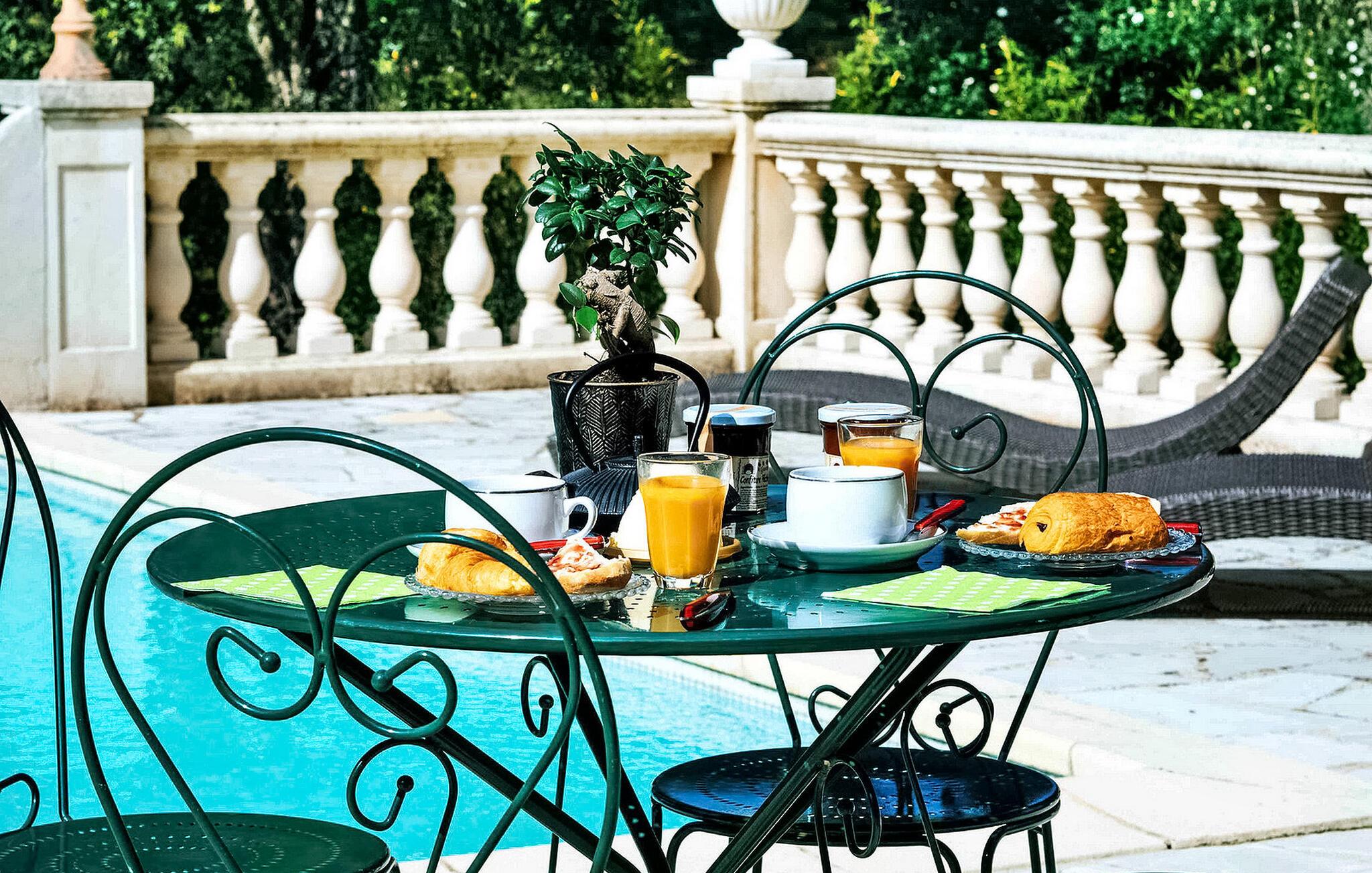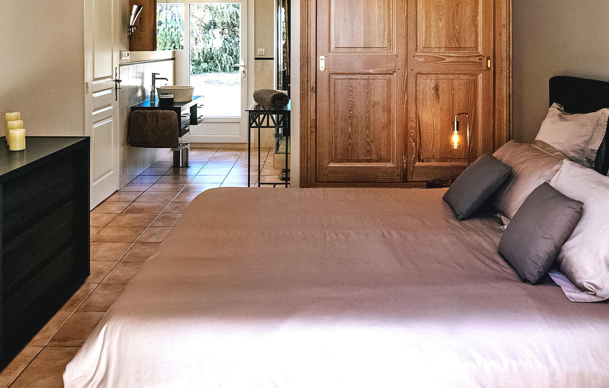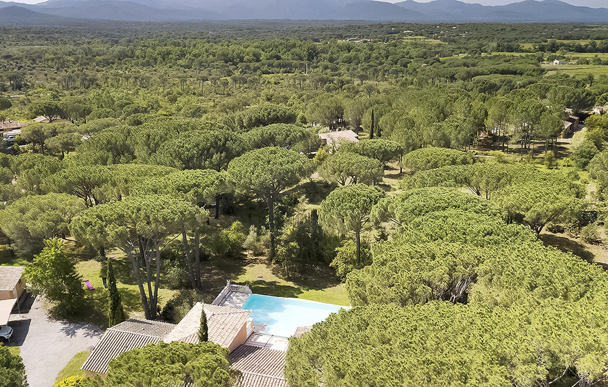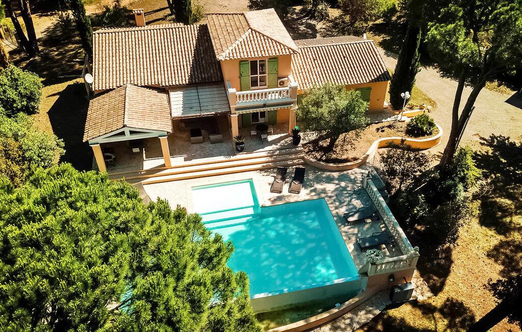 Flykt til en romslig ferievilla i hjertet av Massif des Maures. Dette tilfluktsstedet ligger i en furuskog ca. 4 km fra Vidauban sentrum, og tilbyr fredelige ferieomgivelser. Første etasje ønsker deg velkommen med en entré som fører til en romslig stue. Alle de fire soverommene utstråler luksus med stilfulle møbler, klimaanlegg og eget dusjrom. Utenfor er villaen omgitt av en fullt inngjerdet tomt. Midtpunktet er det imponerende oppvarmede evighetsbassenget (17 m x 7 m) med flat bunn og en dybde på 1,50 m. Her kan du kose deg med et spill på boulebanen eller slappe av på den store, delvis overbygde terrassen foran huset. Villaen, som er en ekte oase av fred, har en ideell beliggenhet i hjertet av Massif des Maures, 20 km fra Sainte-Maxime og strendene der og 40 km fra Saint-Tropez. Alle de lokale butikkene ligger i landsbyen Vidauban, 4 km unna. Golfbanen Prince of Provence ligger også ca. 4 km unna. Fordyp deg i roen i dette ferieparadiset med det store oppvarmede bassenget og de naturlige omgivelsene.