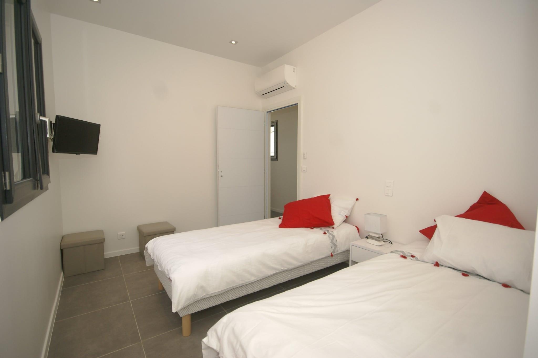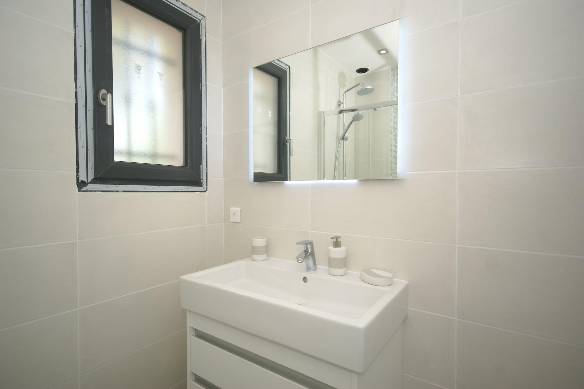 Første etasje: (åpent kjøkken(bar, komfyr(komfyr med 4 kokeplater), stekovn, mikrobølgeovn, oppvaskmaskin, kjøleskap med fryser, klimaanlegg), Stue/spisestue(TV, spisebord, klimaanlegg), soveværelse(2x enkeltseng, TV, klimaanlegg), soveværelse(dobbeltseng(160 x 200 cm), TV, klimaanlegg), bad(dusj, toalett), vaskerom(tørketrommel, vaskemaskin), toalett) garasje, terrasse(inngjerdet), hage, hagemøbler, grill, svømmebasseng(privat, oppvarmet, inngjerdet, 9 x 4 m., opened from May upto and including 1/2 Oct)