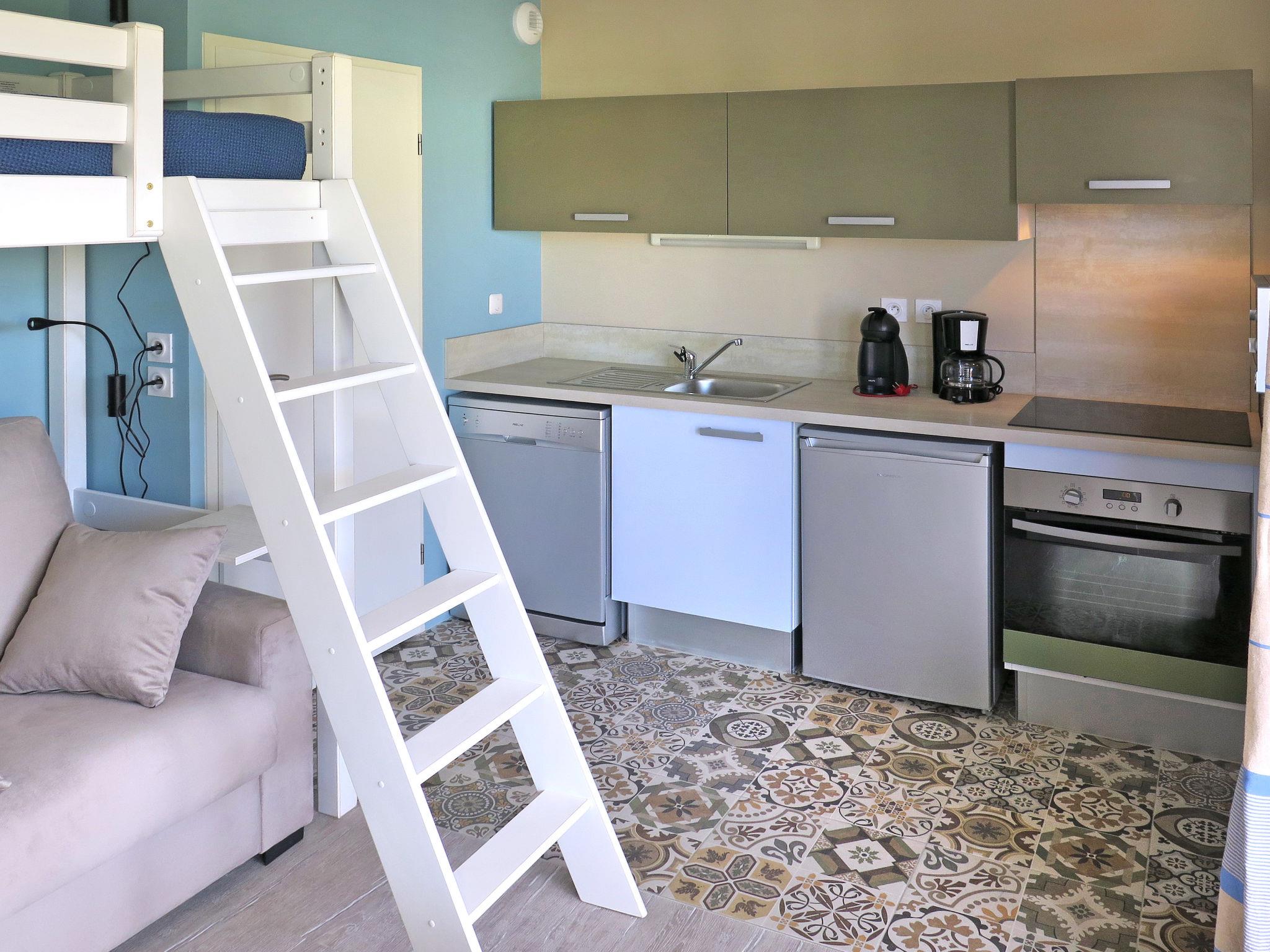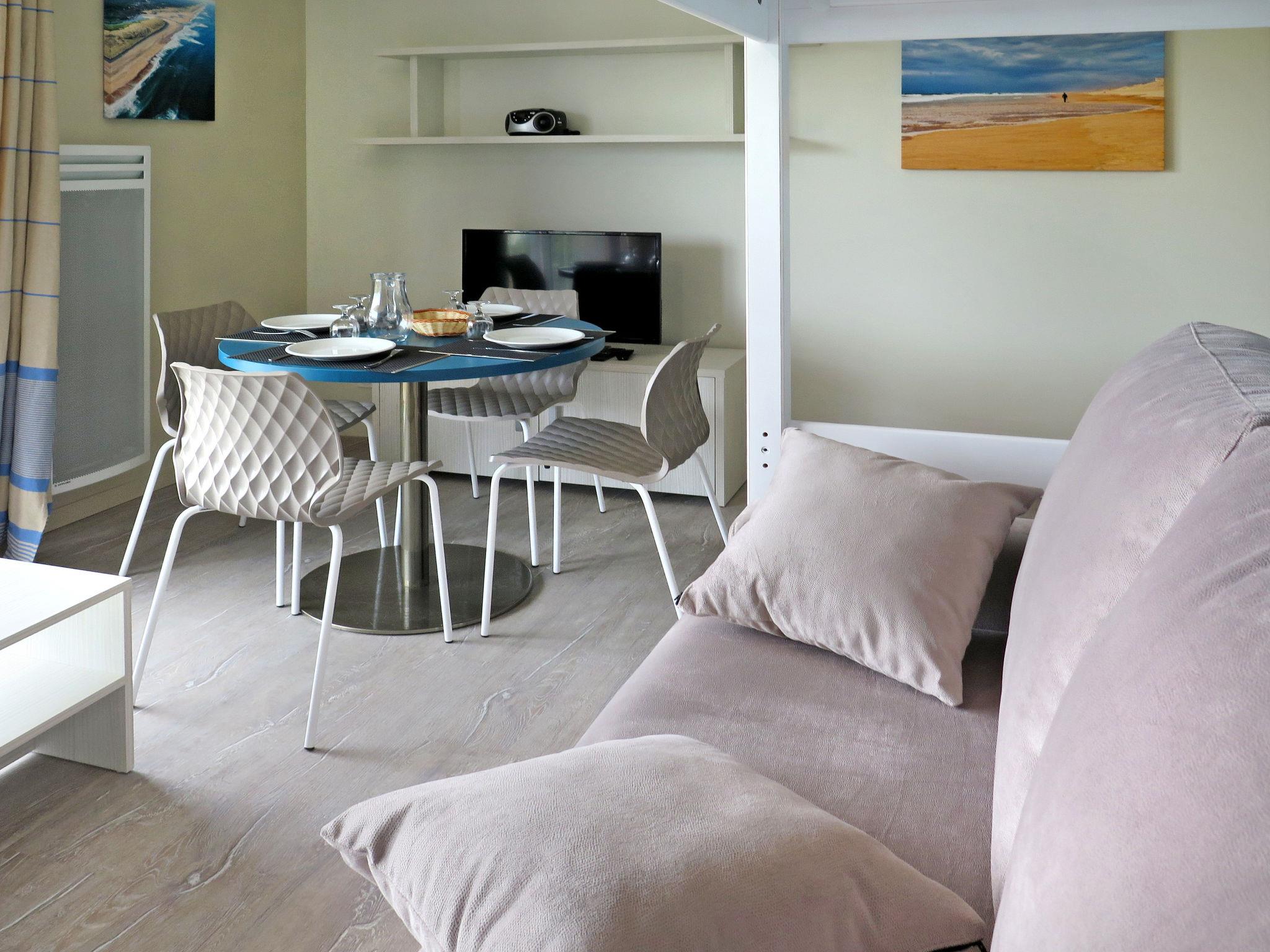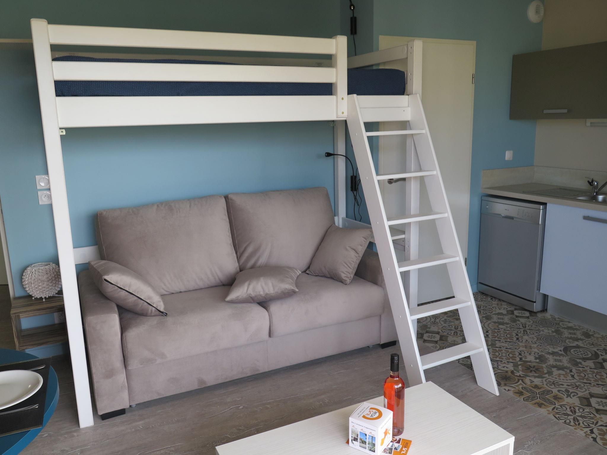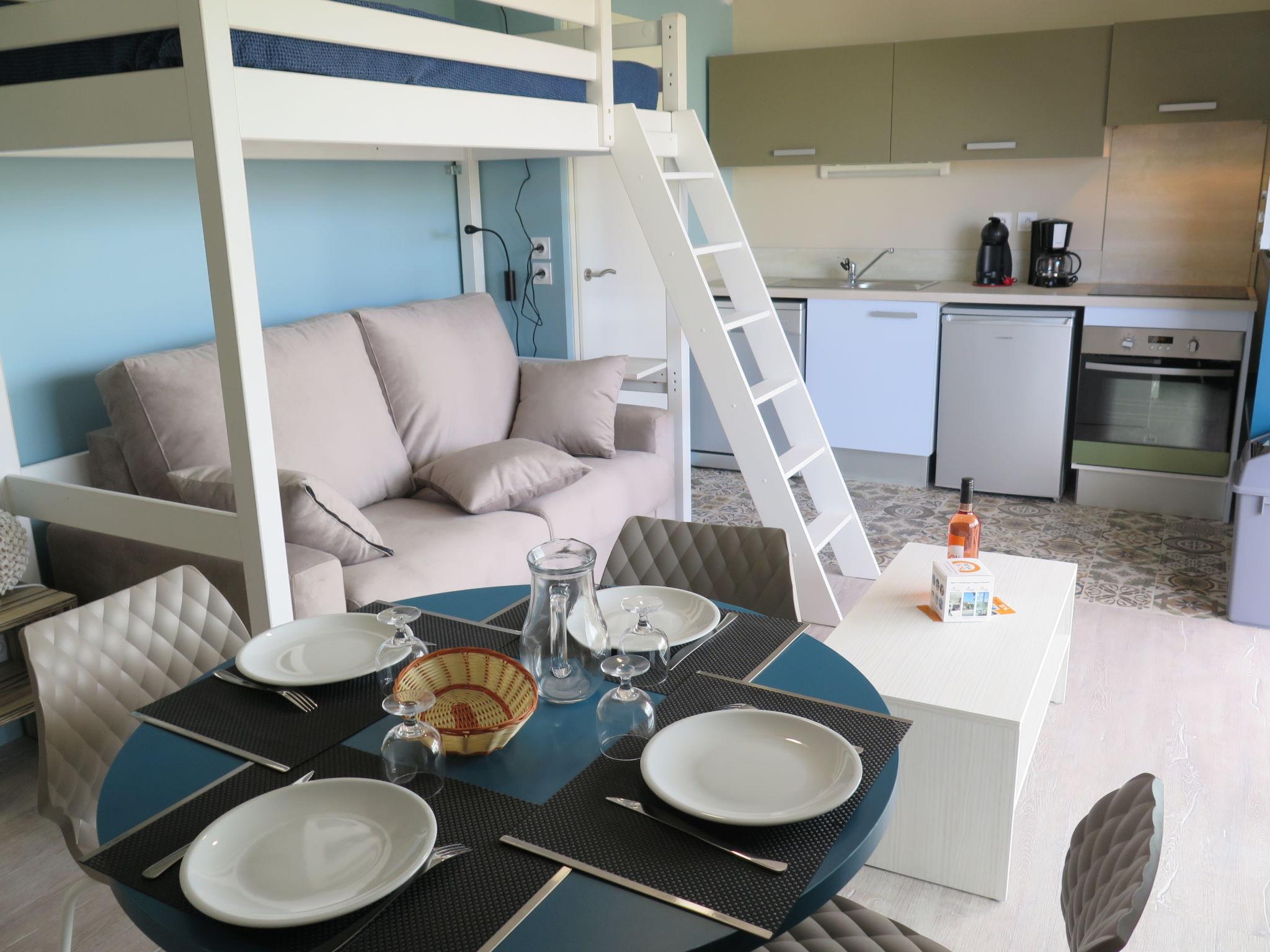 "Les Sables d’Or Studio", 1-room apartment 20 to 32 m2. Object suitable for 2 adults. Modern and cosy furnishings: living/sleeping room with 1 double sofabed and 1 x 1 bunk beds (90 cm), dining table, TV, radio, CD-player and DVD. Exit to the balcony, to the terrace. Open kitchen (oven, dishwasher, 4 ceramic glass hob hotplates, toaster, kettle, microwave, electric coffee machine, Capsules for coffee machine (Dolce Gusto) extra). Shower/WC. Electric heating. Balcony or terrace. Balcony furniture, deck chairs (2). Facilities: washing machine, iron, children's high chair, baby cot (extra), hair dryer. Internet (WiFi, free). Please note: smoke alarm.