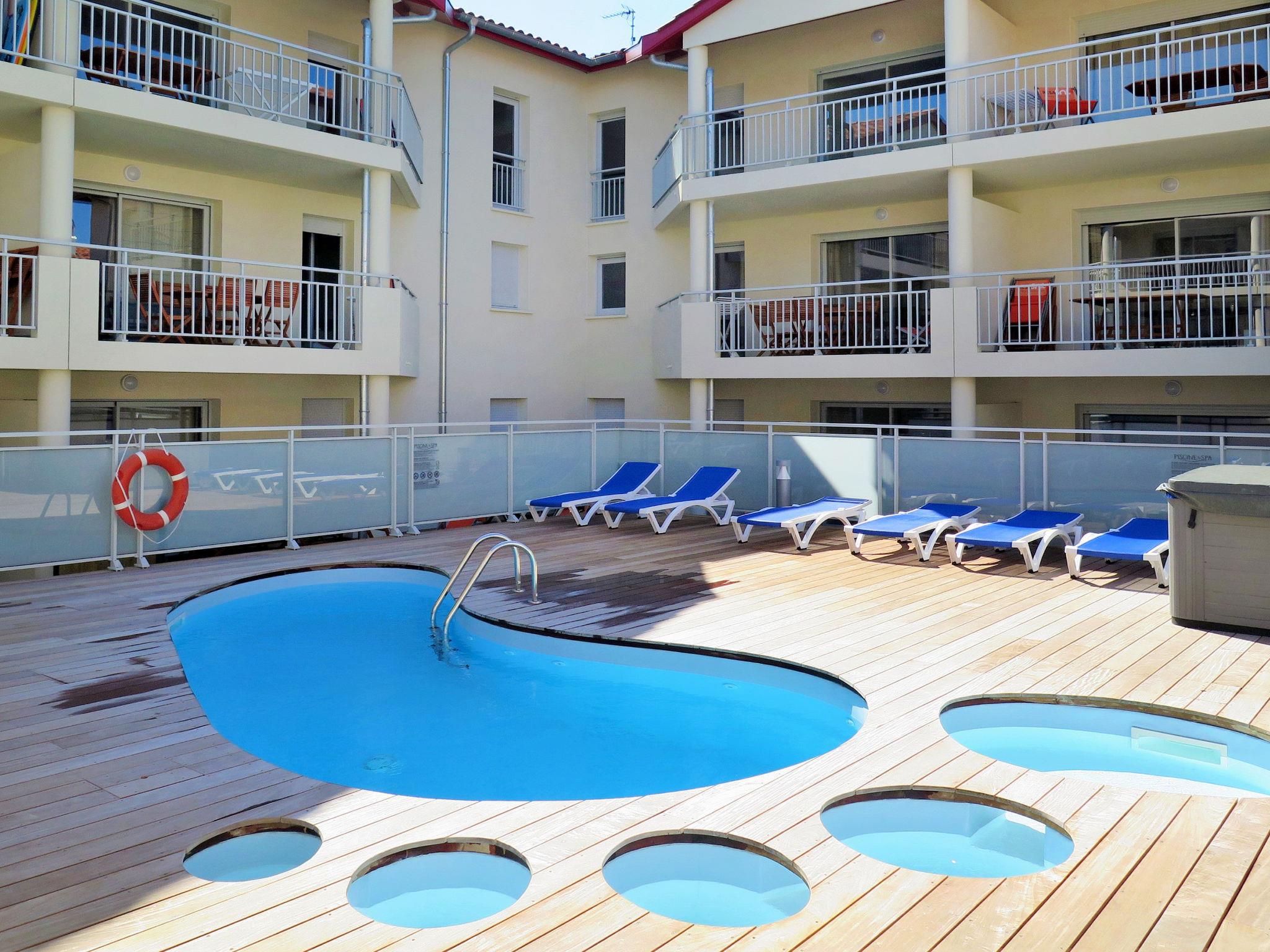 Residence "Les Sables d’Or", 3 storeys, built in 2016. 51 apartments in the residence. 900 m from the centre of Vieux-Boucau, 8.5 km from the centre of Soustons, 20 km from the centre of Capbreton, in a central position, 350 m from the sea. For shared use: swimming pool (16 m2, seasonal availability: 01.Apr. - 15.Sep.). Unconventional pool shape. Outdoor shower, hot tub. In the complex: fitness room, lift. Breakfast possible (extra). Communal covered parking, public parking on the road. Shop 50 m, supermarket 2 km, bus stop "Eglise (3)" 1.5 km, sandy beach 350 m, bathing lake "Lac Marin de Port d'Albret" 1 km. Golf course (18 hole) 9 km, tennis 750 m. The owner does not accept any youth groups. Please note: the photograph shows a typical example. The holiday properties may differ in living space, floorplan, equipment and furnishing.